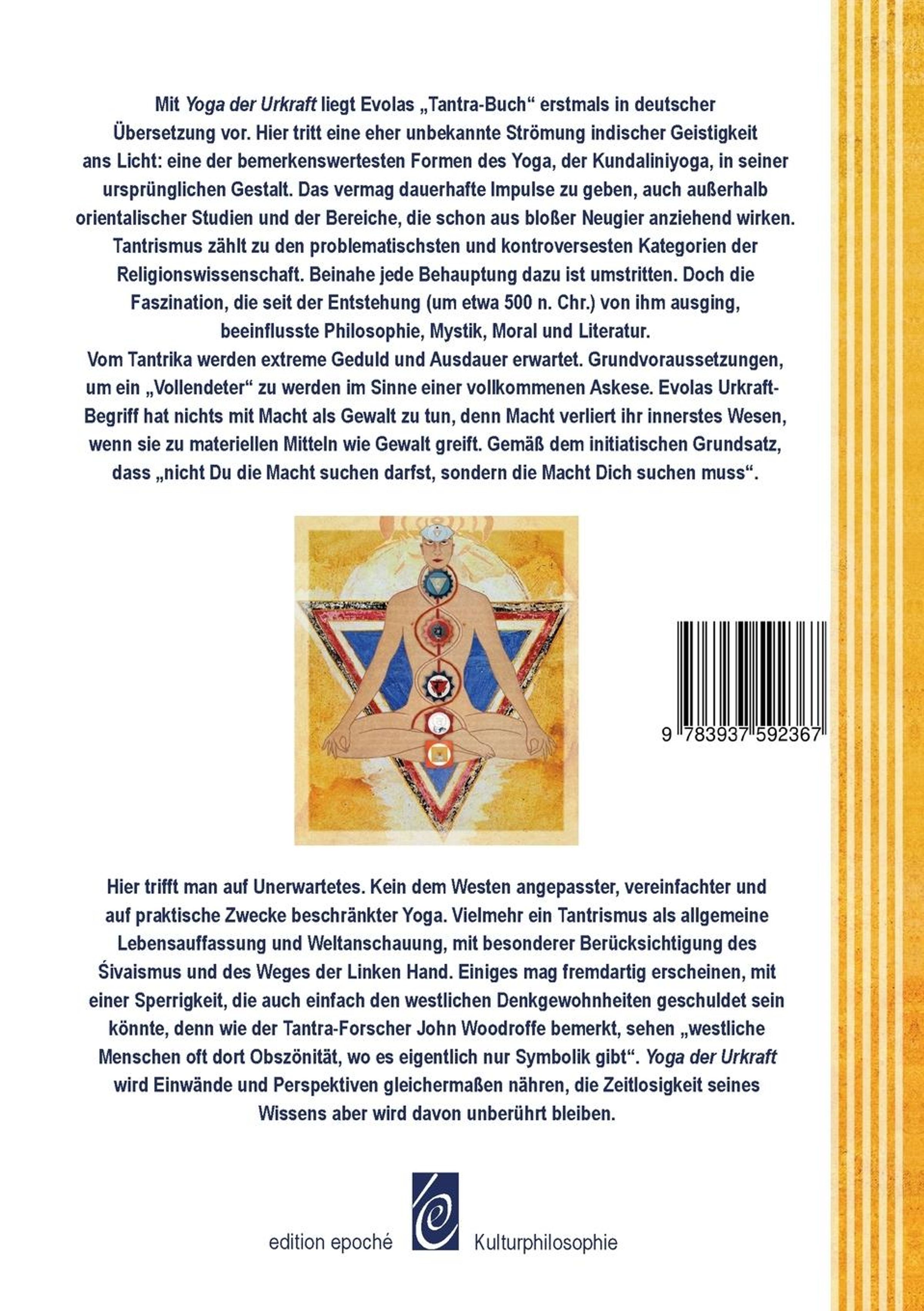 Mit "Der Yoga der Urkraft" liegt Evolas "Tantra-Buch" erstmals in deutscher Übersetzung vor. Es offenbart eine eher unbekannte Strömung indischer Geistigkeit: eine der bemerkenswertesten Formen des Yoga, den Kundaliniyoga, in seiner ursprünglichen Gestalt. Das vermag dauerhafte Impulse zu geben, auch außerhalb orientalischer Studien und außerhalb der Bereiche, die schon aus bloßer Neugier anziehend wirken. Tantrismus zählt zu den problematischsten und kontroversesten Kategorien der Religionswissenschaft. Beinahe jede Behauptung darüber ist umstritten. Doch die Faszination, die seit der Entstehung (um etwa 500 n. Chr.) davon ausging, beeinflusste Philosophie, Mystik, Moral und Literatur. Vom Tantrika werden extreme Geduld und Ausdauer als Grundvoraussetzungen erwartet, um ein "Vollendeter" zu werden, im Sinne einer vollkommenen Askese. Evolas Urkraft-Begriff hat nichts mit Macht als Gewalt zu tun, denn Macht verliert ihr innerstes Wesen, wenn sie zu materiellen Mitteln wie Gewalt greift. Gemäß dem initiatischen Grundsatz, dass "nicht Du die Macht suchen darfst, sondern die Macht Dich suchen muss". Hier stößt man auf Unerwartetes. Es ist kein dem Westen angepasster, vereinfachter und auf praktische Zwecke beschränkter Yoga. Vielmehr ein Tantrismus als allgemeine Lebensauffassung und Weltanschauung, mit besonderer Berücksichtigung des Sivaismus und des Weges der Linken Hand. Einiges mag fremdartig erscheinen, mit einer Sperrigkeit, die auch einfach den westlichen Denkgewohnheiten geschuldet sein könnte, denn wie der Tantra-Forscher John Woodroffe bemerkt, sehen "westliche Menschen oft dort Obszönität, wo es eigentlich nur Symbolik gibt". Evolas "Yoga der Urkraft" wird Einwände und Perspektiven gleichermaßen nähren, die Zeitlosigkeit seines Wissens aber wird davon unberührt bleiben.