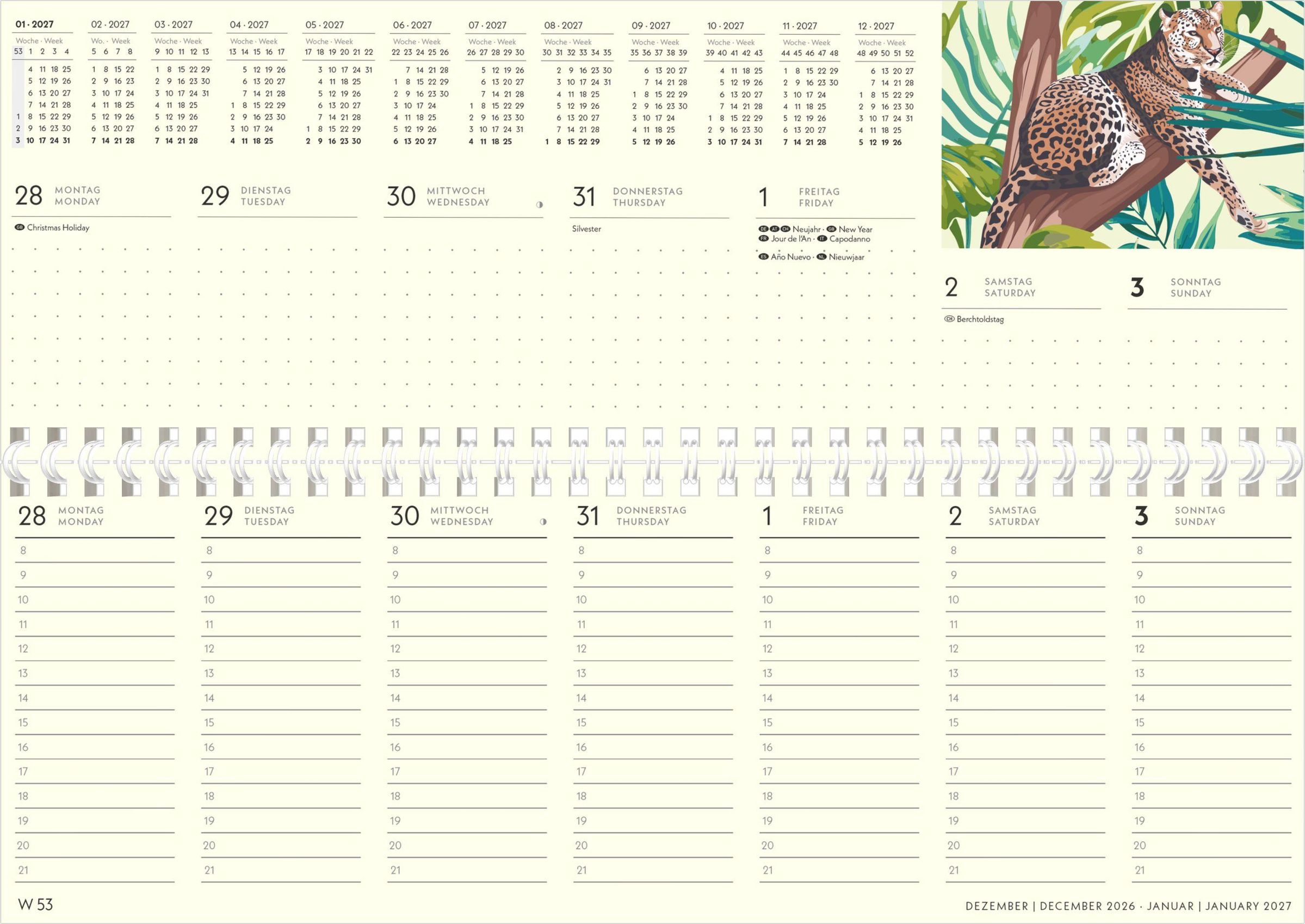 Mit dem Tischquerkalender Jungle 2027 behalten Sie nicht nur Ihre Termine bestens im Blick, sondern holen sich auch ein Stück Naturverbundenheit ins Büro.