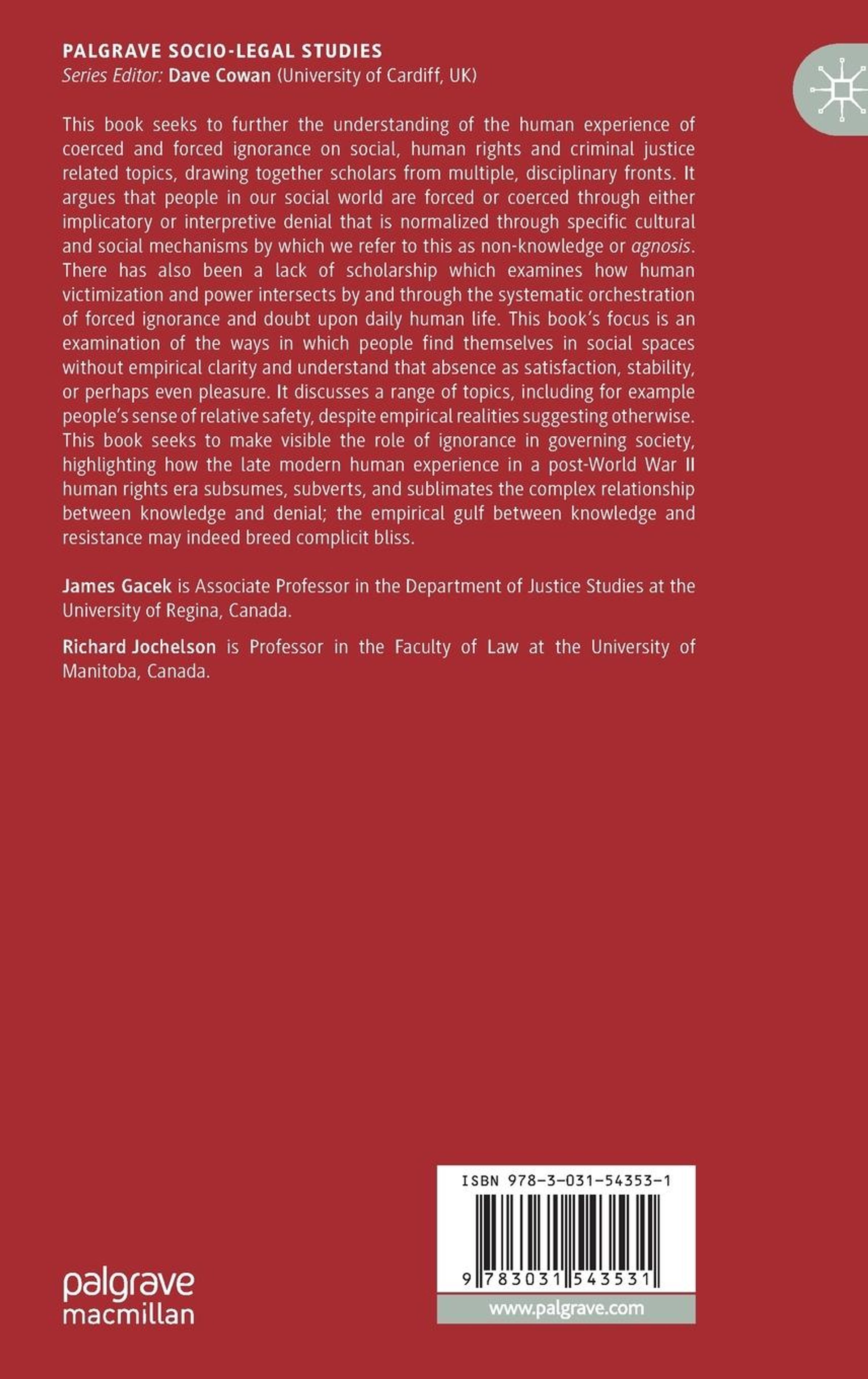 This book seeks to further the understanding of the human experience of coerced and forced ignorance on social, human rights and criminal justice related topics, drawing together scholars from multiple, disciplinary fronts. It argues that people in our social world are forced or coerced through either implicatory or interpretive denial that is normalized through specific cultural and social mechanisms by which we refer to this as non-knowledge or agnosis. There has also been a lack of scholarship which examines how human victimization and power intersects by and through the systematic orchestration of forced ignorance and doubt upon daily human life. This book's focus is an examination of the ways in which people find themselves in social spaces without empirical clarity and understand that absence as satisfaction, stability, or perhaps even pleasure. It discusses a range of topics, including for example people's sense of relative safety, despite empirical realities suggesting otherwise. This book seeks to make visible the role of ignorance in governing society, highlighting how the late modern human experience in a post-World War II human rights era subsumes, subverts, and sublimates the complex relationship between knowledge and denial; the empirical gulf between knowledge and resistance may indeed breed complicit bliss.