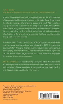The Historical Dictionary of Singapore relates this history of this country through a chronology, an introductory essay, an expansive bibliography, and over 500 cross-referenced dictionary entries on significant persons, events, places, organizations, and other aspects of Singapore history from the earliest times to the present.
