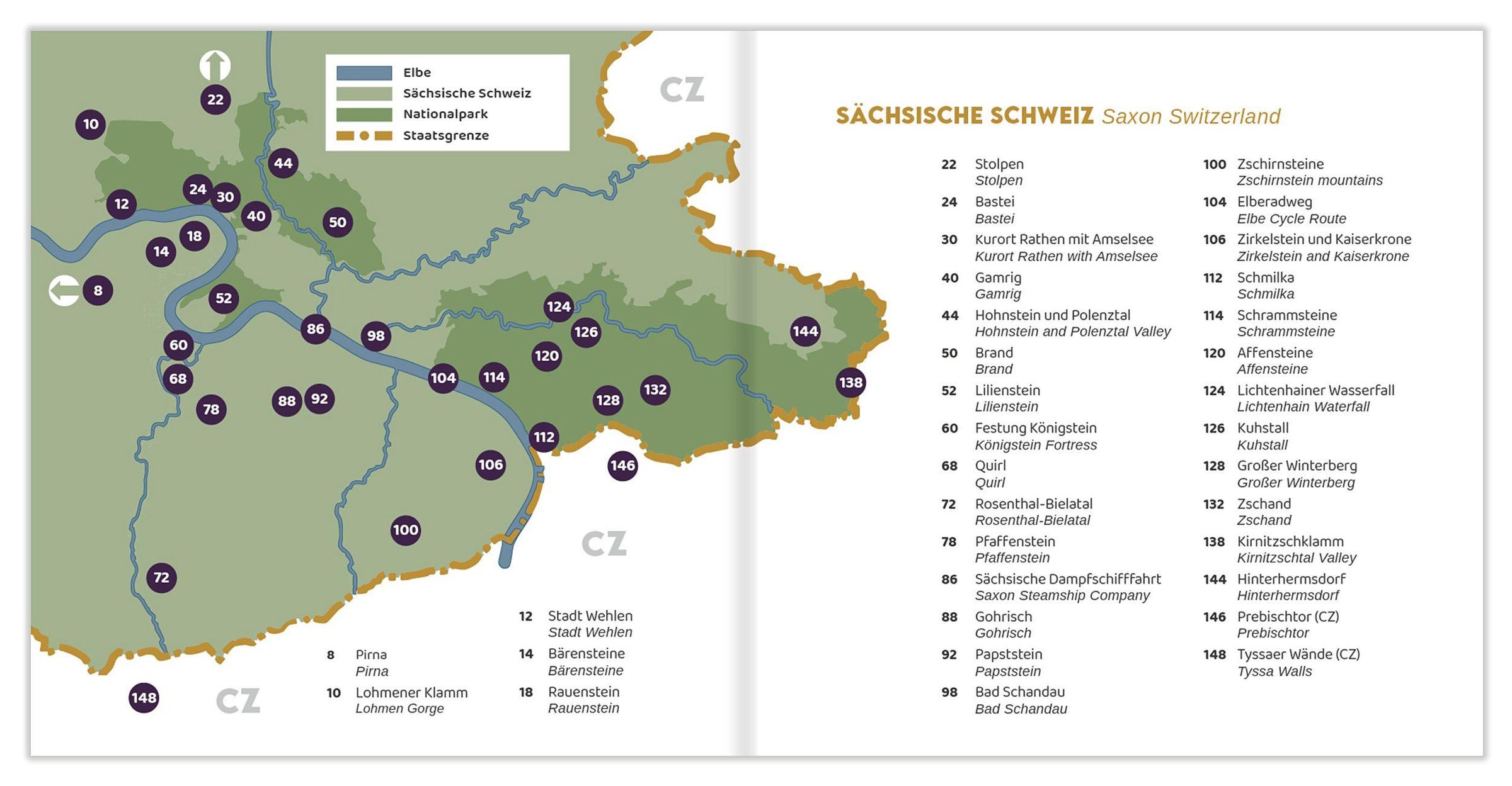 Inhalt: Pirna, Lohmener Klamm, Stadt Wehlen, Großer und Kleiner Bärenstein, Rauenstein, Stolpen, Bastei mit Basteibrücke, Kurort Rathen, Amselsee, Gamrig, Hohnstein, Polenztal, Brand, Lilienstein, Festung Königstein, Quirl, Rosenthal-Bielatal, Pfaffenstein, Sächsische Dampfschifffahrt, Gohrisch, Papststein, Bad Schandau, Zschirnsteine, Elberadweg, Zirkelstein, Kaiserkrone, Schmilka, Schrammsteine, Affensteine, Lichtenhainer Wasserfall, Kuhstall, Großer Winterberg, Zschand, Kirnitzschklamm, Hinterhermsdorf, Prebischtor (CZ), Tyssaer Wände (CZ)