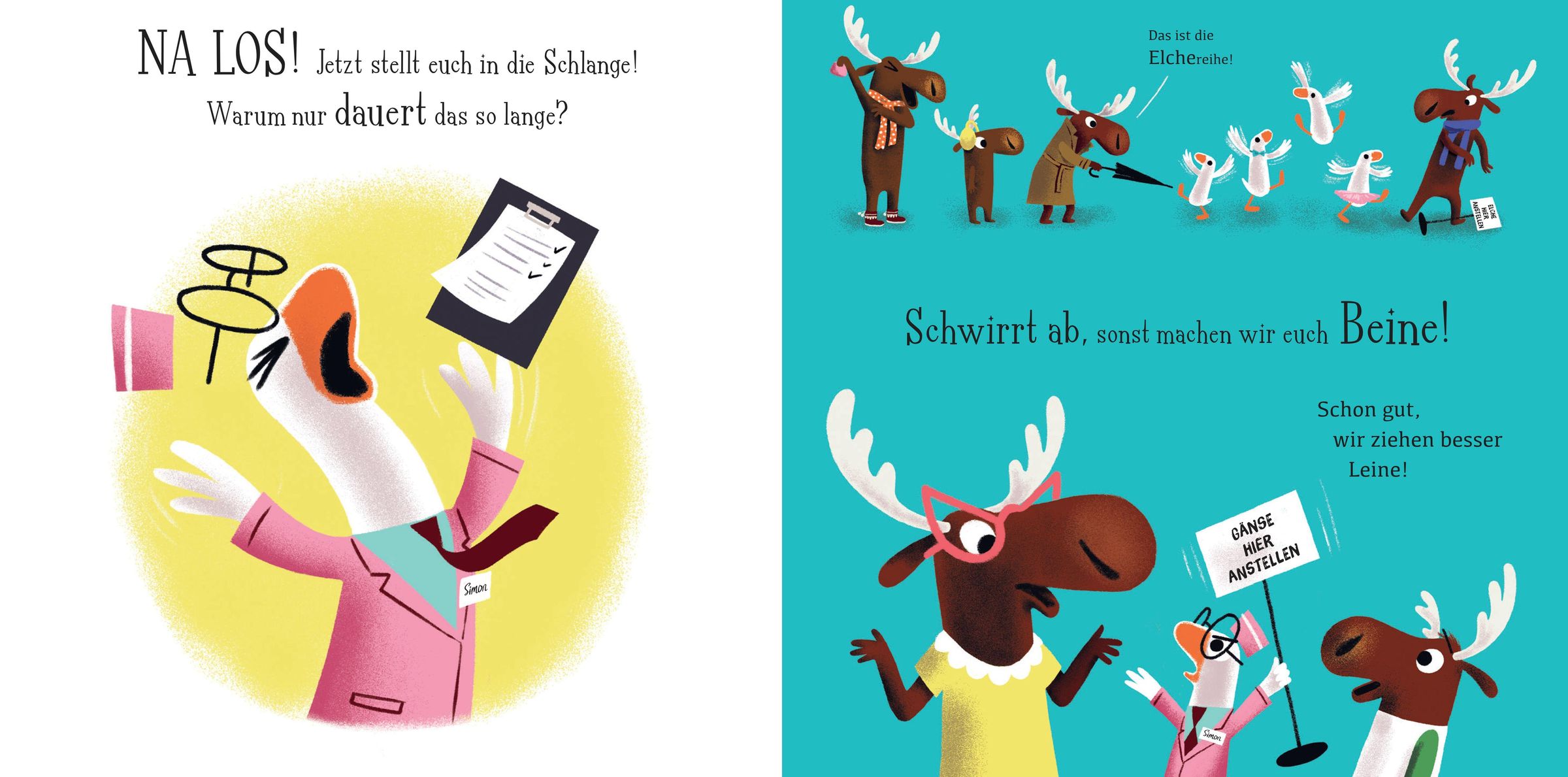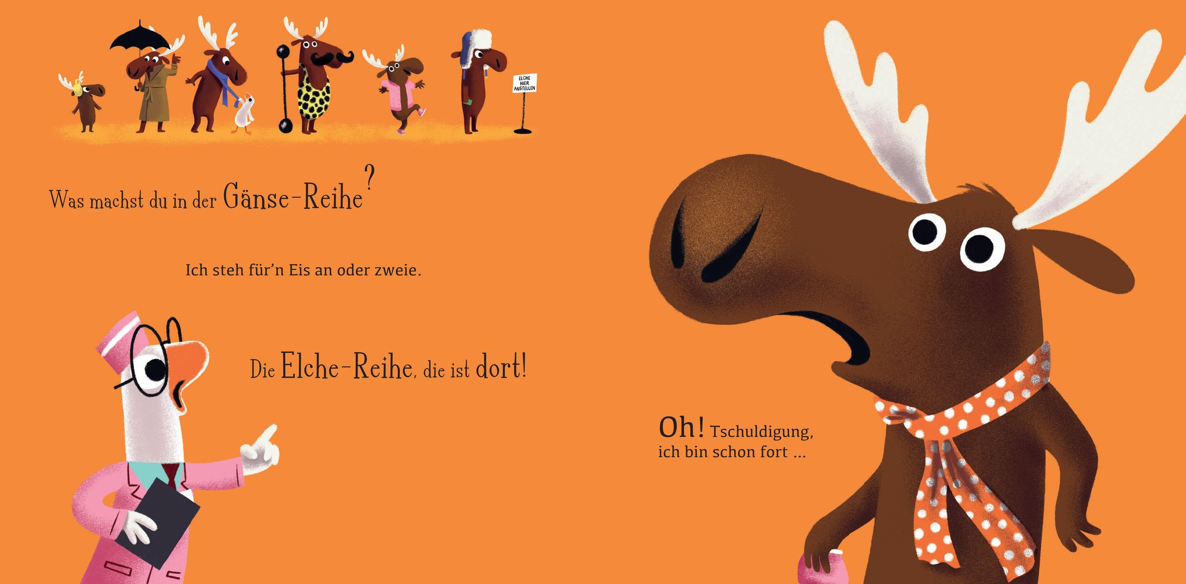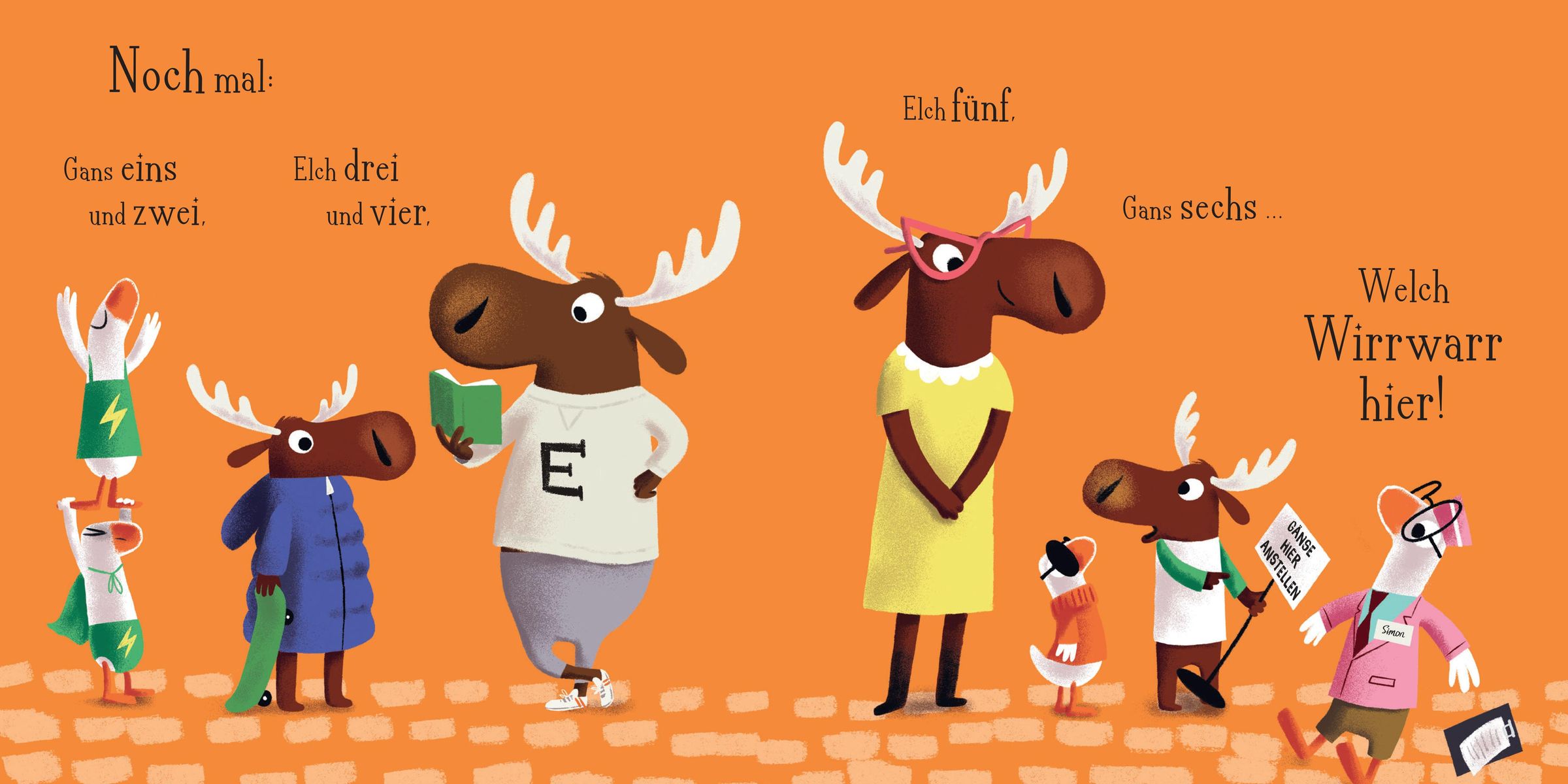 An einem heißen Sommertag wollen alle nur eins: ein Eis! Die Gänse stellen sich brav an, und der kleine Gänse-Eisverkäufer zählt gewissenhaft durch: Gans eins, Gans zwei ... Elch drei?! Moment mal - ein Elch in der Gänsereihe? Unerhört! So beginnt ein herrlich turbulenter Zählspaß mit jeder Menge tierischem Durcheinander. Als dann auch noch eine Maus auftaucht, ist das Chaos komplett!