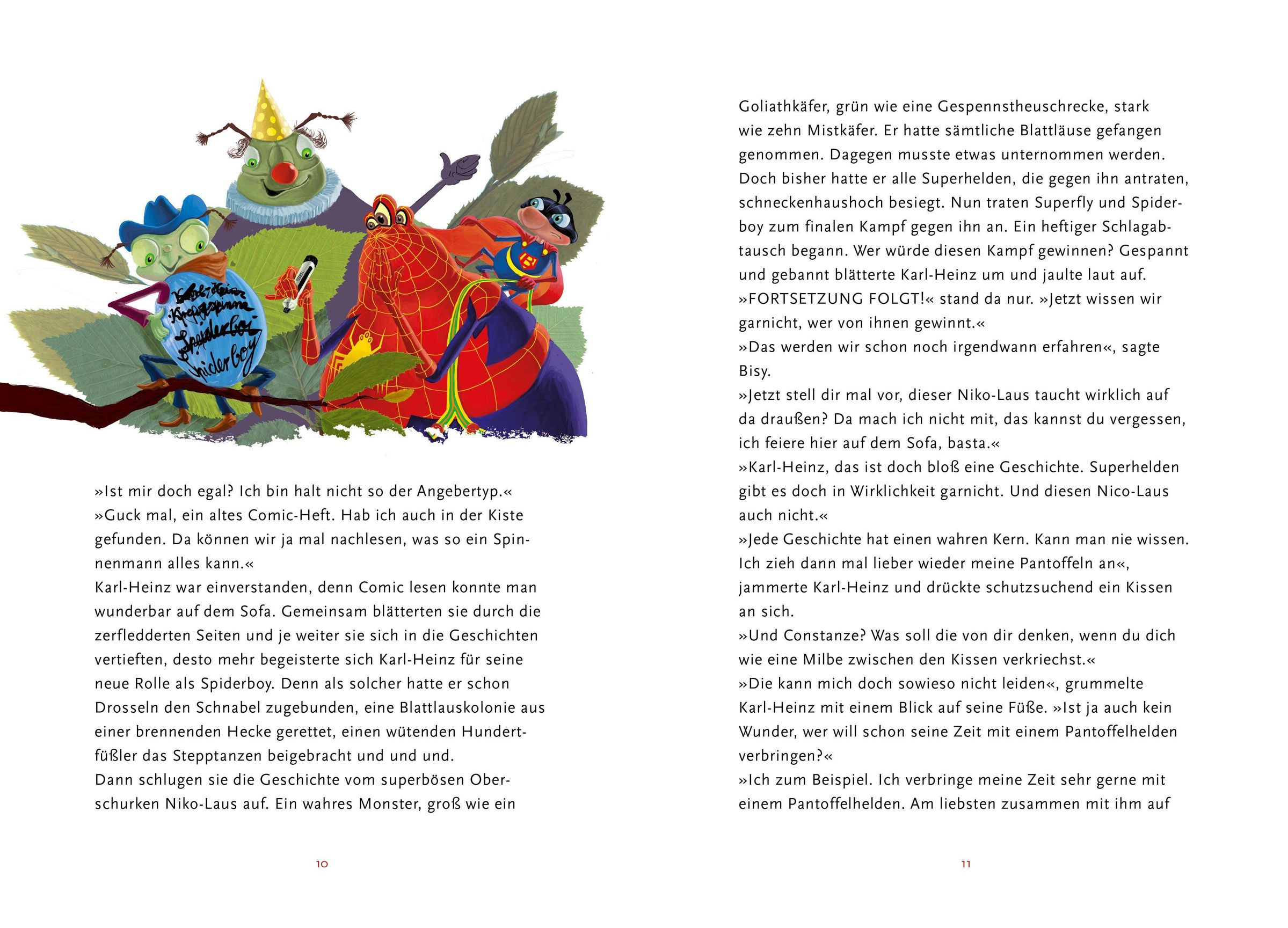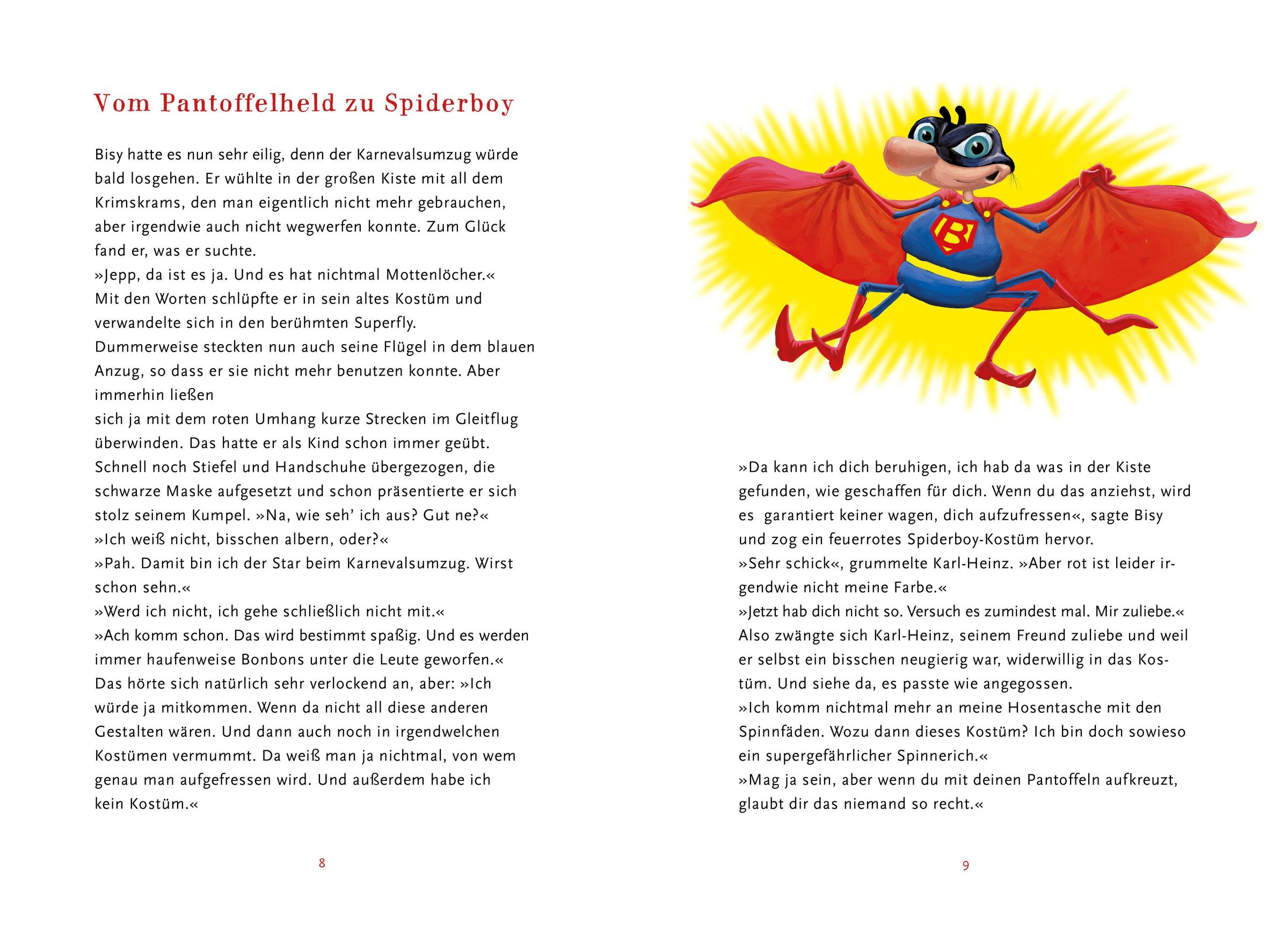 Karneval in der Buchenhecke! Während Bisy sich mit Feuereifer als Superfly verkleidet, schlüpft Karl-Heinz widerwillig in sein Spiderboy-Kostüm. So stürzen sie sich ins bunte Treiben. Als beim Umzug plötzlich der grausige Nico-Laus den gütigen Karnevalsprinzen Theobald Grünwanst und die Karnevalsprinzessin Constanze entführt, sind die Jecken entsetzt. Nico-Laus fordert die Herrschaft über alle Gärten. Und jetzt sind ausgerechnet Bisy und Karl-Heinz gefragt: Sie sollen die Entführten befreien und Nico-Laus das Handwerk legen! Bei ihrer Suche geraten sie in ein rätselhaftes Karnevalsland. Darin: lauter Möchtegern-Superhelden, die mit ihrer Superkraft protzen und in Wettkämpfen beweisen wollen, dass sie Theobald und Constanze viel besser und schneller retten können als Bisy und Karl-Heinz. Aber ist das wirklich so oder braucht es dafür keine Superhelden, sondern nur Mut und geballte Krabbeltier-Stärke?