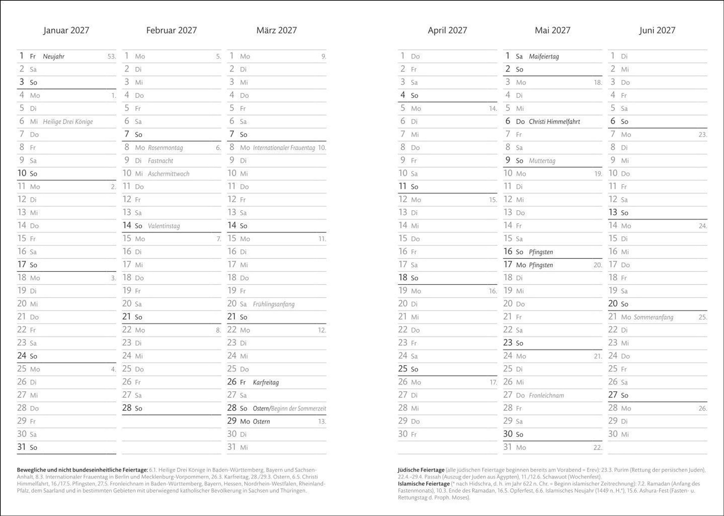 Klein und praktisch: Taschenkalender im DIN A6-Format mit einer Doppelseite Platz pro Woche und Lesebändchen