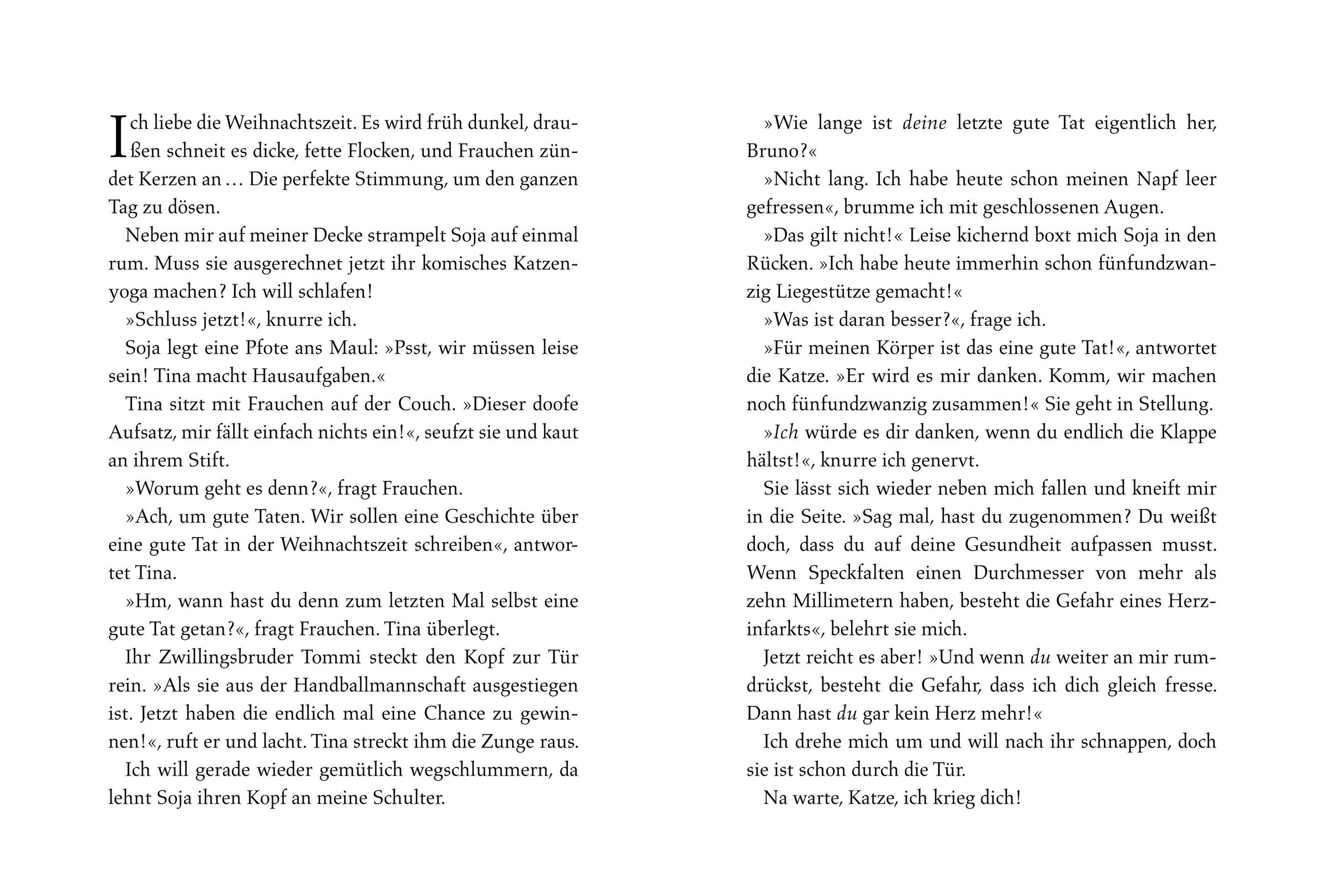 Als Katzendame Soja erfährt, dass im Tierheim noch viele Tiere auf ein neues Zuhause warten, ist sie entsetzt - es ist doch bald Weihnachten! Sofort ist klar: Da muss sie helfen! Gemeinsam mit ihrem gemütlichen Hunde-Freund Bruno macht sie sich auf die Suche nach den perfekten Familien für die einsamen Tiere. Doch das ist gar nicht so einfach: Wo passt ein Minischwein am besten hin? Und wo fühlt sich das Chamäleon bloß wohl? Die ersten Versuche gehen ganz schön schief. Aber Soja und Bruno geben nicht auf - wäre doch gelacht, wenn nicht jedes Tier bis Heiligabend ein neues Zuhause hat!