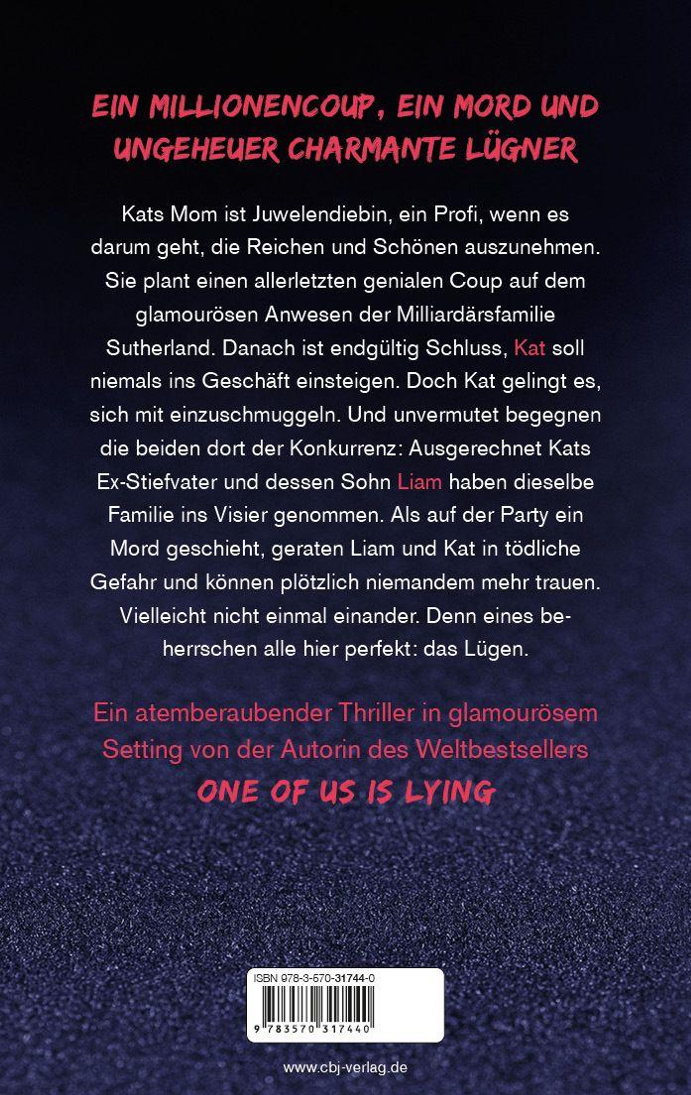 Kats Mom ist Juwelendiebin, ein Profi, wenn es darum geht, die Reichen und Schönen auszunehmen. Sie plant einen allerletzten genialen Coup auf dem glamourösen Anwesen der Milliardärsfamilie Sutherland. Danach ist endgültig Schluss, Kat soll niemals ins Geschäft einsteigen. Doch Kat gelingt es, sich mit einzuschmuggeln. Und unvermutet begegnen die beiden dort der Konkurrenz: Ausgerechnet Kats Ex-Stiefvater und dessen Sohn Liam haben dieselbe Familie ins Visier genommen. Als auf der Party ein Mord geschieht, geraten Liam und Kat in tödliche Gefahr und können plötzlich niemandem mehr trauen. Vielleicht nicht einmal einander. Denn eines beherrschen alle hier perfekt, nämlich das Lügen.