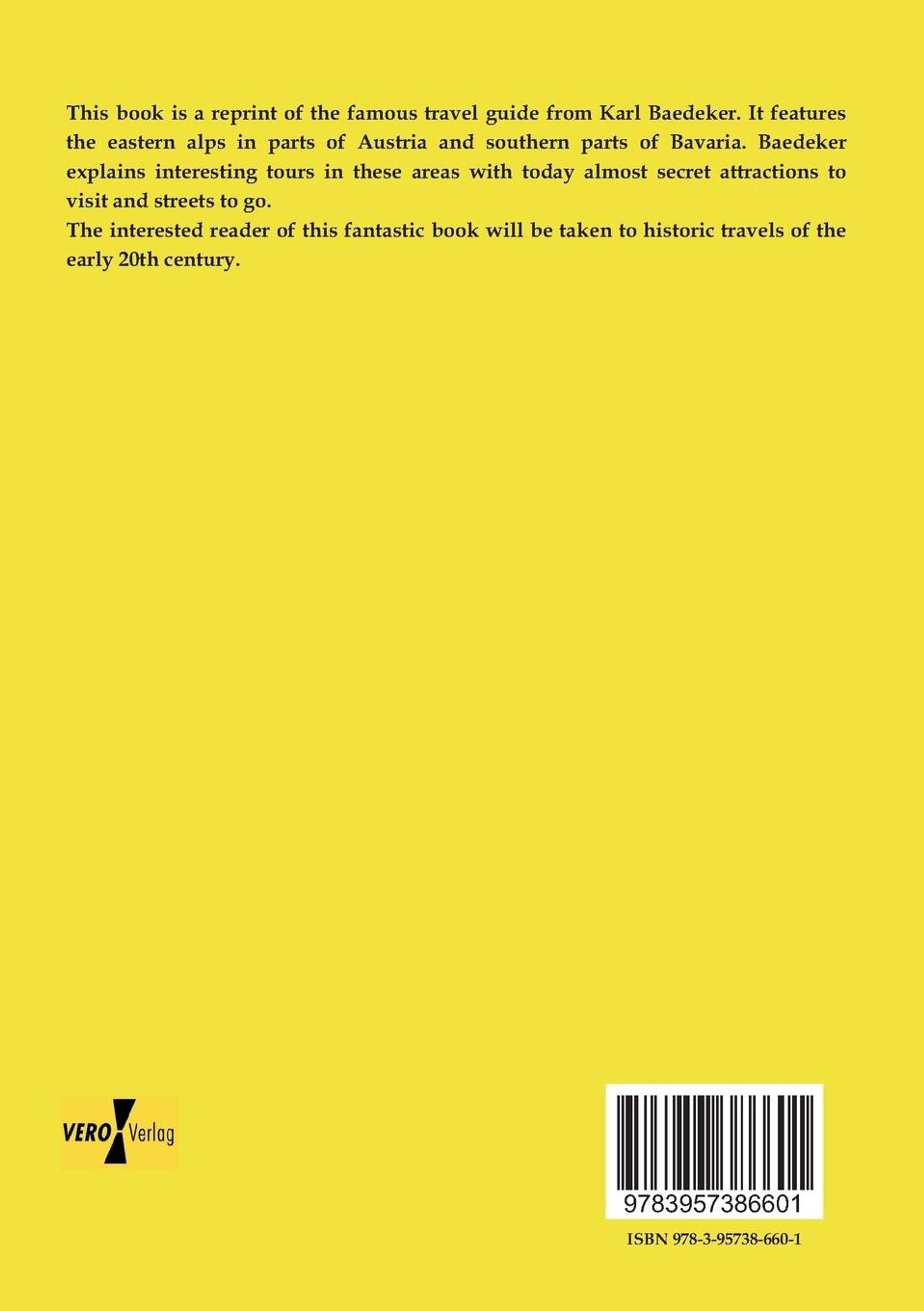 This book is a reprint of the famous travel guide from Karl Baedeker. It features the eastern alps in parts of Austria and southern parts of Bavaria. Baedeker explains interesting tours in these areas with today almost secret attractions to visit and streets to go. The interested reader of this fantastic book will be taken to historic travels of the early 20th century.