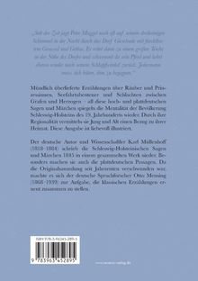 Seit der Zeit jagt Peter Muggel noch oft auf seinem dreibeinigen Schimmel in der Nacht durch das Dorf Gieselrade mit furchtbarem Gerassel und Getöse. Er reitet dann zu einem großen Teiche in der Nähe des Dorfes und schwemmt da sein Pferd und kehrt ebenso wieder nach seinem Schlupfwinkel zurück. Jedermann muss sich hüten, ihm zu begegnen. Mündlich überlieferte Erzählungen über Räuber und Prinzessinnen, Seefahrtabenteuer und Schlachten zwischen Grafen und Herzogen all diese hoch- und plattdeutschen Sagen und Märchen spiegeln die Mentalität der Bevölkerung Schleswig-Holsteins des 19. Jahrhunderts wieder. Durch ihre Regionalität vermitteln sie Jung und Alt einen Bezug zu ihrer Heimat. Diese Ausgabe ist liebevoll illustriert. Der deutsche Autor und Wissenschaftler Karl Müllenhoff (18181884) schrieb die Schleswig-Holsteinischen Sagen und Märchen 1845 in einem gesammelten Werk nieder. Besonders machen sie auch die plattdeutschen Passagen. Da die Originalsammlung seit Jahrzenten verschwunden war, machte es sich der deutsche Sprachforscher Otto Mensing (18681939) zur Aufgabe, die klassischen Erzählungen erneut zusammen zu stellen.