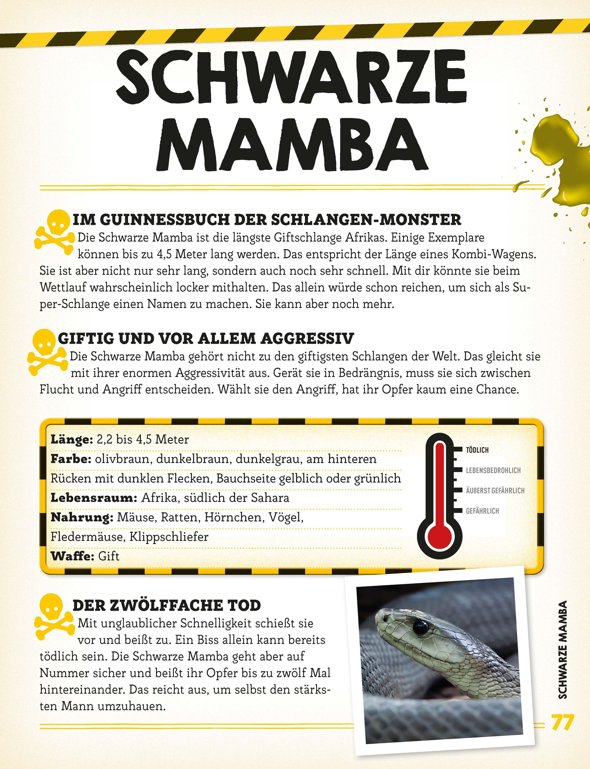 - Sensationelle Fotos: Auf zum Teil ganzseitigen Fotos wirken diese besonderen Tiere noch imposanter. Die erstaunlichen Tierfakten gibt's auf einen Blick und lassen Kinder in die spannende Welt der gefährlichsten Tiere abtauchen.