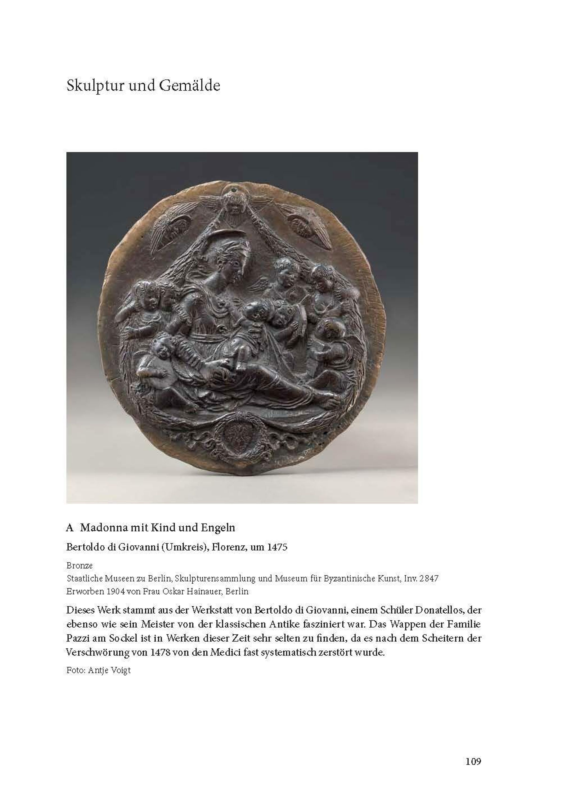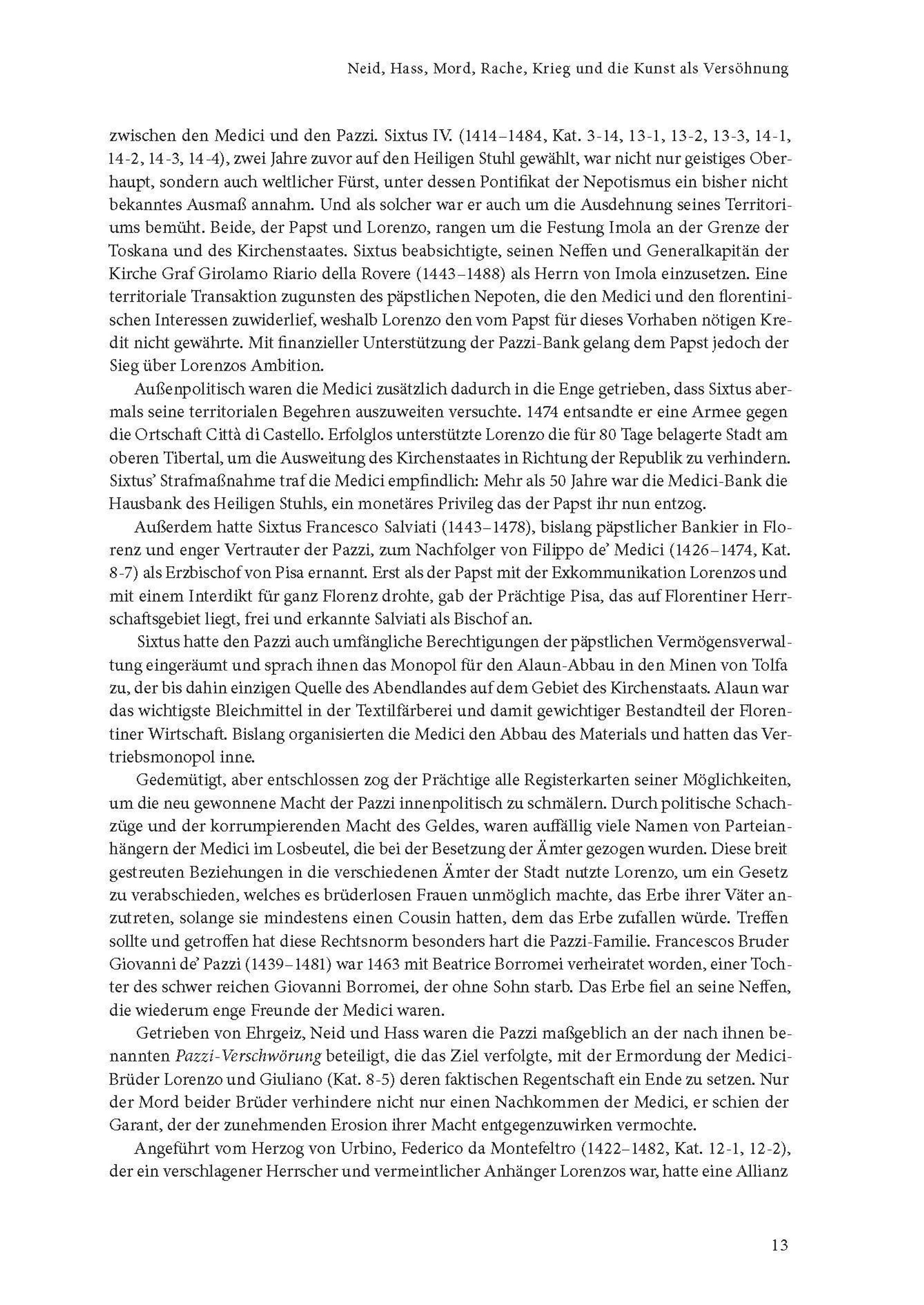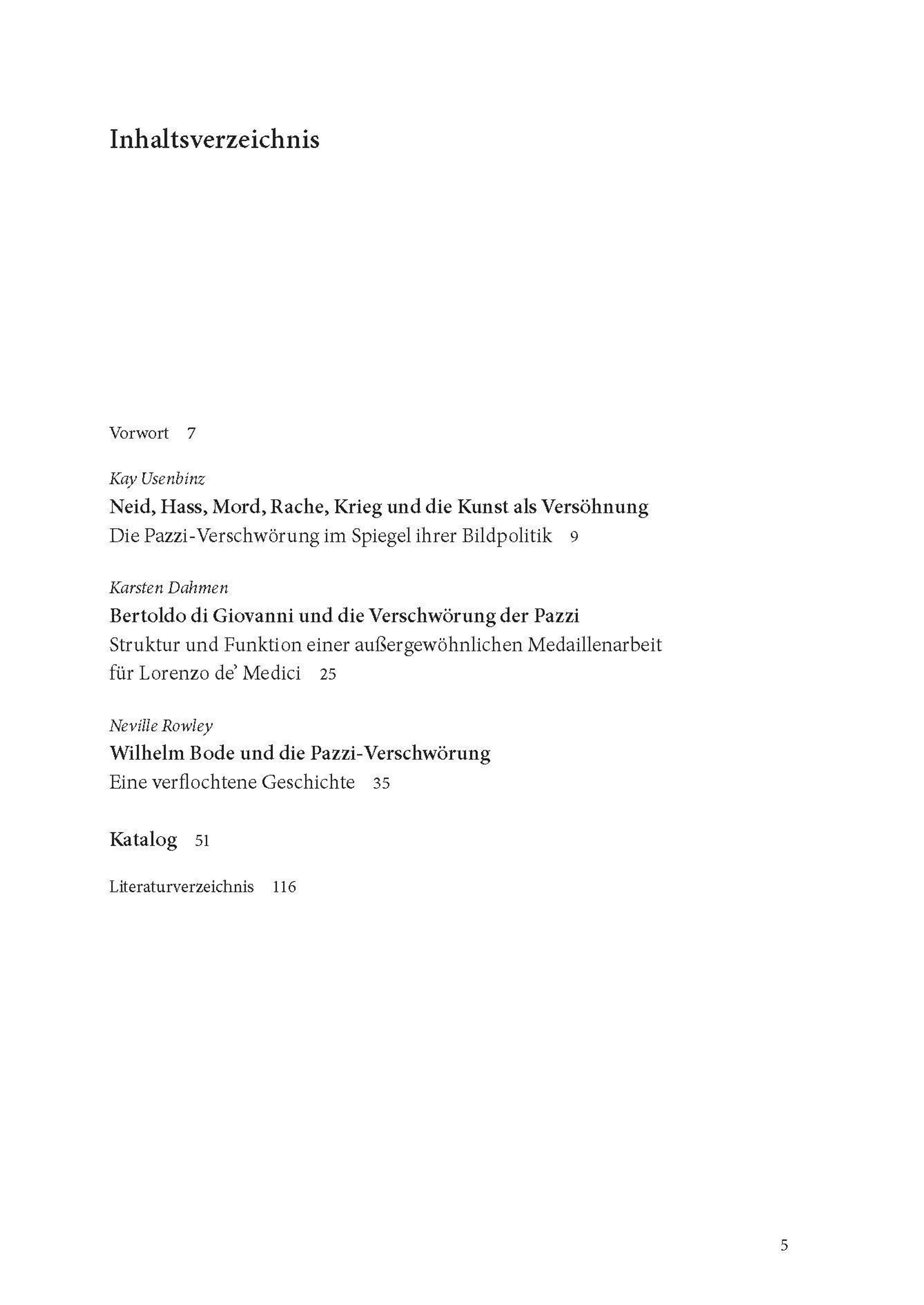 Am 26. April 1478 wurden Lorenzo und Giuliano de' Medici in der Kathedrale von Florenz überfallen. Anders als Giuliano überlebte Lorenzo und bestrafte anschließend die Drahtzieher, allen voran die Familie Pazzi. Die Staatlichen Museen zu Berlin sind eine der wenigen Museumsinstitutionen, die zwei Exemplare der Medaille besitzt, welche der Florentiner Bildhauer Bertoldo di Giovanni in Lorenzos Auftrag auf die "Pazzi-Verschwörung" fertigte. Drei Aufsatzbeiträge widmen sich dem historischen Geschehen, den uns heute überlieferten Kunstwerken und der Bedeutung von Florenz, den Medici und Wilhelm Bode für die Konzeption des heute nach ihm benannten Museums. Zusammen mit Einführungstexten werden sämtliche ausgestellte Objekte in einem Katalogteil präsentiert.