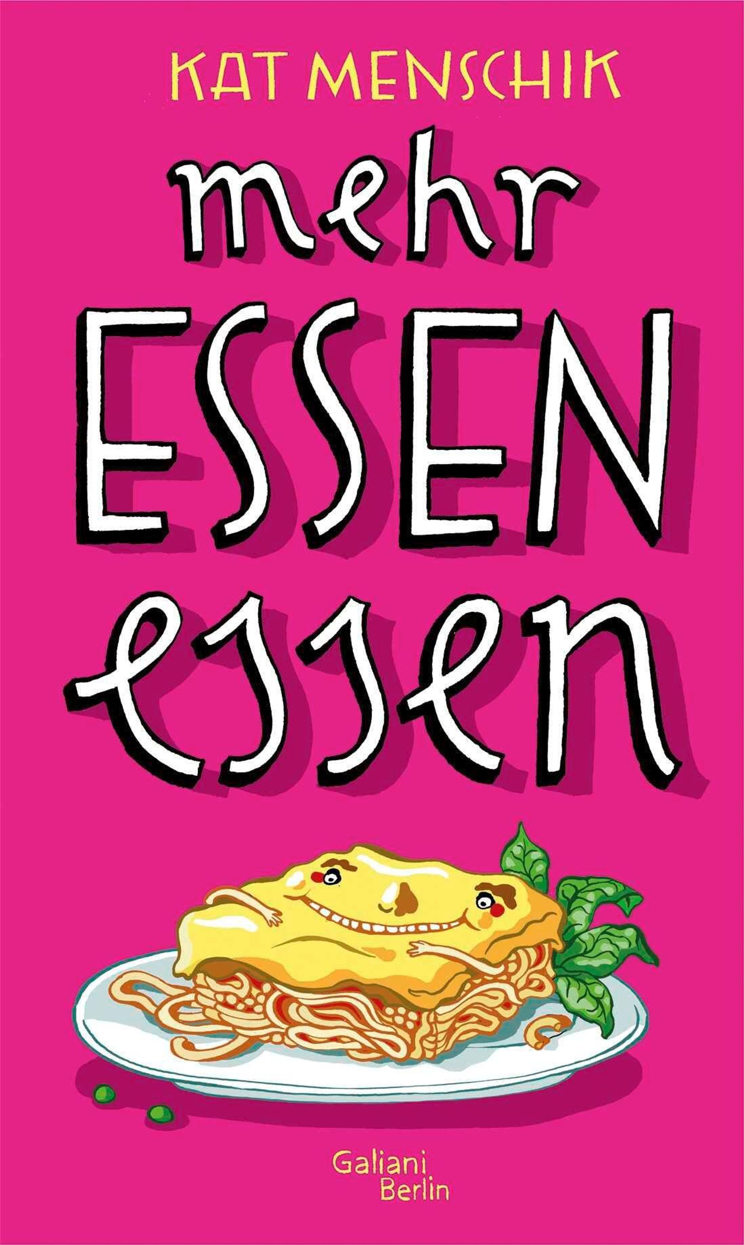 Auf pinkem Hintergrund steht "Kat Menschik mehr essen essen" über einem fröhlichen Nudelgericht mit Gesicht., Buch