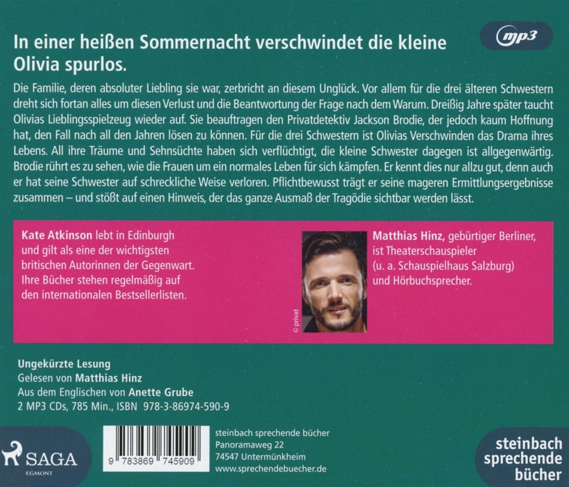 In einer heißen Sommernacht verschwindet die kleine Olivia spurlos. Die Familie, deren absoluter Liebling sie war, zerbricht an diesem Unglück. Vor allem für die drei älteren Schwestern dreht sich fortan alles um diesen Verlust und die Beantwortung der Frage nach dem Warum. Dreißig Jahre später taucht Olivias Lieblingsspielzeug wieder auf. Sie beauftragen den Privatdetektiv Jackson Brodie, der jedoch kaum Hoffnung hat, den Fall nach all den Jahren lösen zu können. Für die drei Schwestern ist Olivias Verschwinden das Drama ihres Lebens. All ihre Träume und Sehnsüchte haben sich verflüchtigt, die kleine Schwester dagegen ist allgegenwärtig. Brodie rührt es zu sehen, wie die Frauen um ein normales Leben für sich kämpfen. Er kennt dies nur allzu gut, denn auch er hat seine Schwester auf schreckliche Weise verloren. Pflichtbewusst trägt er seine mageren Ermittlungsergebnisse zusammen - und stößt auf einen Hinweis, der das ganze Ausmaß der Tragödie sichtbar werden lässt.