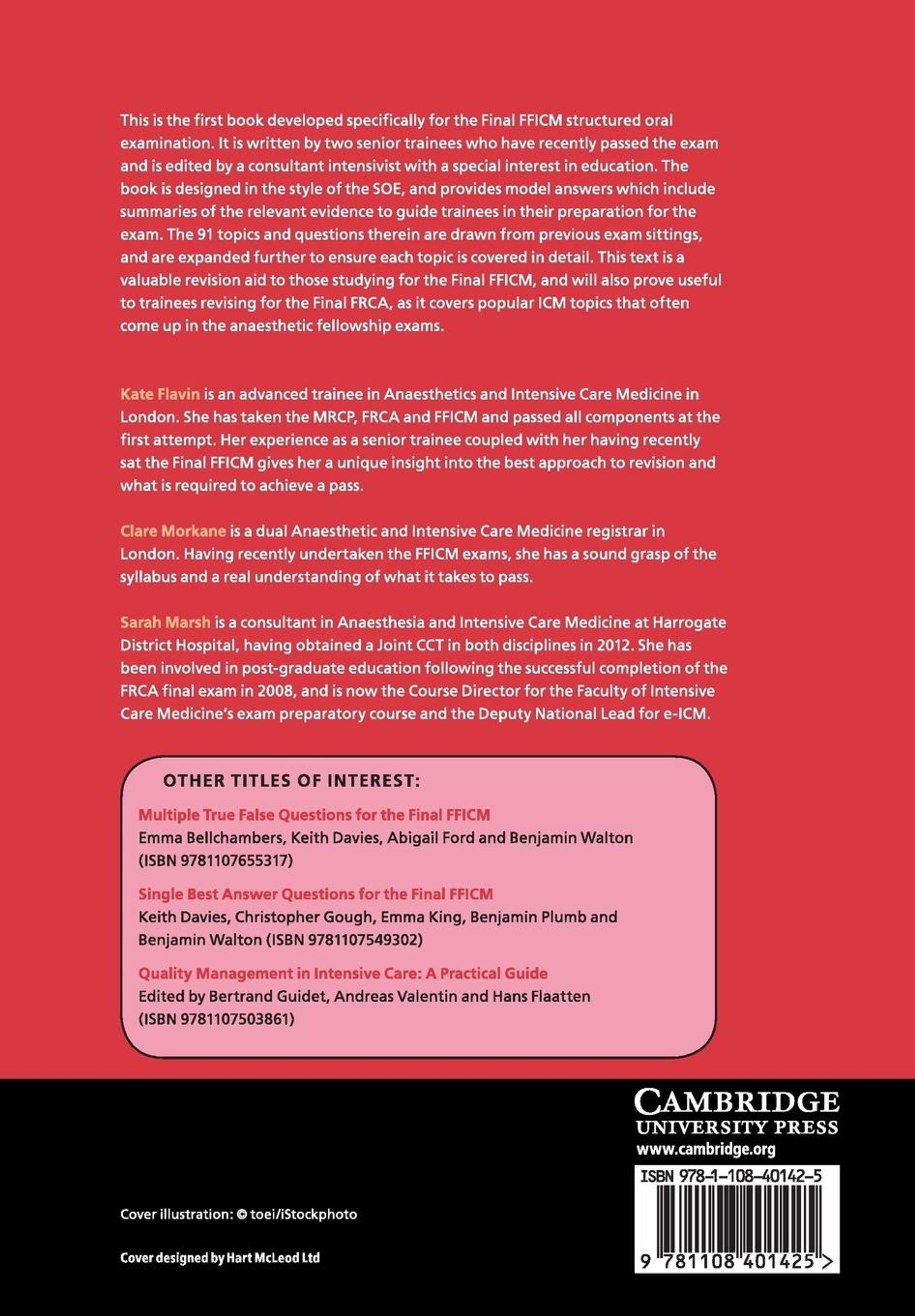 This is the first book developed specifically for the Final FFICM structured oral examination. It is written by two senior trainees who have recently passed the exam and is edited by a consultant intensivist with a special interest in education. The book is designed in the style of the SOE, and provides model answers which include summaries of the relevant evidence to guide trainees in their preparation for the exam. The 91 topics and questions therein are drawn from previous exam sittings, and are expanded further to ensure each topic is covered in detail. This text is a valuable revision aid to those studying for the Final FFICM, and will also prove useful to trainees revising for the Final FRCA, as it covers popular ICM topics that often come up in the anaesthetic fellowship exams.