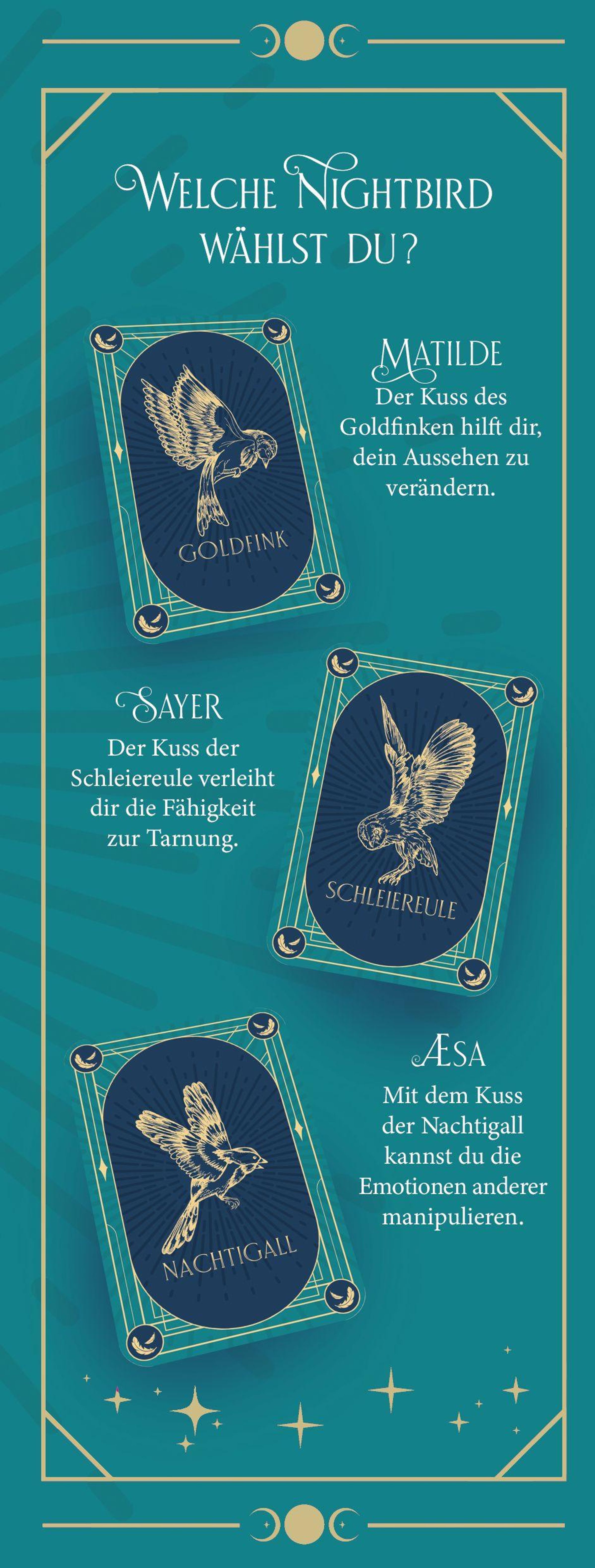 Magie ist in Simta verboten, deshalb sind die Nightbirds das bestgehütete Geheimnis der Stadt. Tagsüber spielen Matilde, Sayer und Æsa die Töchter aus gutem Hause, nachts geben sie als Nightbirds ihre Magie an zahlende Kunden weiter - mit einem Kuss. Doch dann entgehen sie nur knapp einem Attentat und plötzlich wird ihr glamouröses Leben zum goldenen Käfig. Wer will die Nightbirds töten - und warum? Die Suche nach Antworten führt Matilde, Sayer und Æsa in die geheime Unterwelt von Simta.