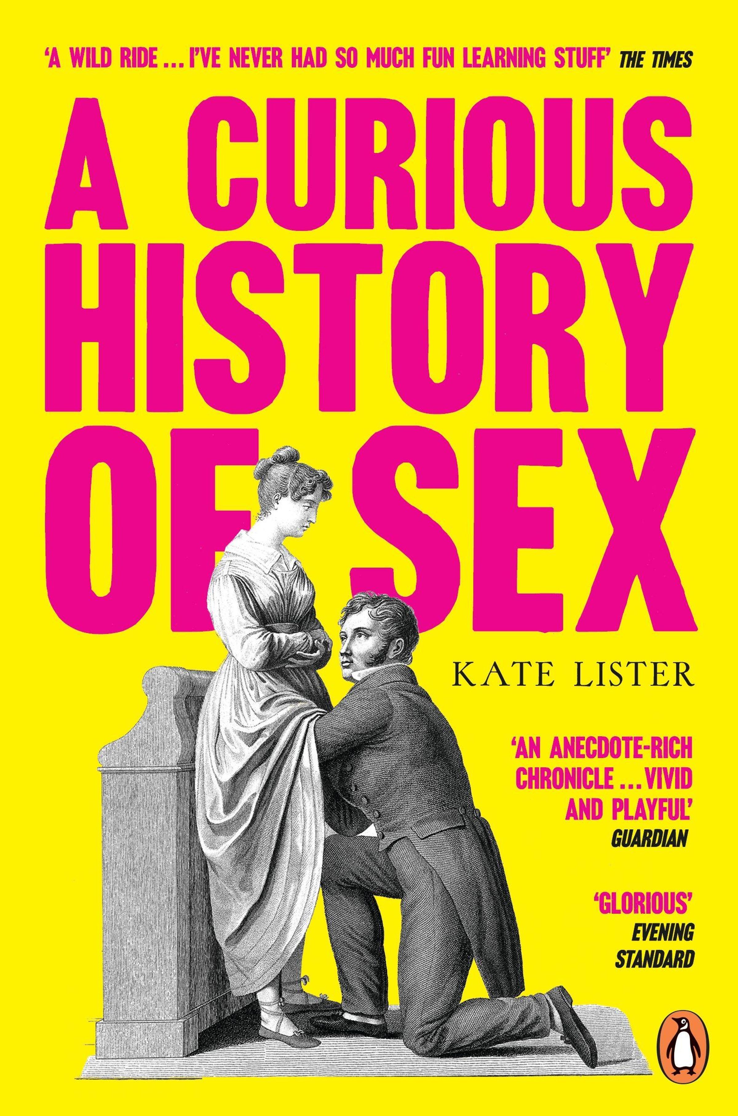 Titel: "A Curious History of Sex". Autor: Kate Lister. Gelber Hintergrund, pinker Text. Historische Illustration: zwei Menschen., Buch