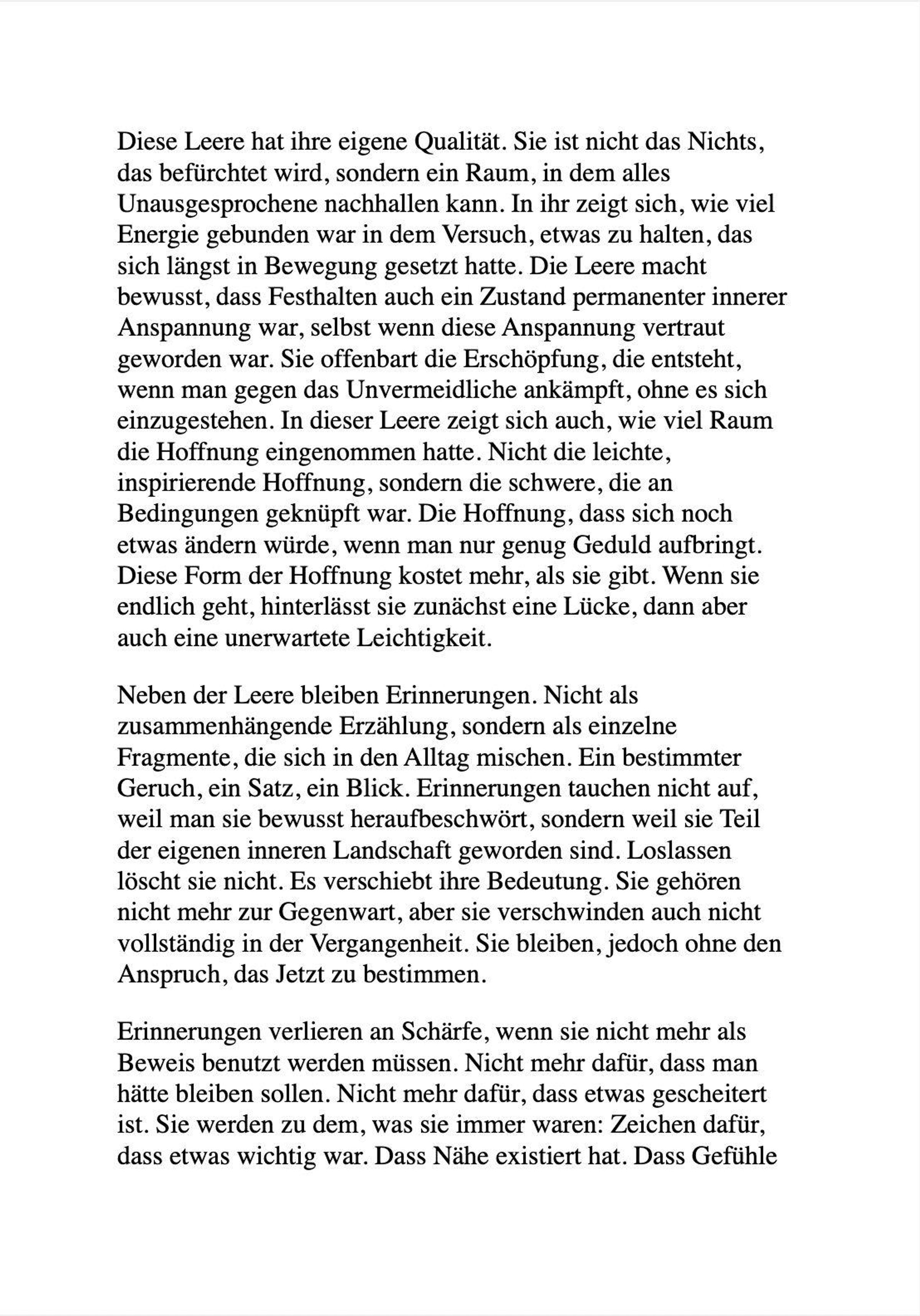 Ich schreibe über das Dazwischen. Über das Loslassen, das kein Ende ist. Über Dinge, die nie gesagt wurden. Über Grenzen, die erst sichtbar wurden, als es zu spät war. Über die Erkenntnis, dass Zeit nicht alles heilt - aber Ehrlichkeit etwas verändern kann.