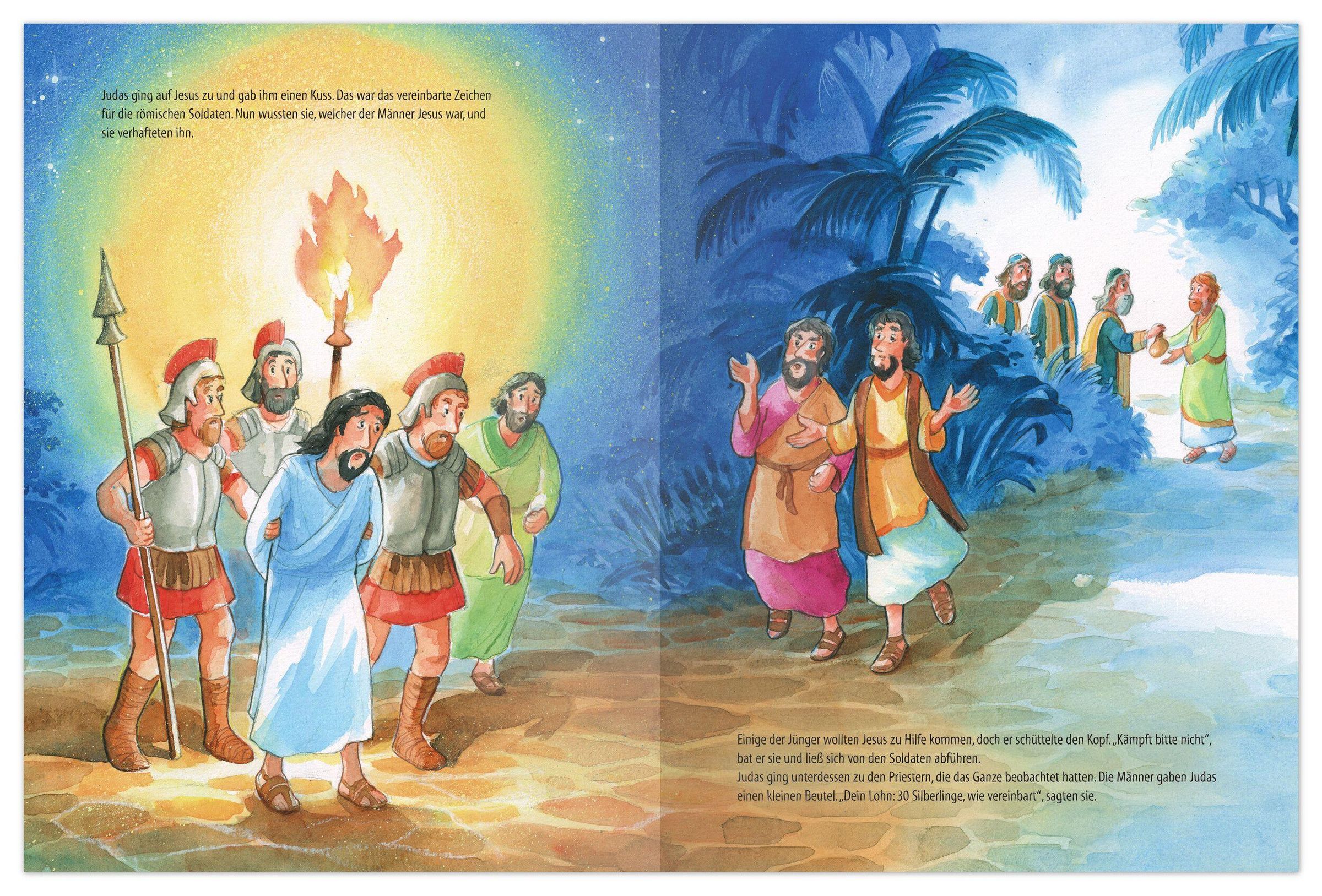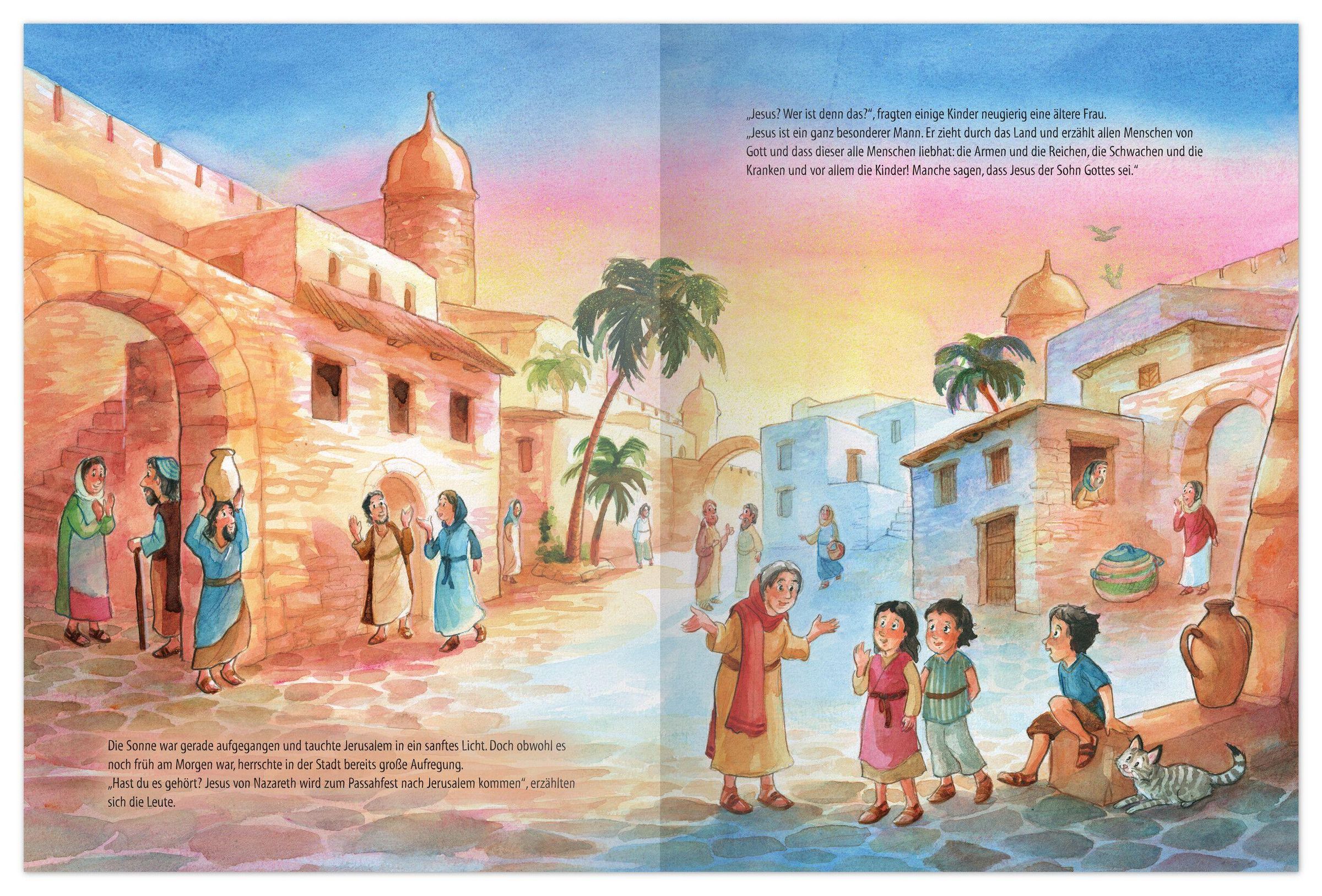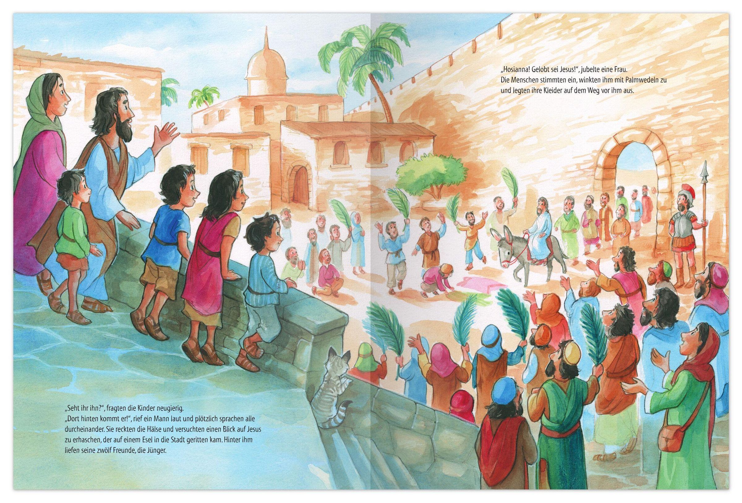 Dieses Bilderbuch nimmt Kinder mit in die besondere Geschichte Jesu: Am Palmsonntag zieht er auf einem Esel in die Stadt Jerusalem ein, die Menschen freuen sich und winken mit bunten Palmzweigen. Gemeinsam mit seinen Freunden erlebt Jesus besondere Momente, das letzte Abendmahl, schwere Ereignisse und schließlich das große Osterwunder. So entdecken Kinder auf liebevolle Weise, warum Menschen seit über 2000 Jahren an Ostern Freude und Hoffnung feiern.
