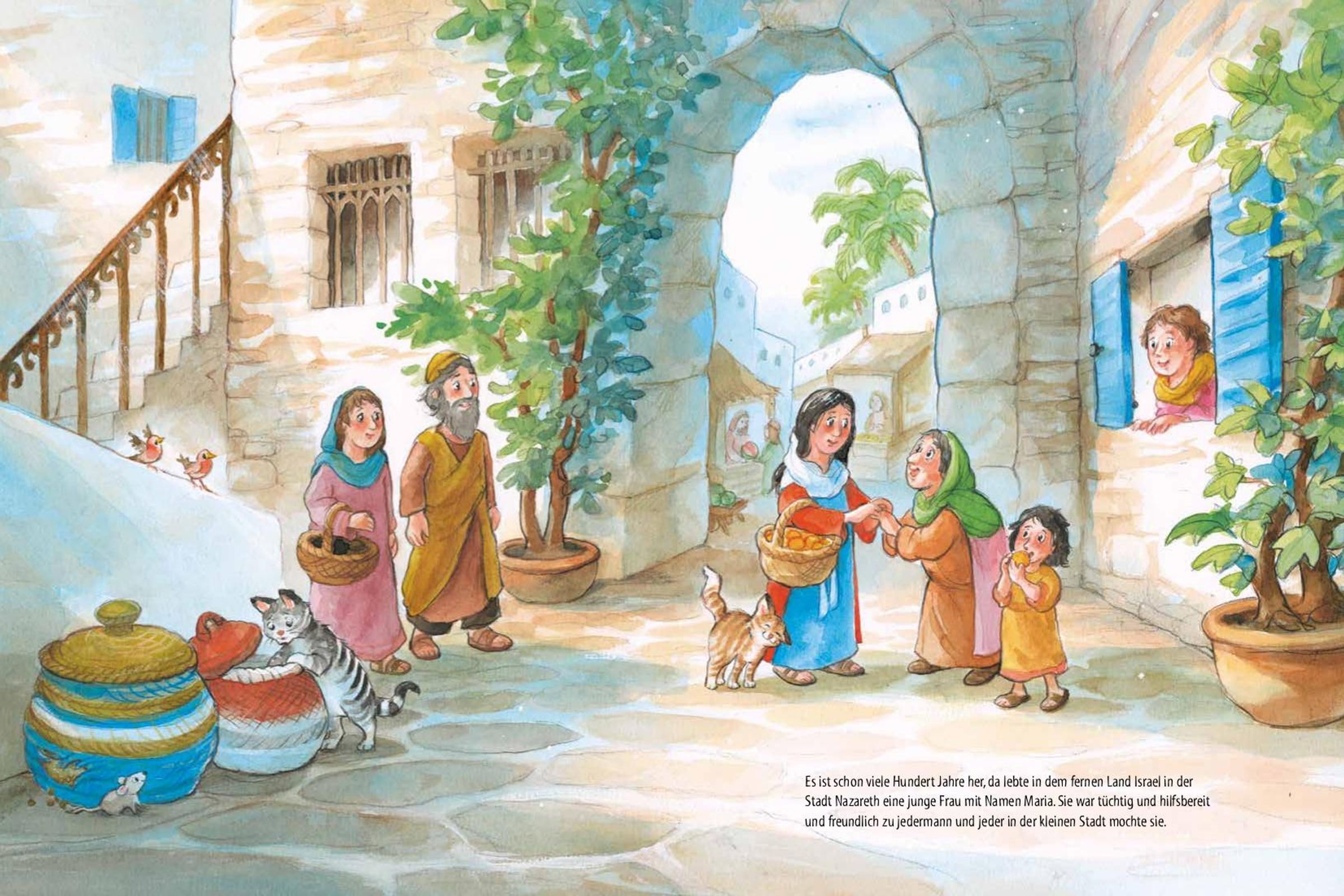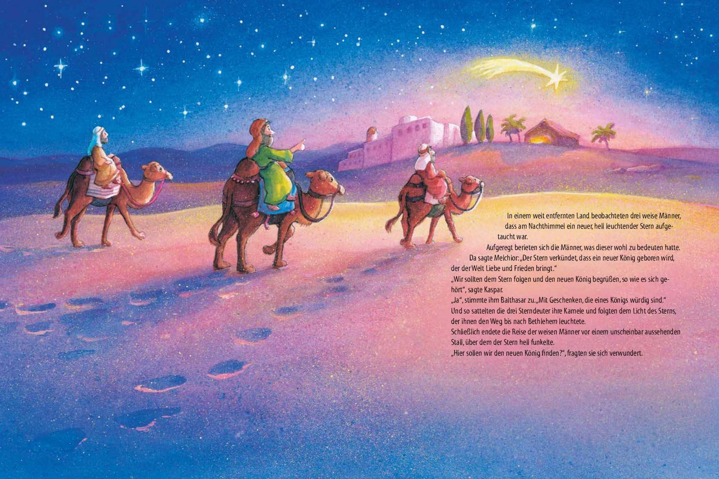 "Und als sie einige Tage später in der Ferne die Stadt Bethlehem sehen konnten, zeigte sich ein Lächeln auf dem Gesicht der jungen Frau. Sie hatten es geschafft - endlich waren sie in Bethlehem angekommen. Und nicht einen Tag zu früh, denn Maria spürte, dass ihr Kind bald auf die Welt kommen würde."