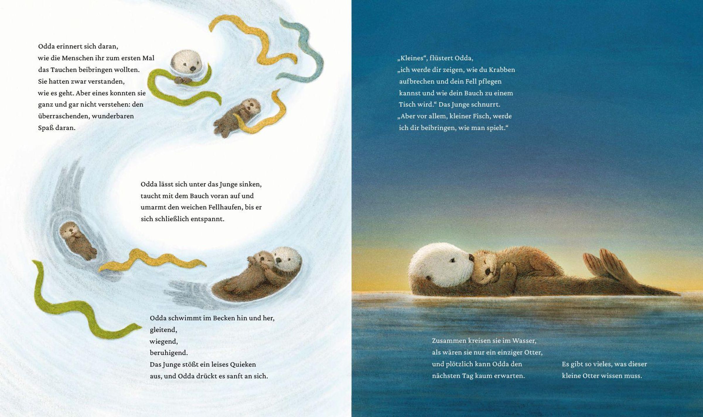 Ottermädchen Odda hat etwas Besonderes an sich. Schon als Junges sprüht sie vor Energie und ihre Augen sind voller Fragen. Doch eines Morgens reißt ein Sturm sie von ihrer Mutter fort. Menschen nehmen sie auf und bringen ihr alles bei, was ein Otter wissen und können muss. Als sie bereit ist, kehrt Odda ins Meer zurück. Die Wellen werden zu ihrem Spielplatz und sie zur Königin des Spiels. Aber nach einem Haiangriff ist nichts mehr wie zuvor. Zurück bei den Menschen bekommt Odda eine neue Aufgabe: Jetzt ist sie es, die einem verlorengegangenen Otterkind zeigt, was es bedeutet, ein Otter zu sein.