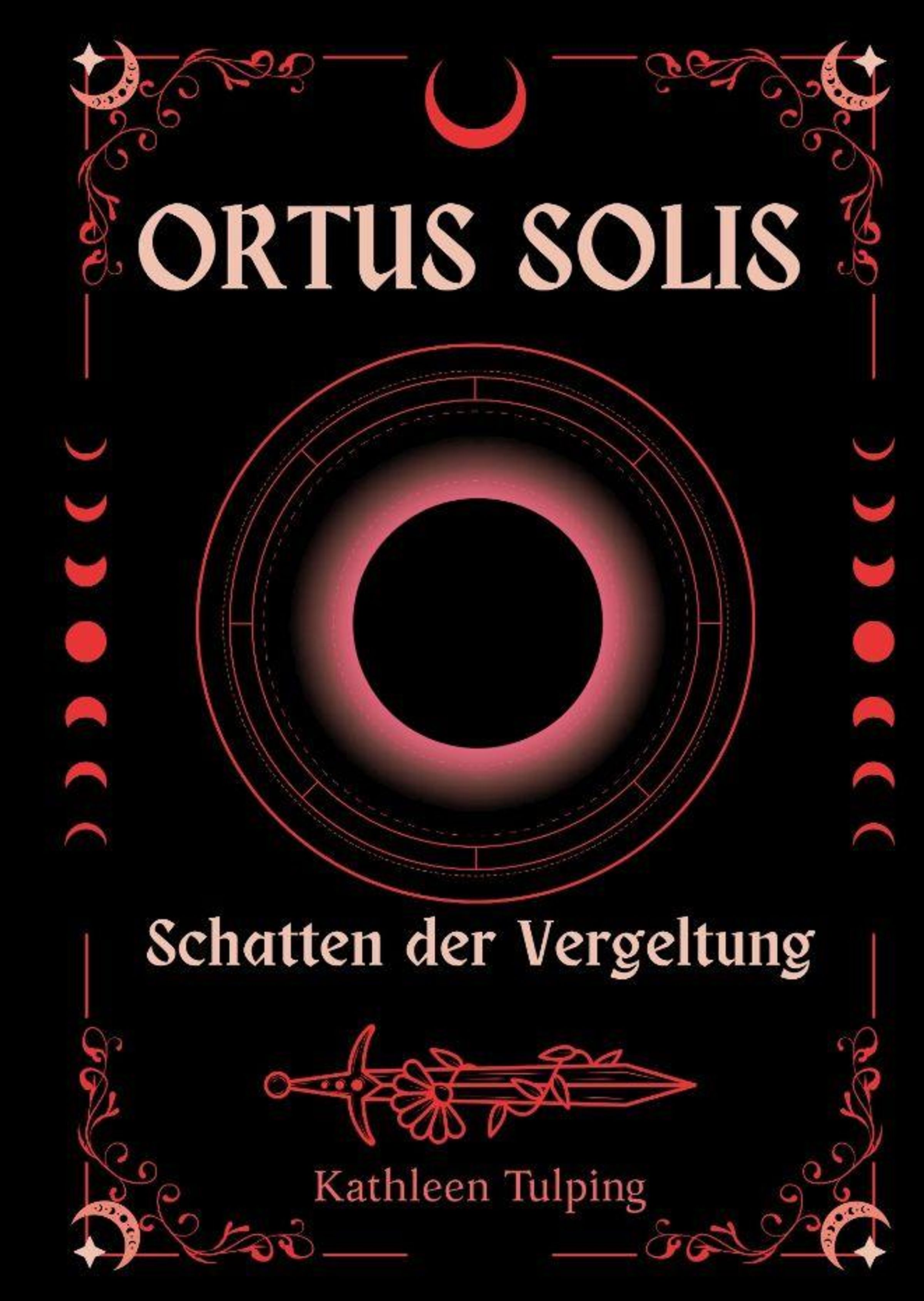 „ORTUS SOLIS: Schatten der Vergeltung“, Kathleen Tulping. Dunkler Hintergrund, Mondphasen, rotes Schwert., Buch