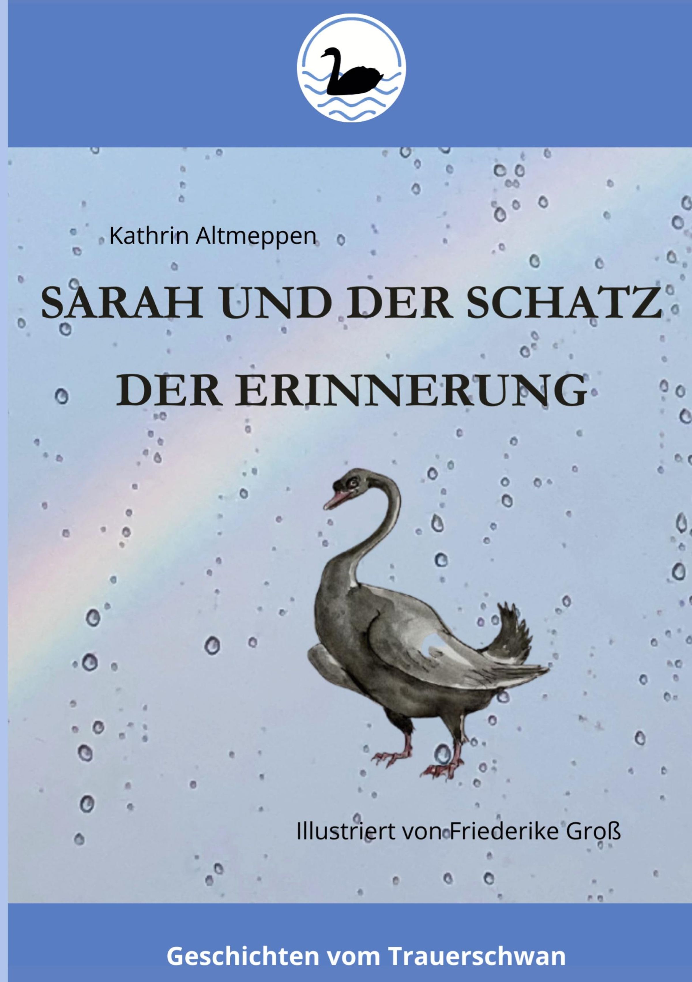 "Sarah und der Schatz der Erinnerung" von Kathrin Altmeppen. Illustration eines Schwans vor einem Regenbogen., Buch