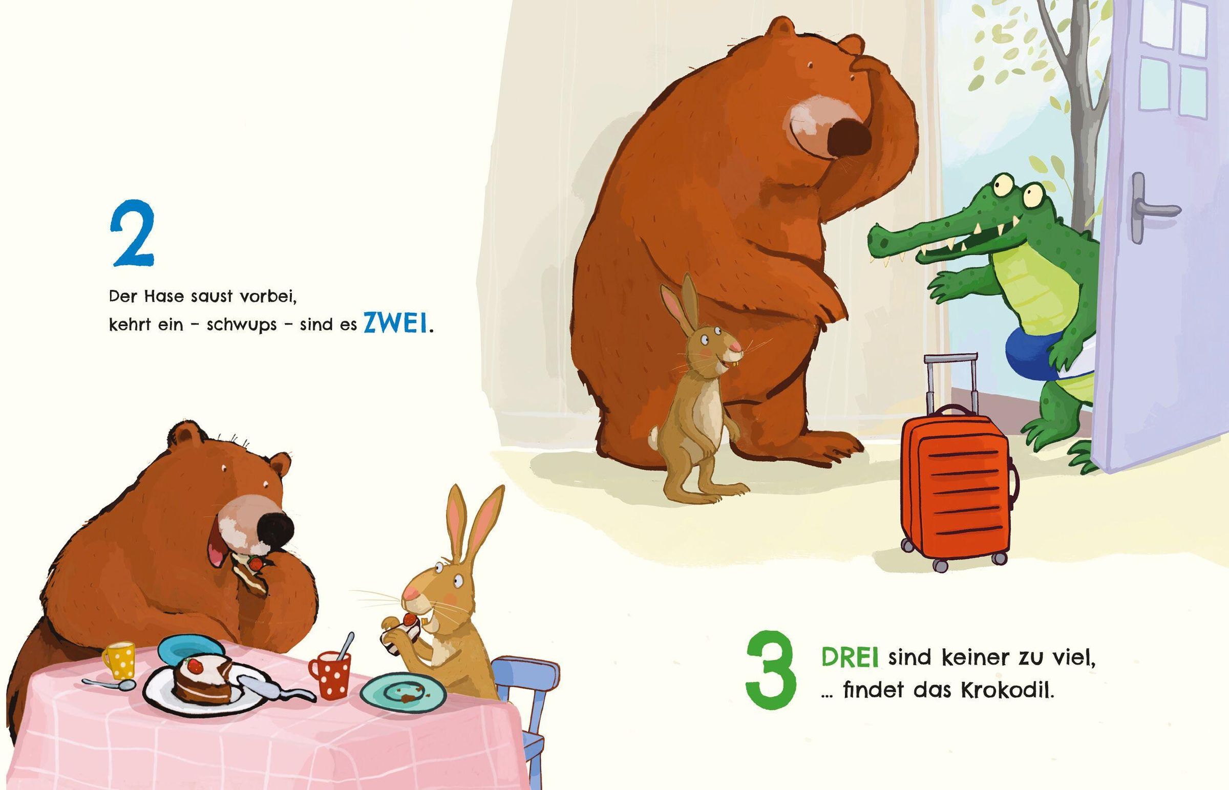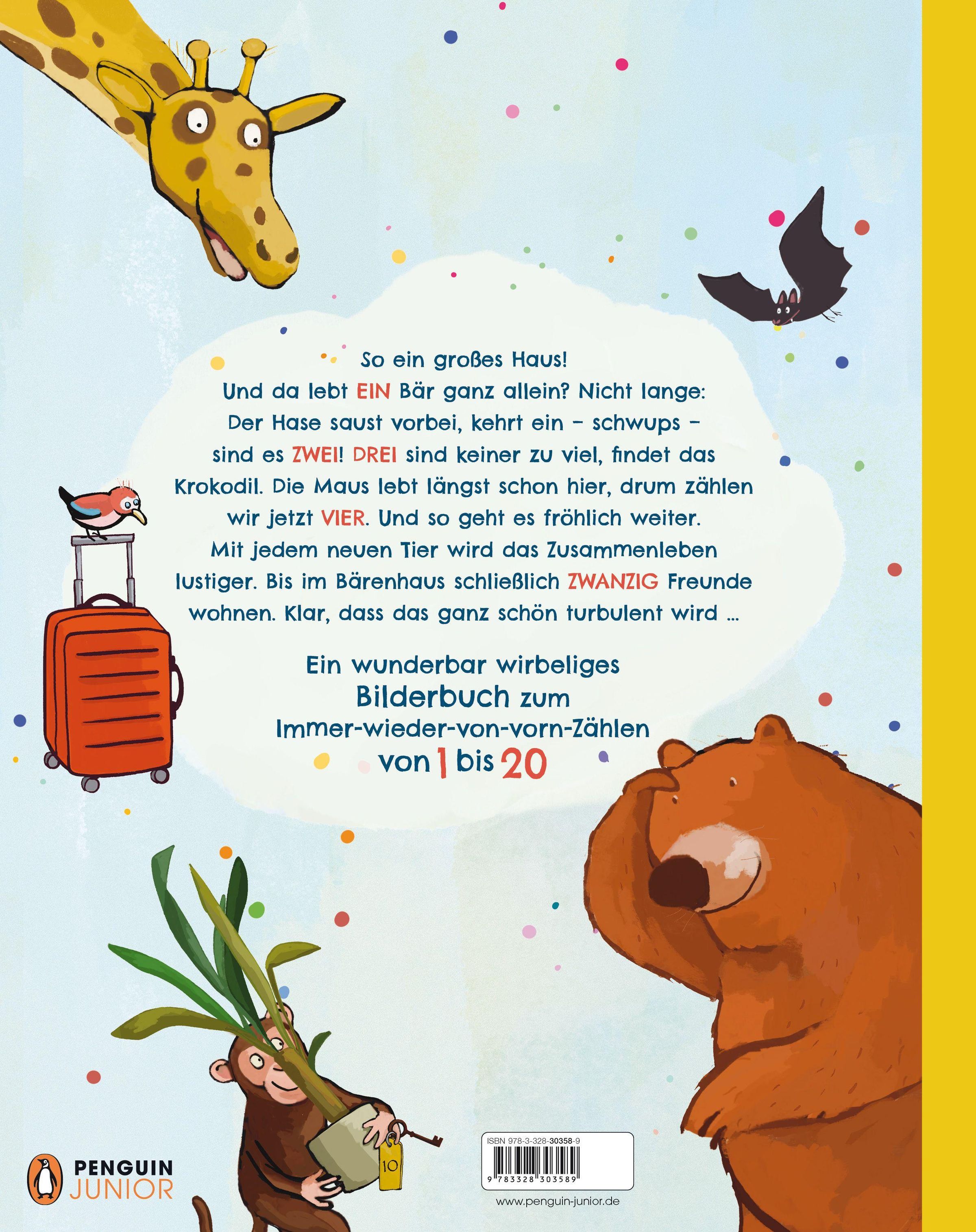 EIN Bär lebt ganz allein, deshalb muss er seine Torte auch nicht teilen! Als plötzlich EIN Hase vor seiner Tür steht, EIN Krokodil und dann EINE Maus, sind sie schon VIER ! Mit jedem neuen Tier wird das Haus des Bären nun immer voller und lustiger, bis es ZWANZIG Freunde sind. Jetzt sind sie komplett und finden alle noch ein Bett. Und der Bär freut sich, denn endlich ist er nicht mehr allein!