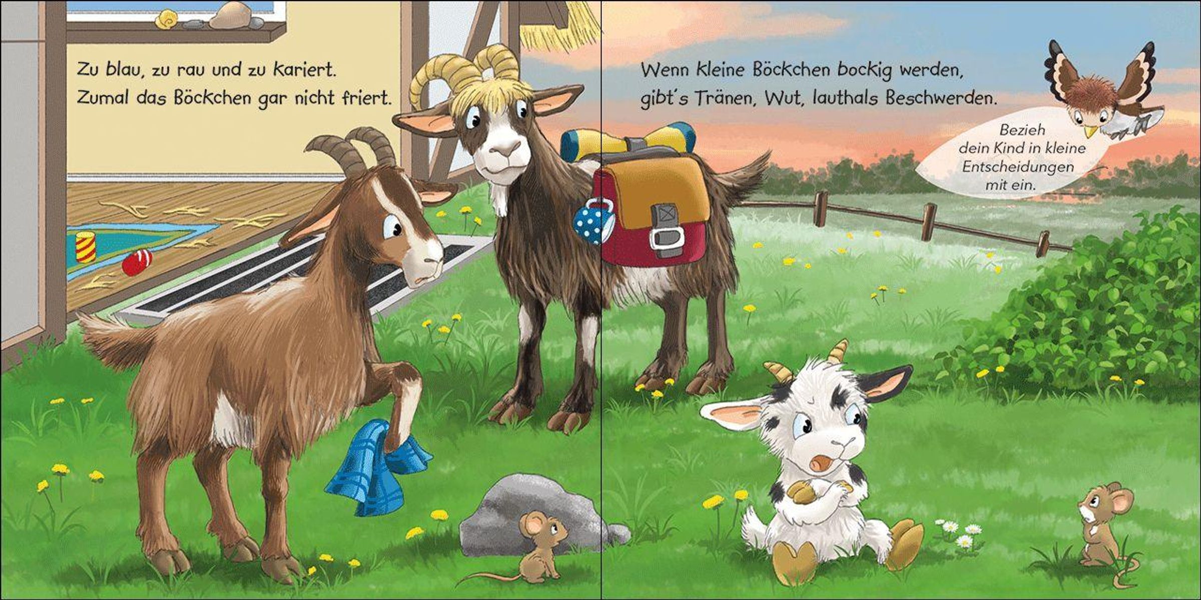 Böckchen komm, mach dich bereit. Wir müssen los, wird höchste Zeit. Doch das kleine Böckchen will heute nicht und wenn kleine Böckchen bockig werden, gibt's Tränen, Wut, lauthals Beschwerden. Wie aus der miesen Laune doch noch ein Lächeln werden kann, zeigt dieses Buch.