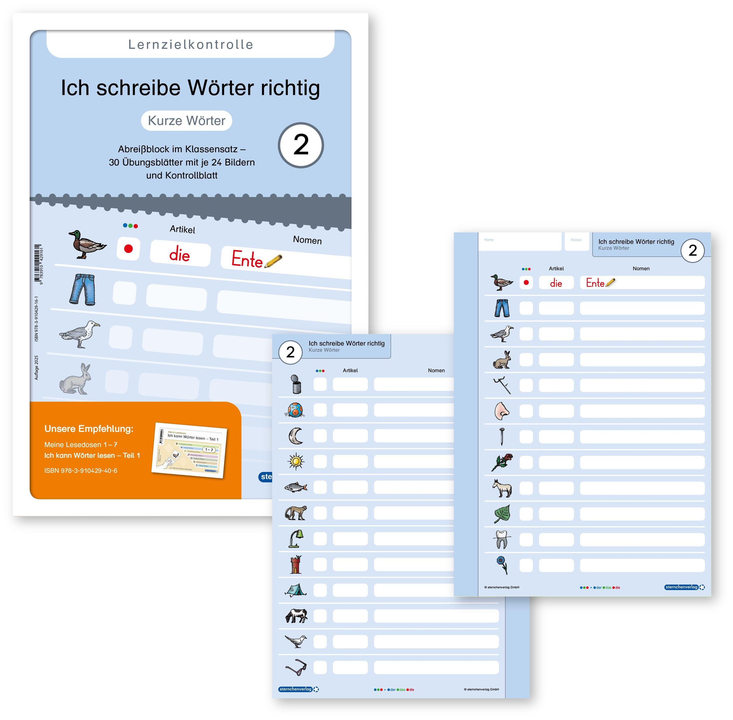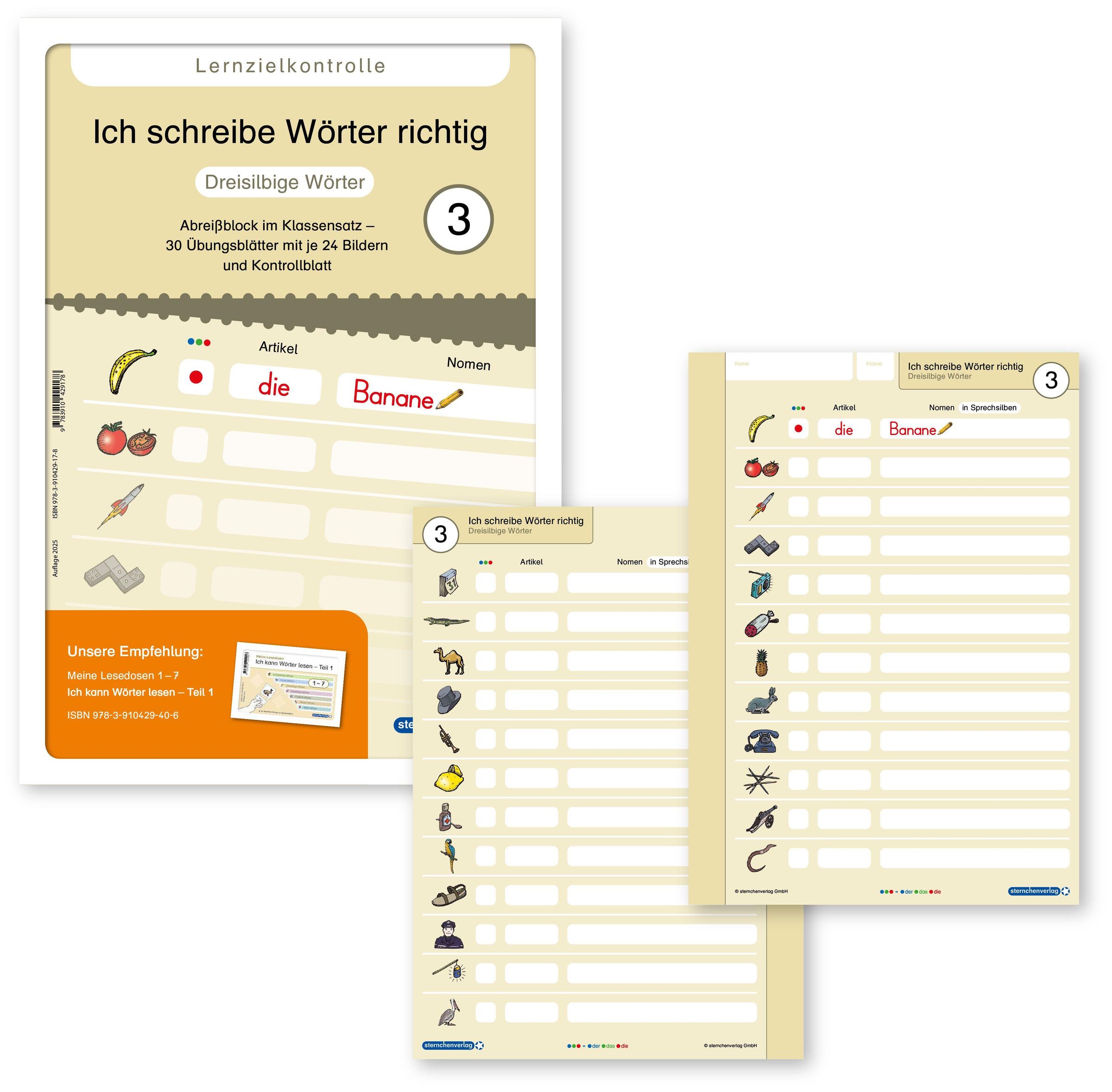 3 Abreißblöcke "Ich schreibe Wörter richtig" zum selbstständigen Arbeiten für 30 Schüler. Jeweils 3 Blöcke mit 30 Übungsblättern und einem Kontrollblatt. DIN A4 , farbige Vorder,- und Rückseite zum Ausfüllen Inhalt: [1] Lautgetreue Wörter [2] Kurze Wörter [3] Dreisilbige Wörter