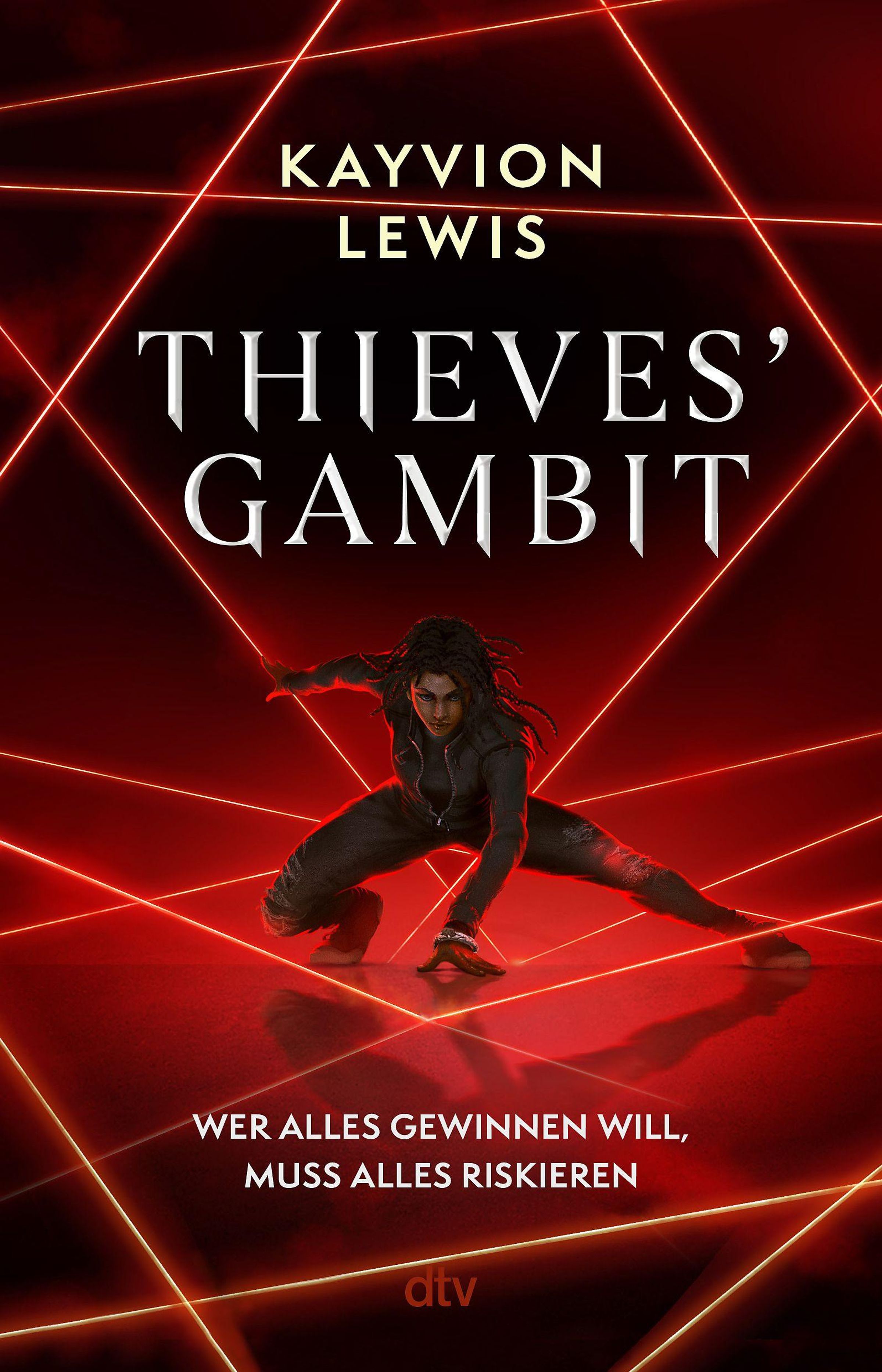 "Kayvion Lewis: Thieves' Gambit. Wer alles gewinnen will, muss alles riskieren." Eine Person in Kampfhaltung, umgeben von roten Lasern., Buch
