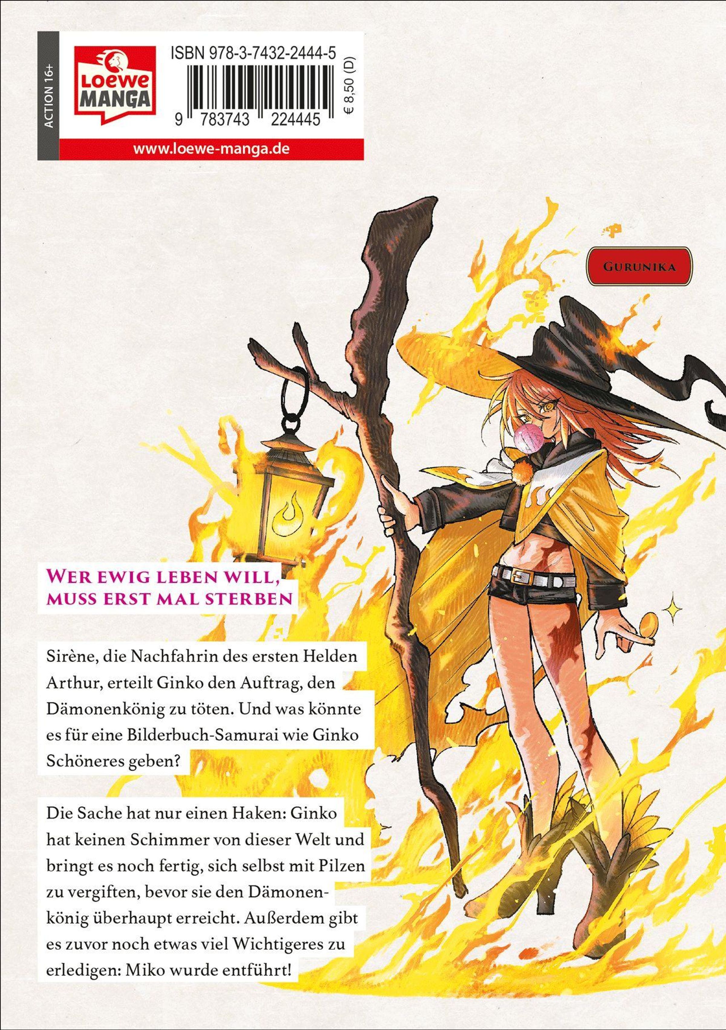 Wer ewig leben will, muss erst mal sterben Sirène, die Nachfahrin des ersten Helden Arthur, erteilt Ginko den Auftrag, den Dämonenkönig zu töten. Und was könnte es für eine Bilderbuch-Samurai wie Ginko Schöneres geben? Die Sache hat nur einen Haken: Ginko hat keinen Schimmer von dieser Welt und bringt es noch fertig, sich selbst mit Pilzen zu vergiften, bevor sie den Dämonenkönig überhaupt erreicht. Außerdem gibt es zuvor noch etwas viel Wichtigeres zu erledigen: Miko wurde entführt!