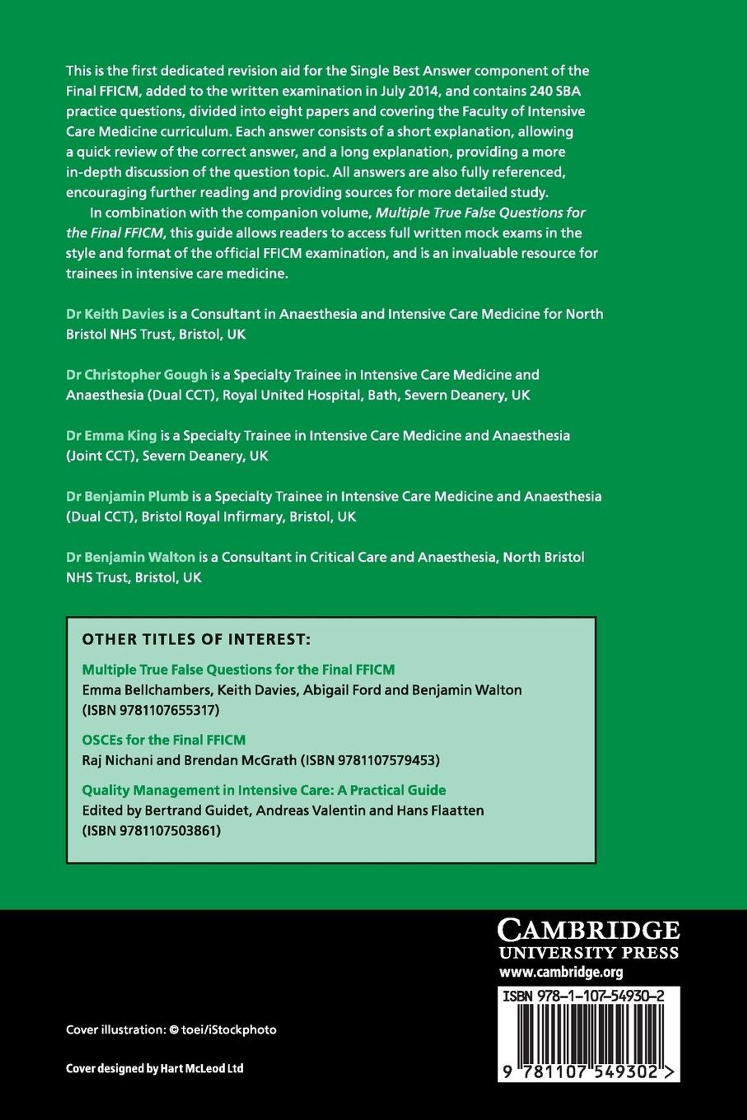This is the first dedicated revision aid for the Single Best Answer component of the Final FFICM, added to the written examination in July 2014. It contains 240 SBA practice questions, divided into eight papers covering the Faculty of Intensive Care Medicine curriculum. Each answer consists of a short explanation, allowing a quick review of the correct answer, and a long explanation, providing a more in-depth discussion of the question topic. All answers are also fully referenced, encouraging further reading and providing sources for more detailed study. In combination with the companion volume, Multiple True False Questions for the Final FFICM, this guide allows readers to access full written mock exams in the style and format of the official FFICM examination, and is an invaluable resource for trainees in intensive care medicine.