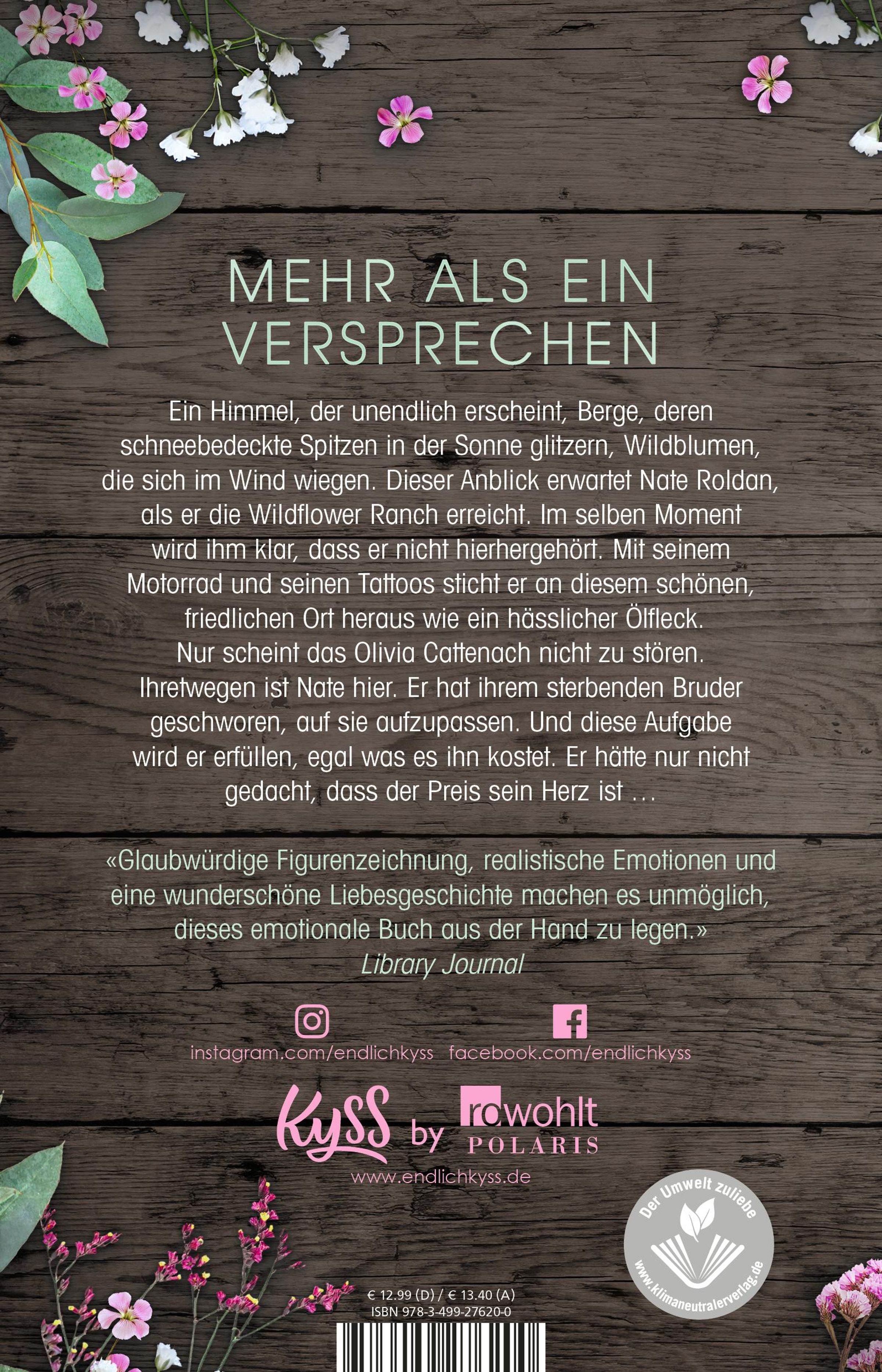 Ein Himmel, der unendlich erscheint, Berge, deren schneebedeckte Spitzen in der Sonne glitzern, Wildblumen, die sich im Wind wiegen. Dieser Anblick erwartet Nate Roldan, als er die Wildflower Ranch erreicht. Im selben Moment wird ihm klar, dass er nicht hierhergehört. Mit seinem Motorrad und seinen Tattoos sticht er an diesem schönen, friedlichen Ort heraus wie ein hässlicher Ölfleck.