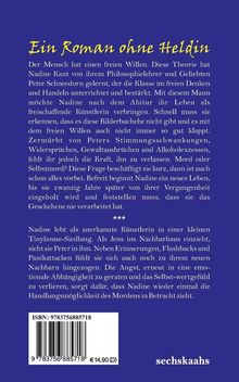 Der Mensch hat einen freien Willen. Diese Theorie hat Nadine Kant von ihrem Philosophielehrer und Geliebten Peter Schneedorn gelernt, der die Klasse im freien Denken und Handeln unterrichtet und bestärkt. Mit diesem Mann möchte Nadine nach dem Abitur ihr Leben als freischaffende Künstlerin verbringen. Schnell muss sie erkennen, dass es diese Bilderbuchehe nicht gibt und es mit dem freien Willen auch nicht immer so gut klappt. Zermürbt von Peters Stimmungsschwankungen, Widersprüchen, Gewaltausbrüchen und Alkoholexzessen, fehlt ihr jedoch die Kraft, ihn zu verlassen. Mord oder Selbstmord? Diese Frage beschäftigt sie kurz, dann ist auch schon alles vorbei. Befreit beginnt Nadine ein neues Leben, bis sie zwanzig Jahre später von ihrer Vergangenheit eingeholt wird und feststellen muss, dass sie das Geschehene nie verarbeitet hat.