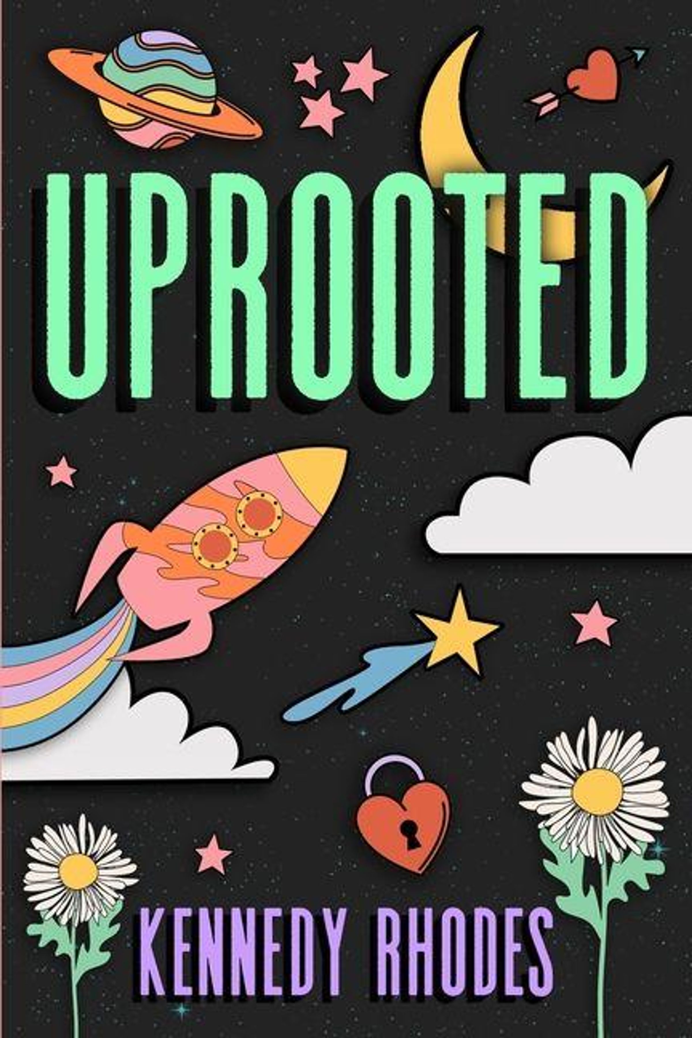 "UPROOTED, Kennedy Rhodes." Eine bunte Illustration mit Rakete, Planeten, Mond, Blumen, Herzen und Wolken auf schwarzem Hintergrund., Buch