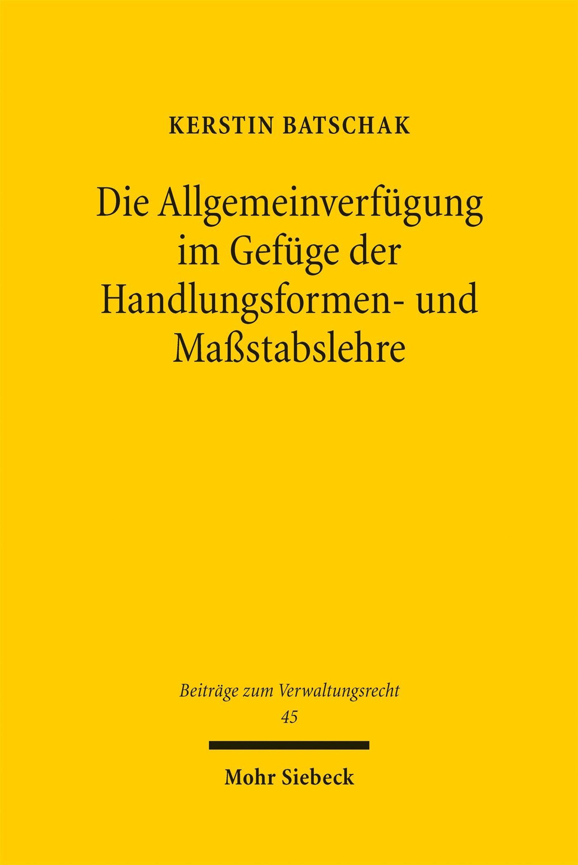 The general order (Allgemeinverfügung), as an established form of administrative action, has come into the focus of legal scholarship and public debate in the wake of the COVID-19 pandemic, assembly bans during climate protests, and prohibitions on carrying dangerous objects in train stations. Taking into account the requirements set out in § 35 sentence 1 and, in particular, sentence 2 of the Administrative Procedure Act (VwVfG), the general order can be classified as a modification of the administrative act. Consequently, the general provisions of administrative procedure law-such as those governing assurances or withdrawals-are likewise applicable to the general order. By addressing a large number of persons, the general decree proves to be a particularly effective form of administrative action, a fact acknowledged by the exceptions provided in the VwVfG regarding hearings, reasoning, and publication. However, with regard to the so-called "individual case" as the boundary for the use of general orders, there remains considerable uncertainty in legal scholarship. This gives rise to difficulties in distinguishing the general decree from other forms of administrative action, such as the collective order or the statutory ordinance. The requirement of the "individual case" therefore calls for further specification through the use of guiding principles for administrative action-for instance, considerations shaped by crisis contexts, such as the concept of resilience. Furthermore, so-called Allgemeinverfügungen sui generis are analyzed, and a legislative proposal for amending the VwVfG is presented. In addition, Kerstin Batschak examines potential prohibitions on the use of the general order as a form of action-for example, such a prohibition may be assumed in the case of residence bans, but rejected with regard to assembly bans applying to a large number of assemblies. Finally, the work addresses available legal remedies and existing weaknesses in legal protection, which make an administrative duty to react to unlawful general orders necessary.