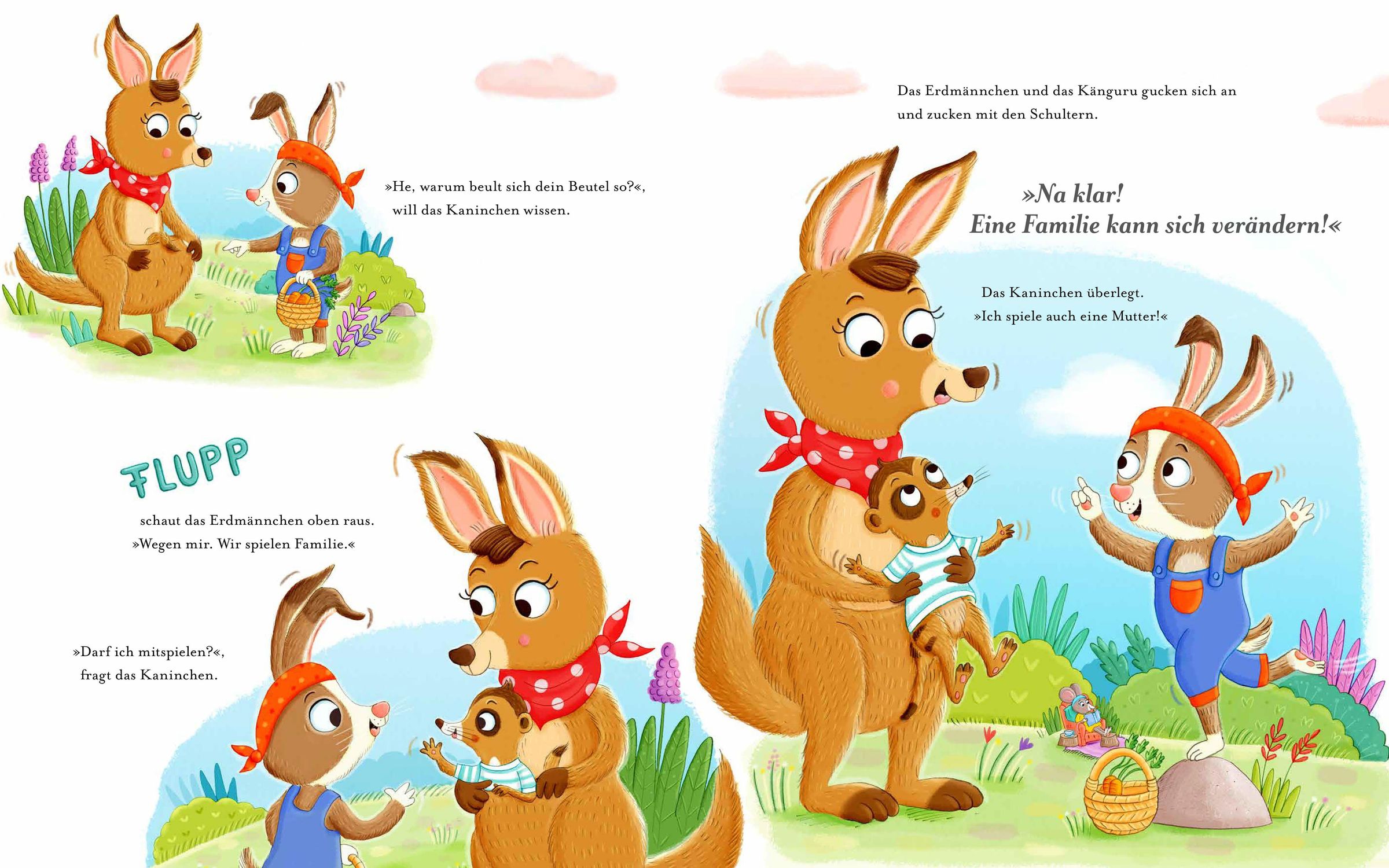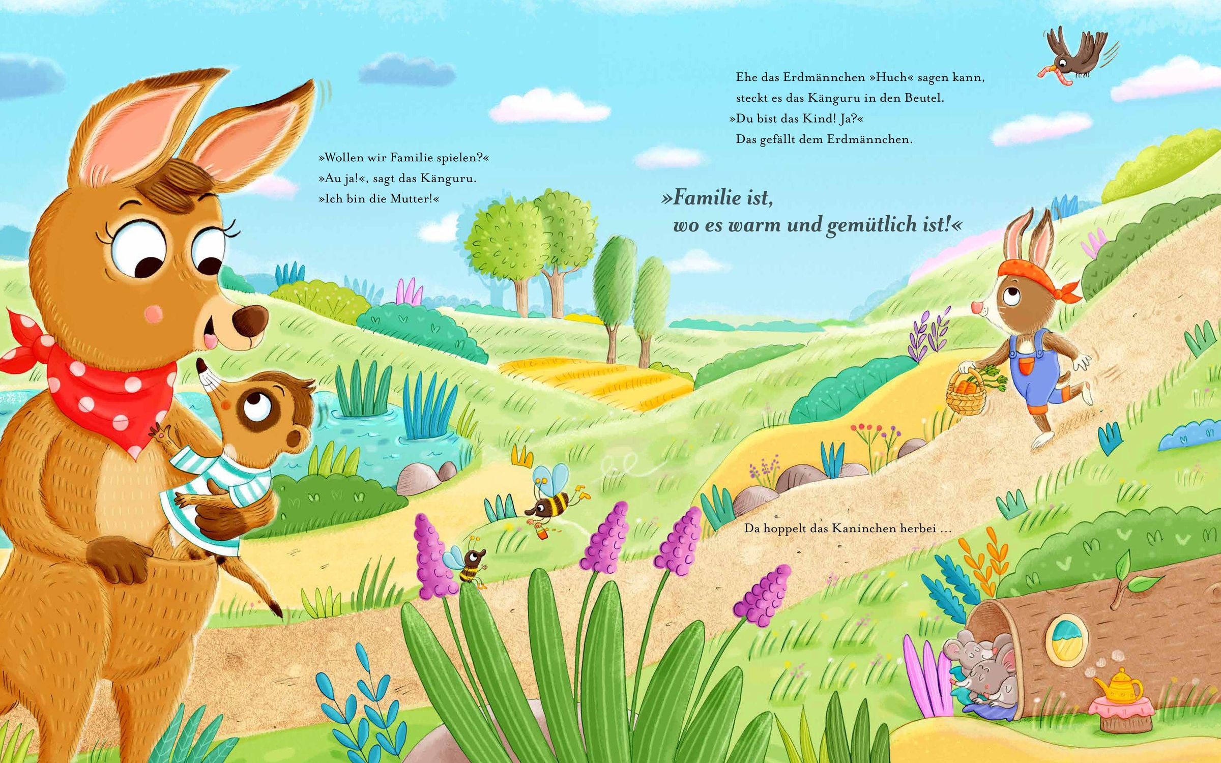 Knödelrö - das Erdmännchen und das Känguru langweilen sich. 'Wollen wir Familie spielen?', fragt das Erdmännchen. Schwupp - schon ist das Känguru die Mutter und steckt ihr Kind in den Beutel. Aha! Familie ist da, wo es warm und gemütlich ist! Da kommt das Kaninchen und will auch eine Mutter sein - na klar: Familie kann sich verändern! Die Katze spielt eine Schwester, denn Familie ist da, wo man zusammen lacht! Der Maulwurf springt ein, als das Erdmännchen sich wehtut - er spielt einen Opa: Denn Familie ist da, wo man getröstet wird. Und als die Eltern ihre Tierkinder zum Essen rufen, wissen alle: Familie ist da, wo dich jemand liebt.