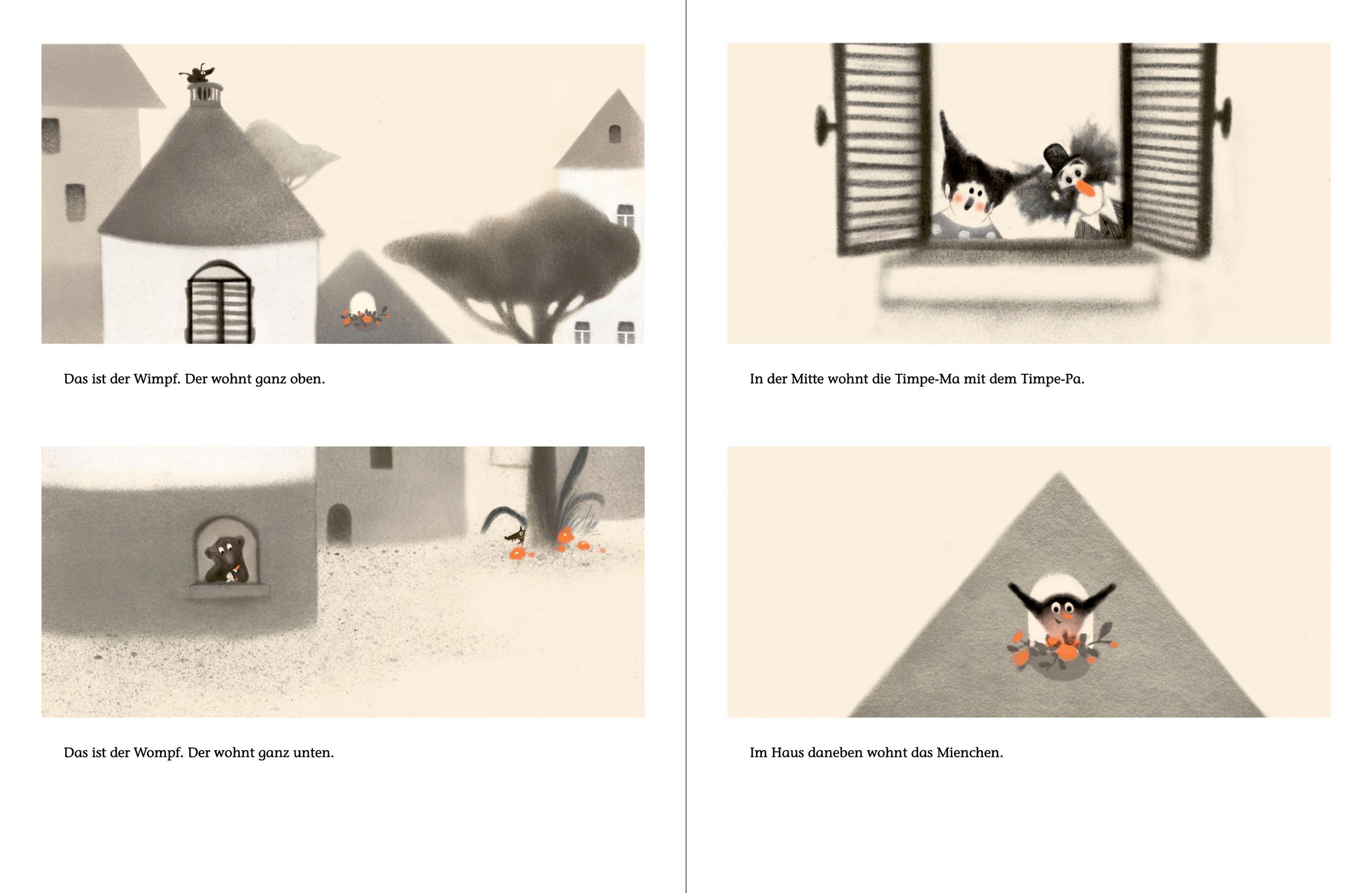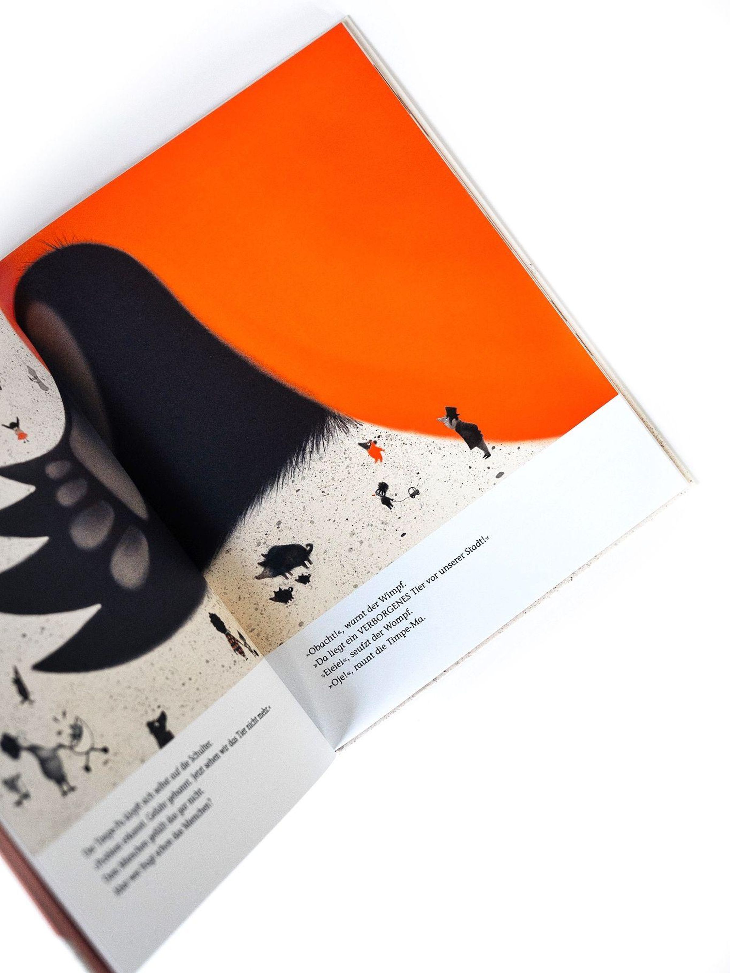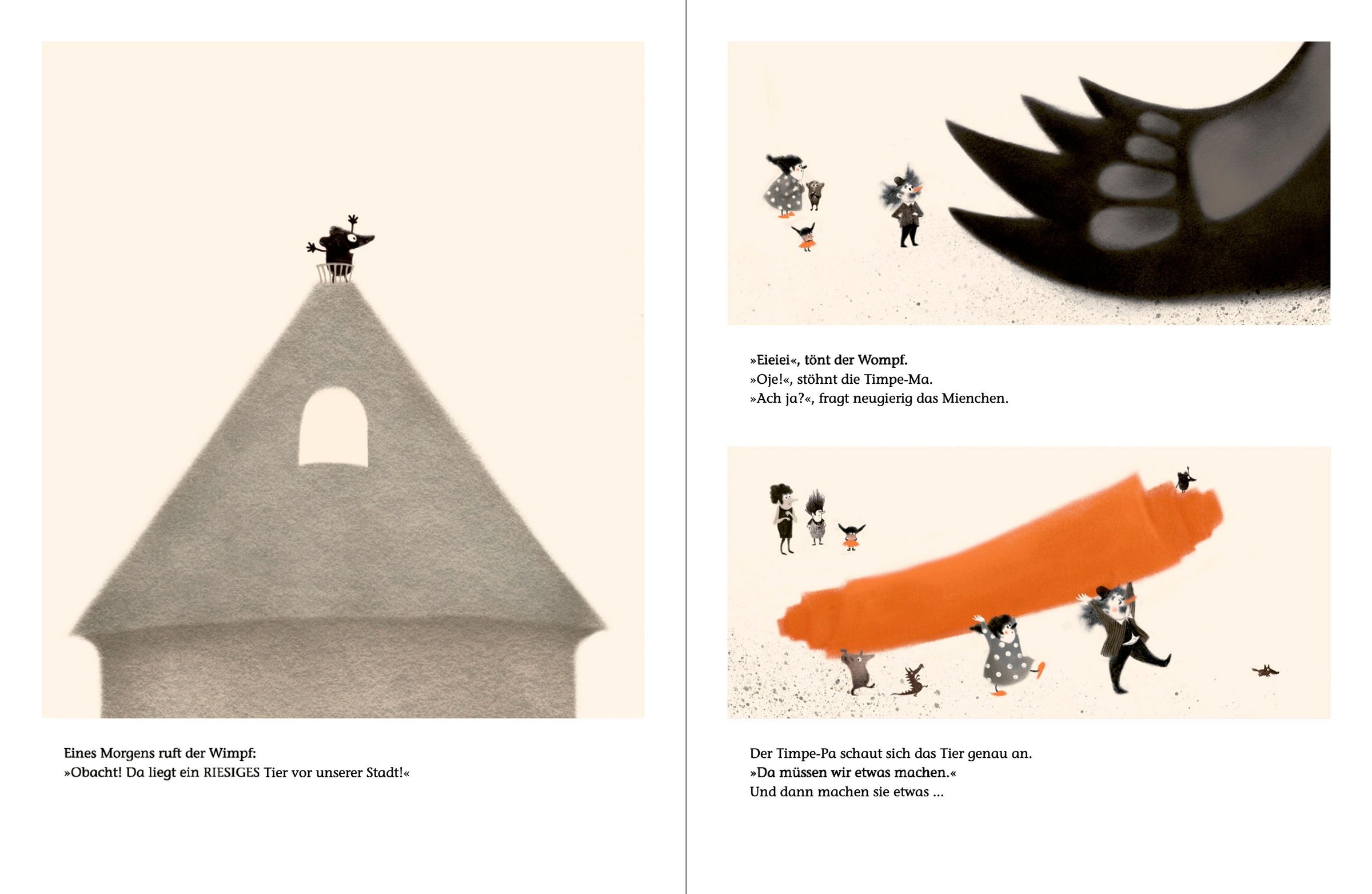 Oh nein, vor der Stadt liegt ein riesiges Tier! Es versperrt den Weg. Eieiei, tönt der Wompf. Oje, stöhnt die Timpe-Ma. Da muss etwas gemacht werden! Und dann machen sie etwas. Sie decken das Tier zu, bauen eine Brücke drüber und eine Straße drum herum. Problem erkannt, Problem gebannt! Nur das Mienchen schüttelt den Kopf, ihm gefällt das gar nicht. Aber wer hört schon auf Mienchen? Da nimmt es sich ein Herz und spricht das Tier einfach an ...