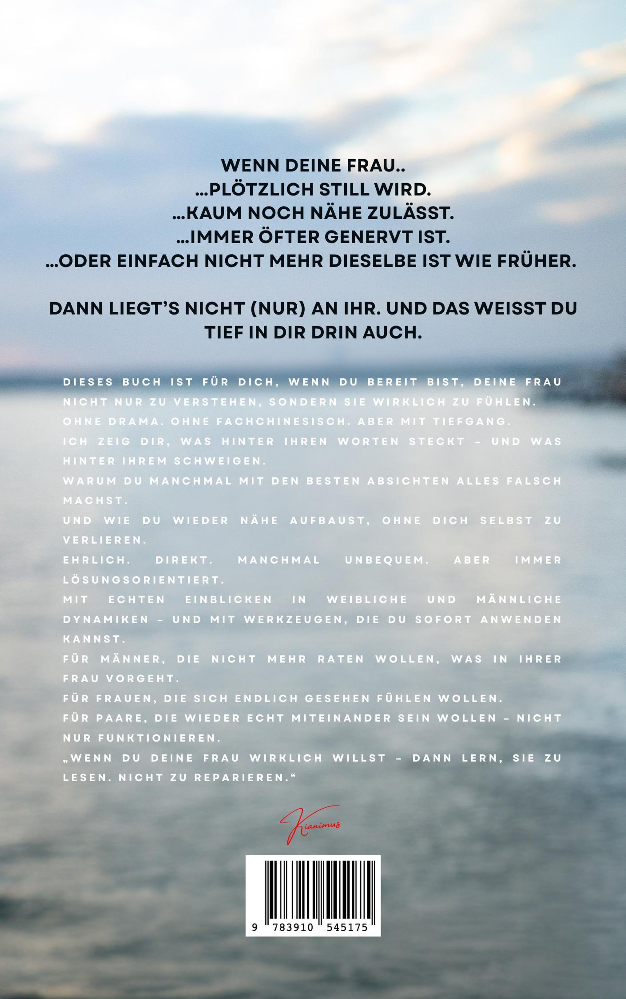 "Wenn deine Frau.." ist kein gewöhnlicher Beziehungsratgeber - es ist das mutigste Handbuch des 21. Jahrhunderts für Männer, die ihre Partnerin nicht nur verstehen, sondern wirklich erfühlen wollen. Viral auf Social Media mit über 30 Millionen Views gestartet, bringt Kianimus seine klaren, ehrlichen und humorvoll-provokanten Einsichten nun erstmals gebündelt in Buchform - schonungslos direkt, psychologisch fundiert und tief berührend.