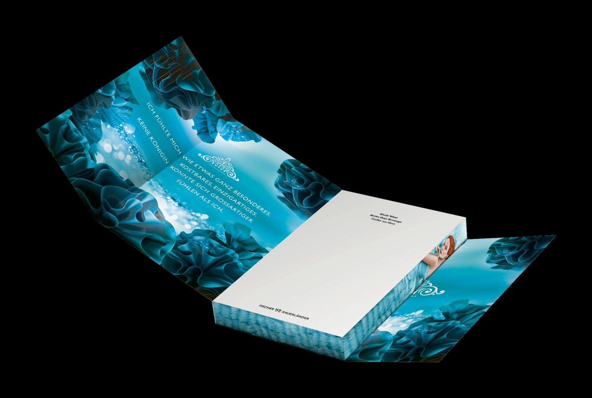 „35 Mädchen. Eine Krone. Die Chance ihres Lebens.“ Titel: „Selection“. Frau in blauem Kleid, fantasievoller Hintergrund., Buch