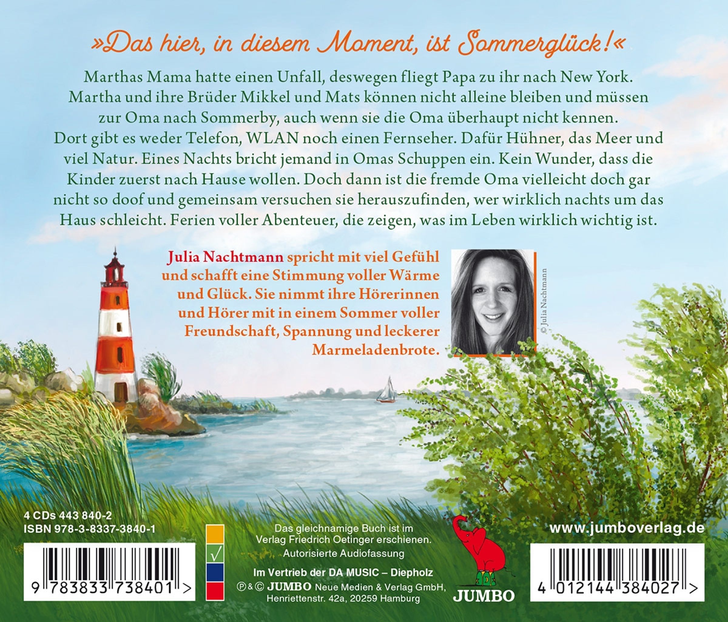 Marthas Mama hatte einen Unfall, deswegen fliegt Papa zu ihr nach New York. Martha, Mikkel und Mats können nicht alleine bleiben und müssen zu Oma nach Sommerby, auch wenn sie die Oma überhaupt nicht kennen. Dort gibt es weder Telefon, WLAN noch Fernseher. Dafür Hühner, das Meer und viel Natur. Eines Nachts bricht jemand in den Schuppen ein. Das gibt Ärger! Kein Wunder, dass die Kinder zuerst nach Hause wollen. Doch dann ist die fremde Oma vielleicht gar nicht so doof und gemeinsam versuchen sie herauszufinden, wer wirklich nachts um das Haus schleicht.