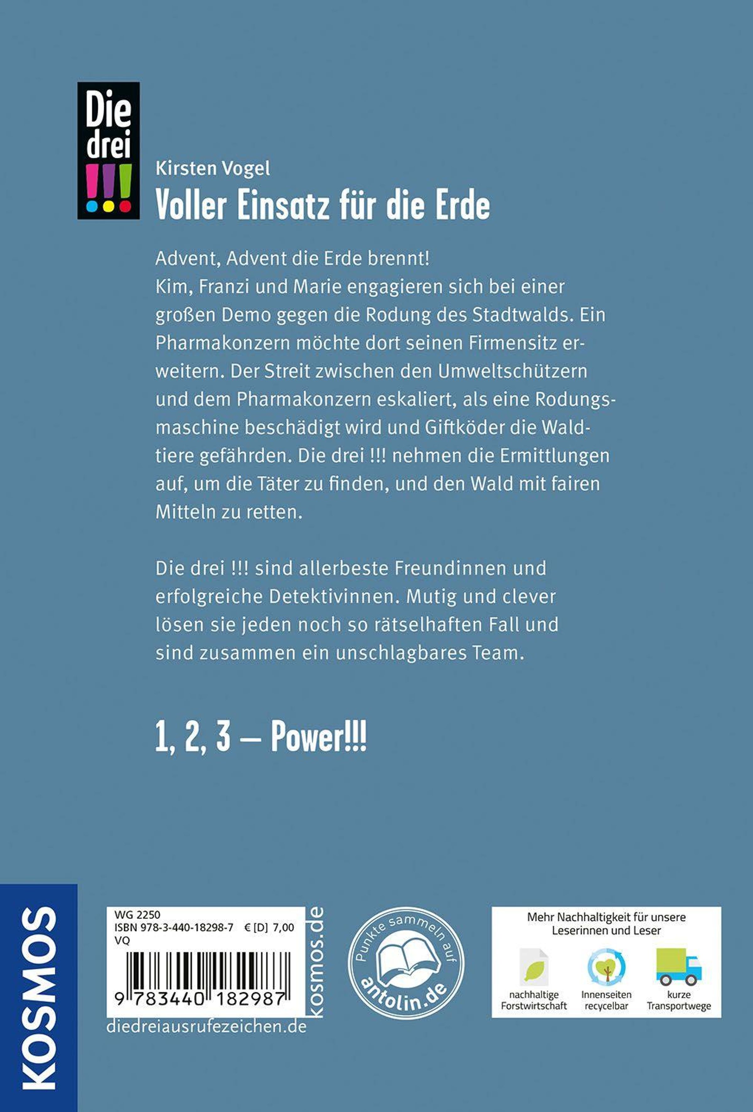 Im Stadtwald brodelt es: Kim, Franzi und Marie engagieren sich gemeinsam mit ihrer Klasse für den Klimaschutz und nehmen an einer Demonstration gegen die geplante Rodung des Stadtwalds teil. Doch die zunächst friedliche Aktion gerät plötzlich aus dem Gleichgewicht, als eine beschädigte Rodungsmaschine und ausgelegte Giftköder für Aufregung und Verunsicherung sorgen. Schnell wird den drei !!! klar, dass hier etwas nicht mit rechten Dingen zugeht - und sie wittern einen gezielten Sabotageakt. Doch wer will den Protest mit unfairen Mitteln stören? Und welches Motiv steckt dahinter?