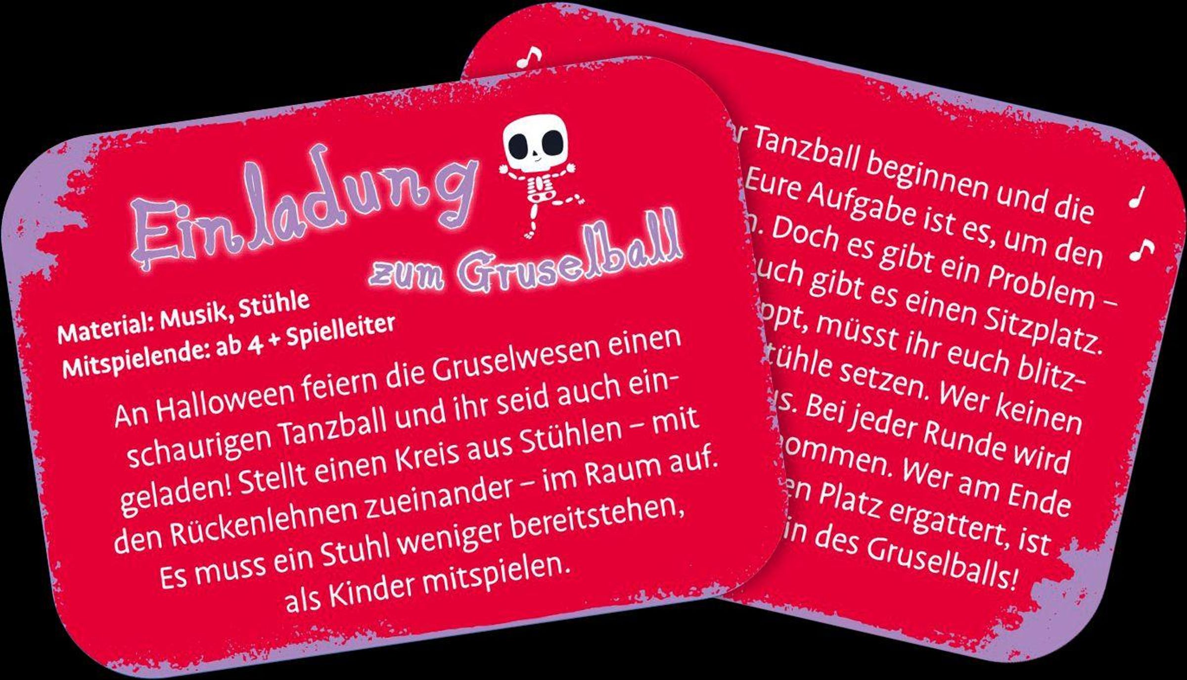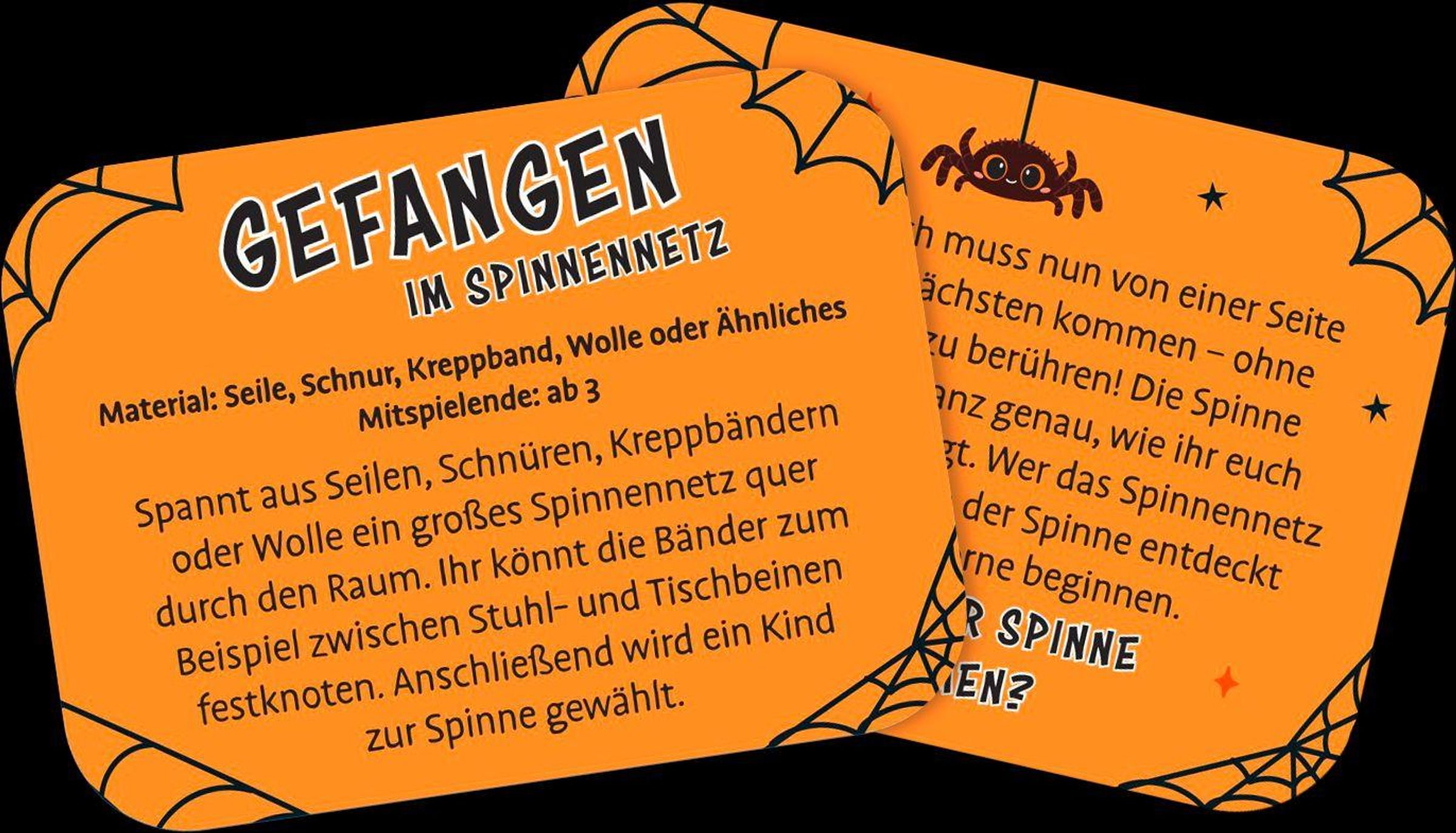 Egal ob schaurige Zaubertränke kosten, um die Wette Mumienwickeln oder den Mut finden, einen Schatz aus einem Eimer Glibber zu fischen: Diese Box garantiert Gänsehaut und Gelächter. Die praktische und stabile Metalldose liefert 25 lustige Spielideen und kindgerechte Mutproben für Kinder ab 6 Jahren. Mal für kleinere, mal für größere Gruppen ausgelegt, sorgen die Spiele für schaurig-schönen Spaß beim Gruselfest mit der Familie oder der Halloweenparty mit Freundinnen und Freunden.