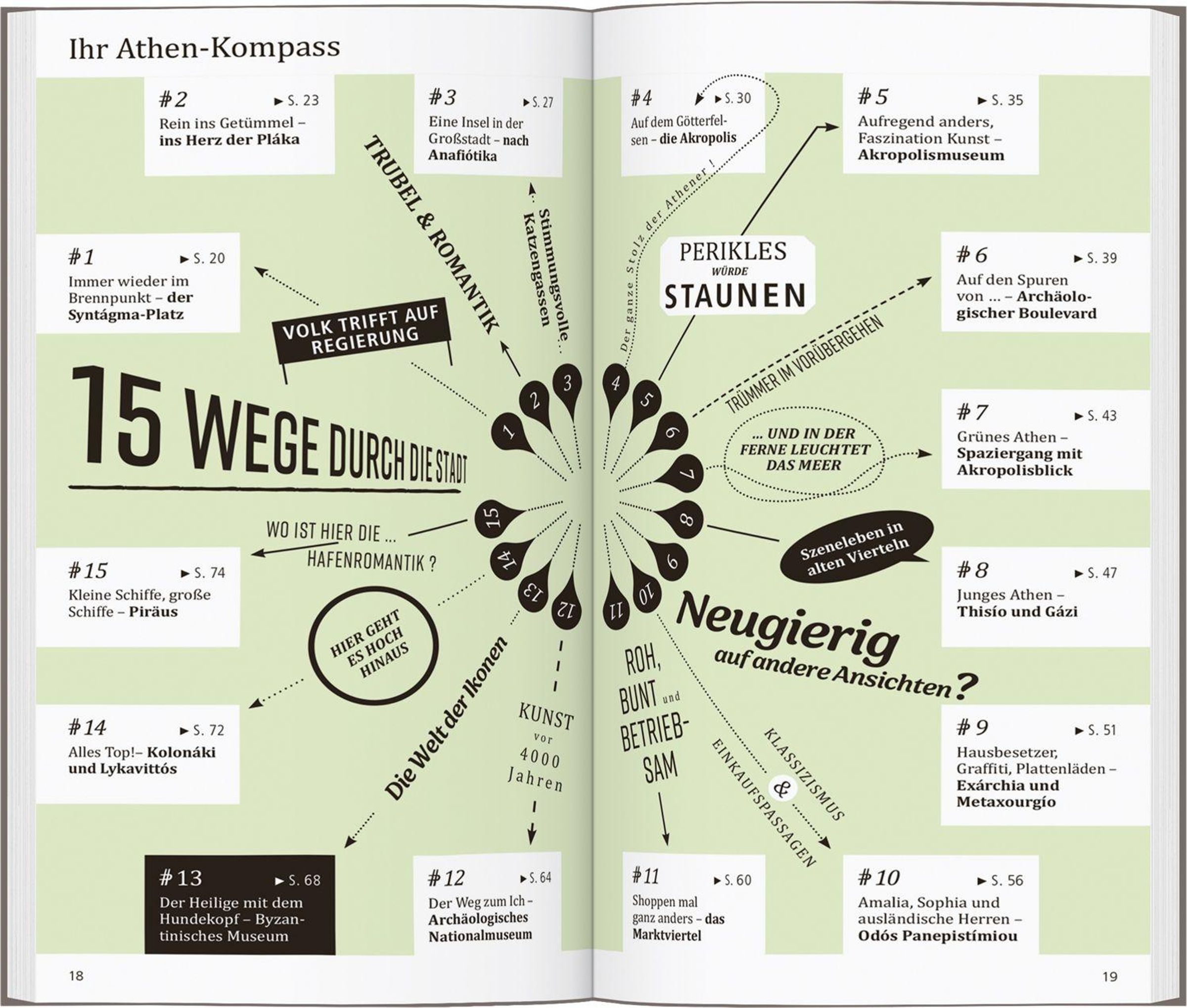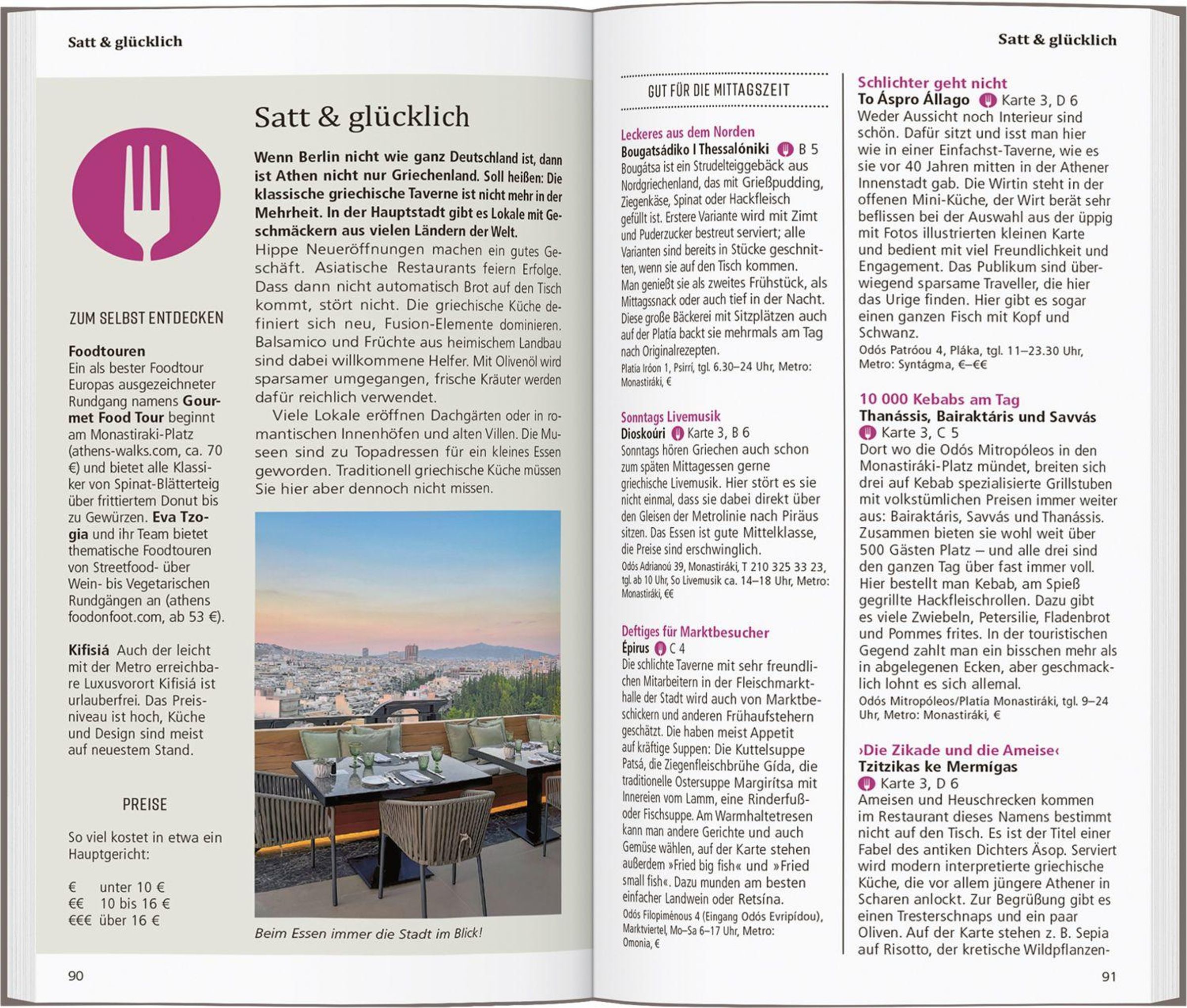 In eigenen Kapiteln erfahren Sie, wo es sich in fremden Betten gut schläft, wo Sie glücklich satt werden, wohin die Athener zum Stöbern und Entdecken gehen und wohin es sie zieht, wenn die Nacht beginnt.