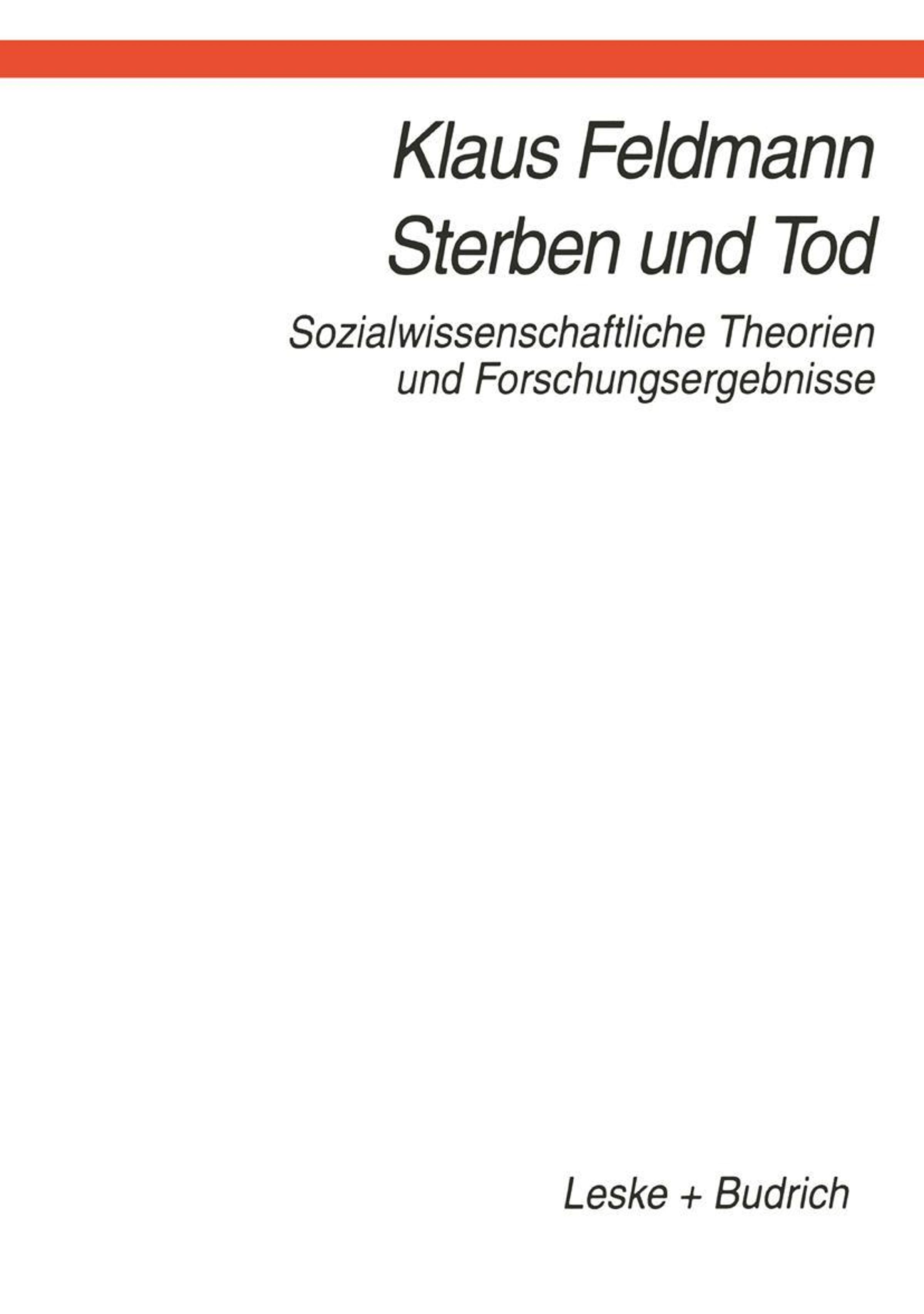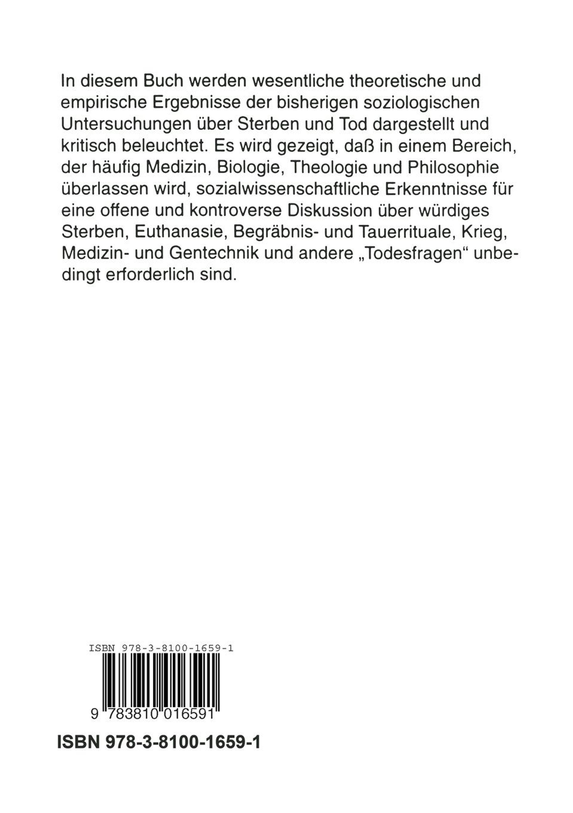 Theoretische Grundlagen.- Strukturierende Überlegungen.- Anthropologische Ansätze.- Der Tod in interkultureller Perspektive.- Der Tod im sozialen Wandel.- Wandel der sozialen Ordnung durch den Tod.- Wandel der Todes Vorstellungen und -riten im Abendland.- Begräbnisrituale im sozialen Wandel.- Verneinung und Verdrängung des Todes.- Individualisierung, psychisches Leben und Sterben.- Mortalität in Industriegesellschaften.- Geschlechtsspezifische Unterschiede der Mortalität.- Mortalität und soziale Schicht.- Der Tod in Institutionen und Organisationen.- Familie und Primärgruppen.- Moderne Familienstrukturen.- Trauer und Institution.- Trauer der Eltern beim Verlust eines Kindes.- Medizin.- Soziologie des Körpers.- Sterben im Krankenhaus.- Hospiz.- Massenmedien.- Formen des Sterbens.- Der natürliche und der gewaltsame Tod.- Der gewaltsame Tod.- Der natürliche Tod.- Das soziale Sterben.- Soziales Weiterleben und Unsterblichkeit.- Das gute Sterben.- Euthanasie.- Der allgemeine Tod: Krieg und andere Formen.- Gesellschaftsformung im Zeitalter nuklearer Vernichtungspotentiale.- Der Tod von Kulturen, Kollektiven und sozialen Gebilden.- Genozid.- Exkurs: Ökozid.- Ausblick: Die Zukunft von Sterben und Tod.