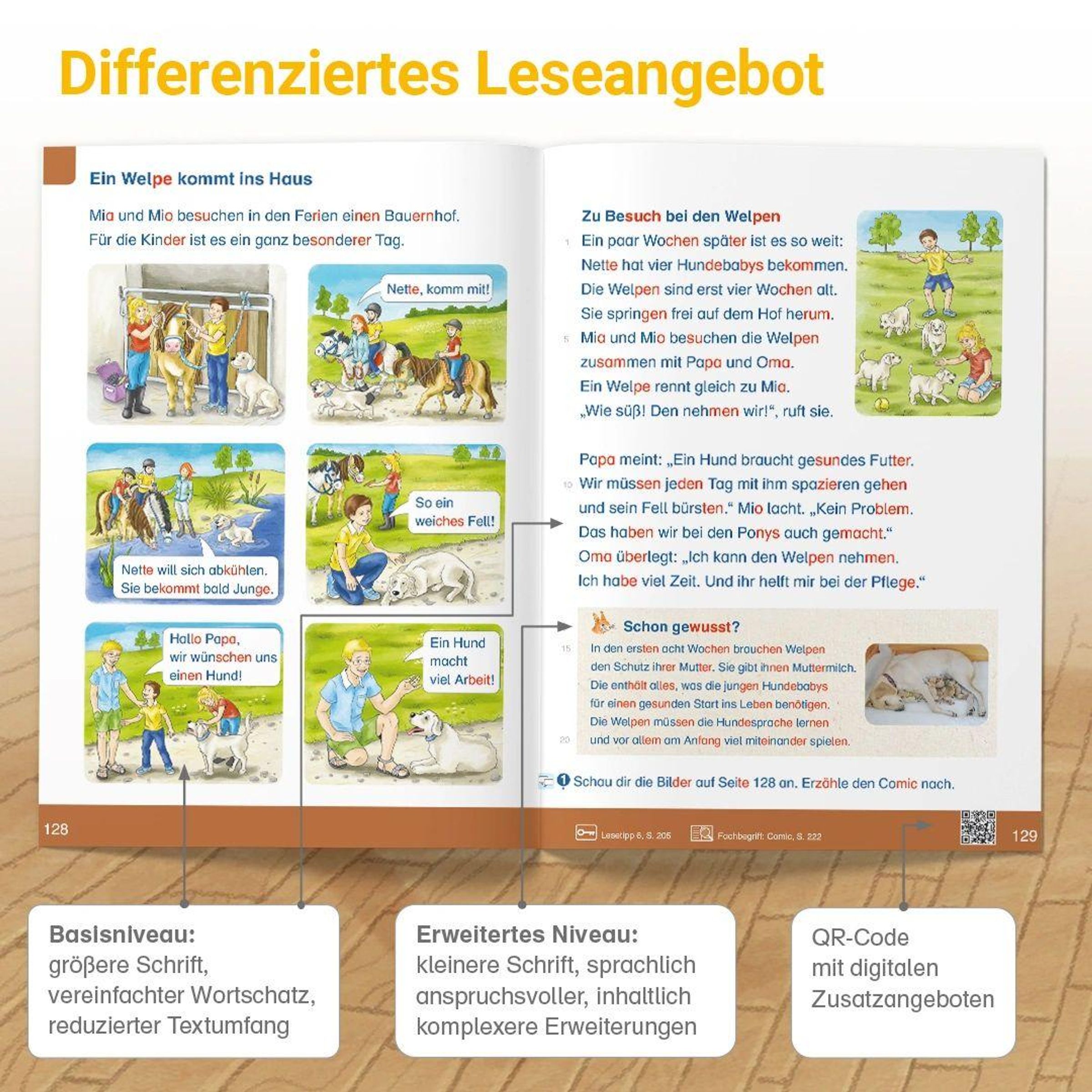 Hilfreiche Extras für das Üben grundlegender Lesekompetenzen: 2-fach differenziertes Lesen mit vorgeschaltetem Wörtertraining sowie optionale Vertiefungsseiten mit Übungen zum genauen und sinnerfassenden Lesen - passend zum jeweiligen Themenkapitel.