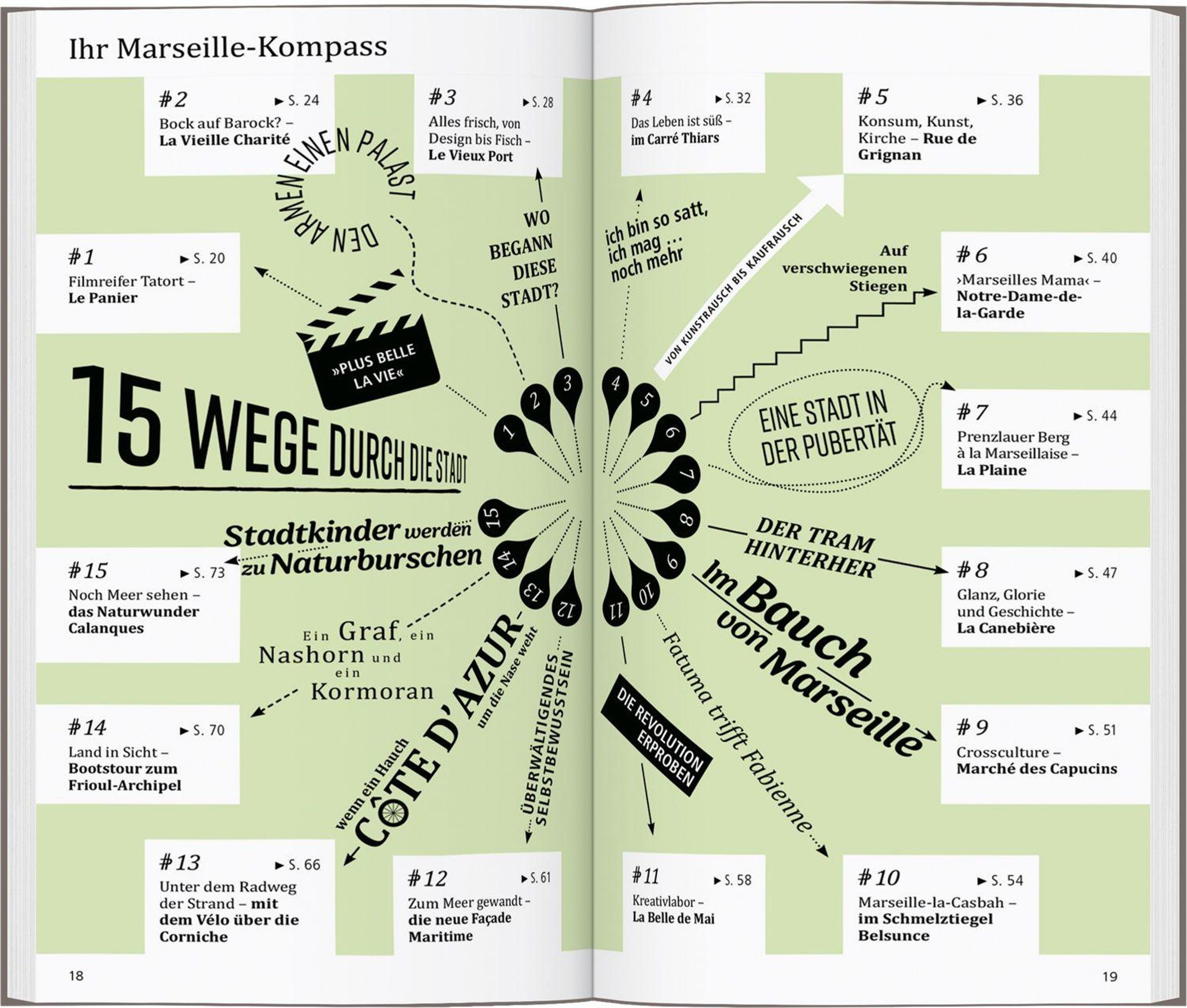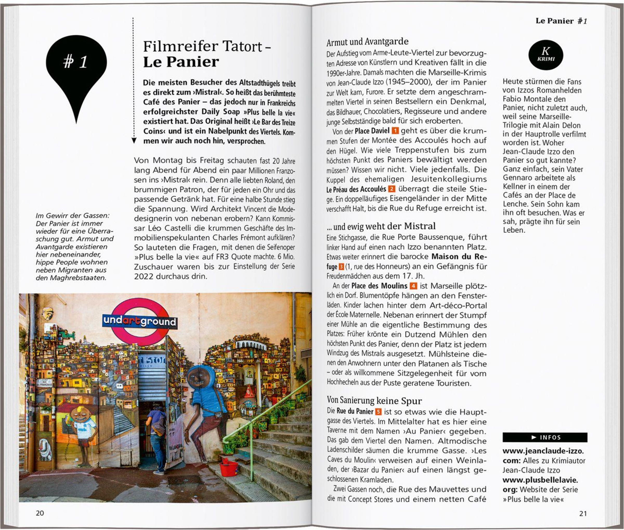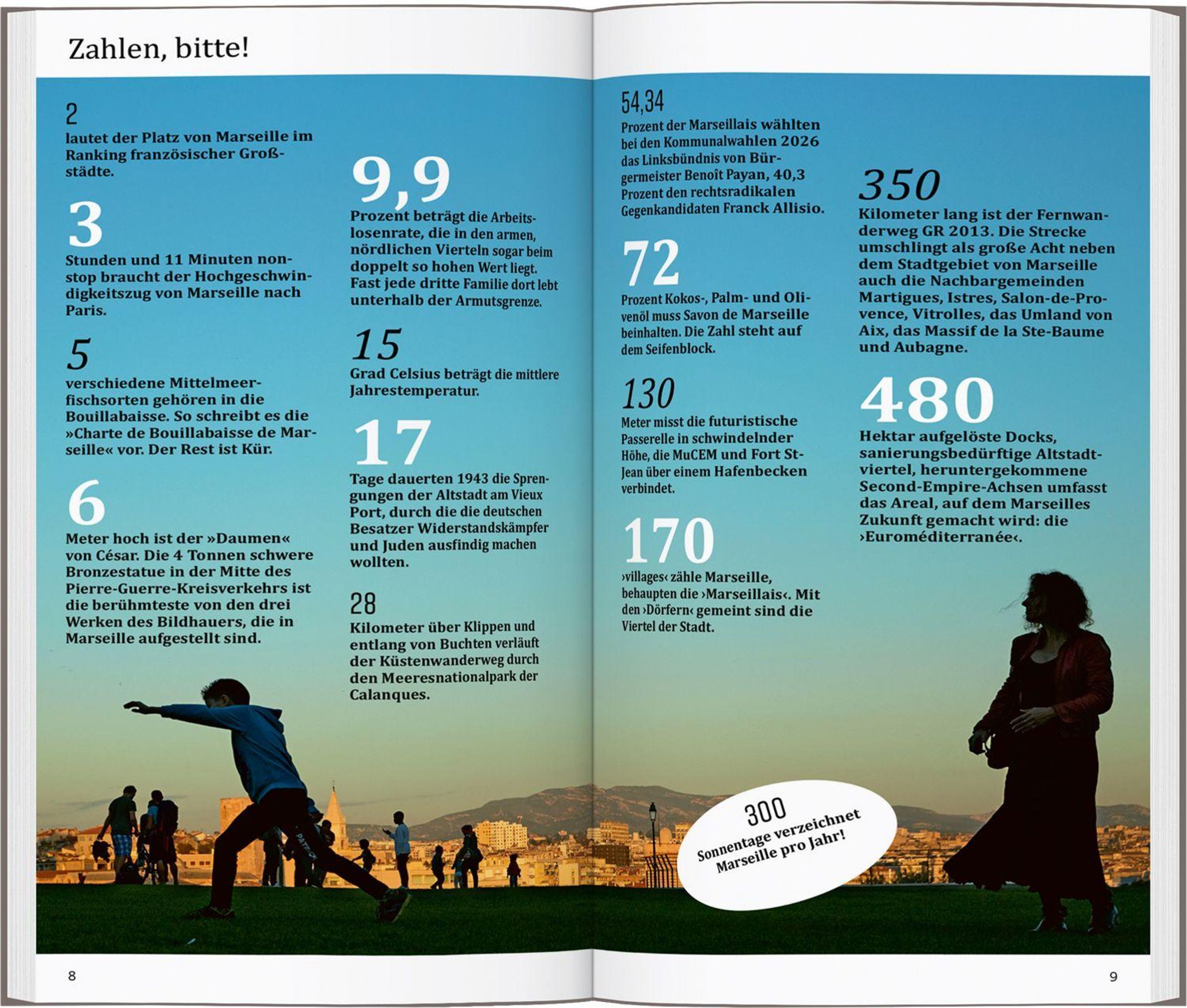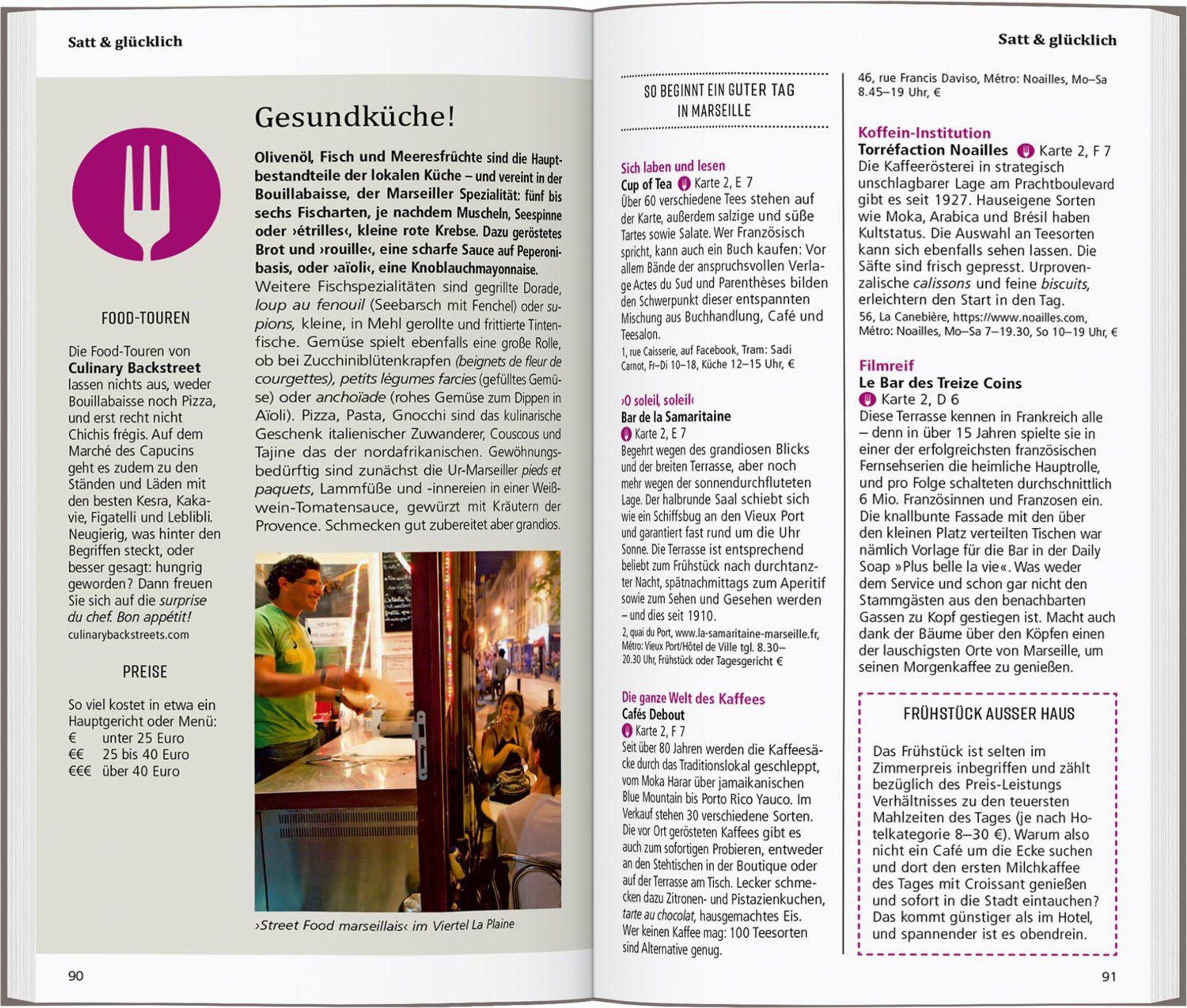 In eigenen Kapiteln erfahren Sie, wo es sich in fremden Betten gut schläft, wo Sie glücklich satt werden, wohin die Marseillais in ihrer südfranzösischen Stadt zum Stöbern und Entdecken gehen und wohin es sie zieht, wenn die Nacht beginnt.