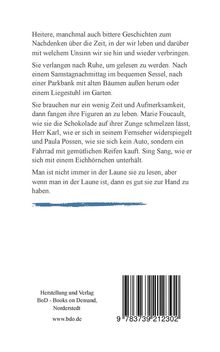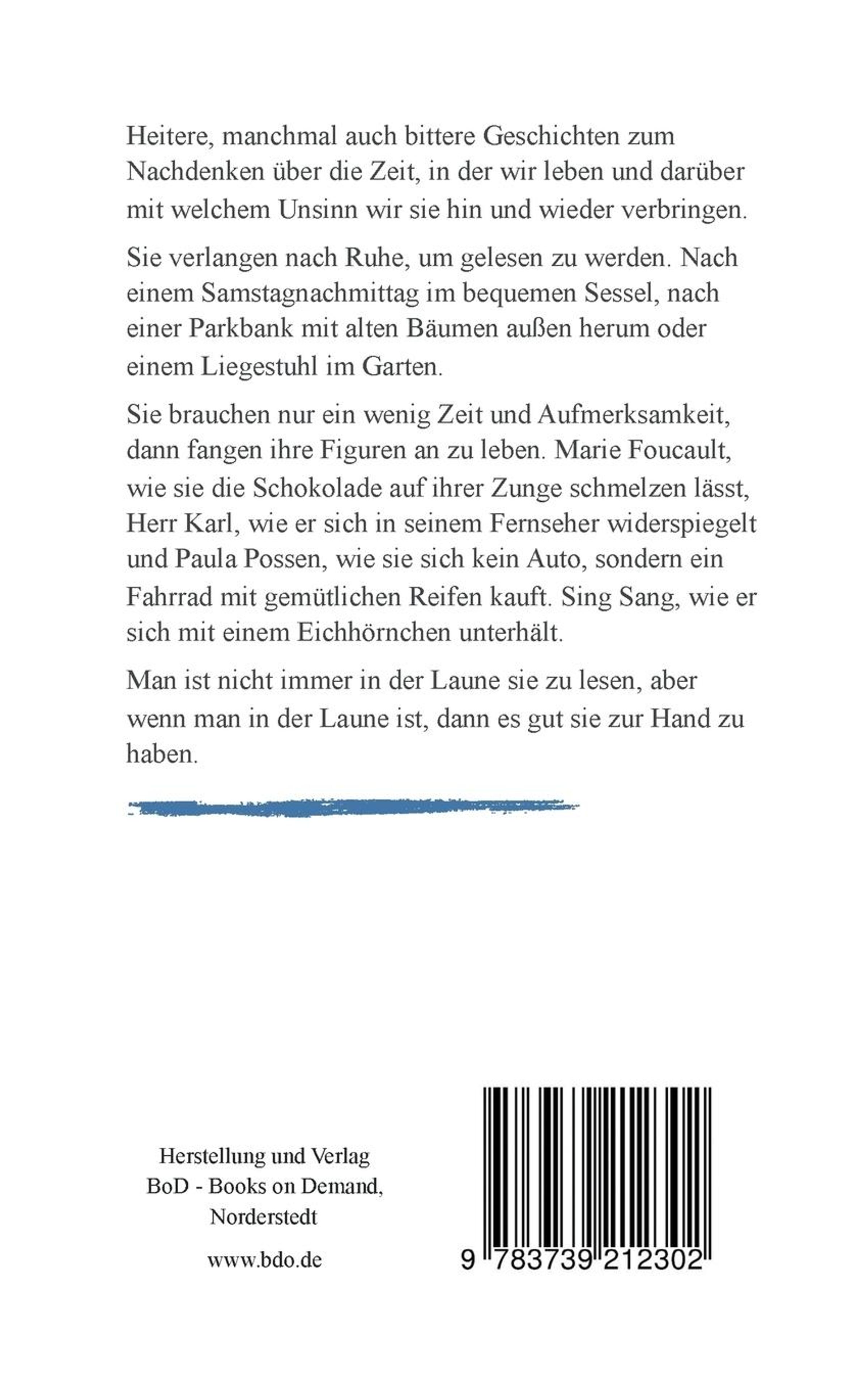 Heitere, manchmal auch bittere Geschichten zum Nachdenken über die Zeit, in der wir leben und darüber, mit welchem Unsinn wir sie hin und wieder verbringen. Sie verlangen nach Ruhe, um gelesen zu werden. Nach einem Samstagnachmittag im bequemen Sessel, nach einer Parkbank mit alten Bäumen außen herum oder einem Liegestuhl im Garten. Sie brauchen nur ein wenig Zeit und Aufmerksamkeit, dann fangen ihre Figuren an zu leben. Marie Foucault, wie sie die Schokolade auf ihrer Zunge schmelzen lässt, Herr Karl, wie er sich in seinem Fernseher widerspiegelt und Paula Possen, wie sie sich kein Auto, sondern ein Fahrrad mit gemütlichen Reifen kauft. Sing Sang, wie er sich mit einem Eichhörnchen unterhält.