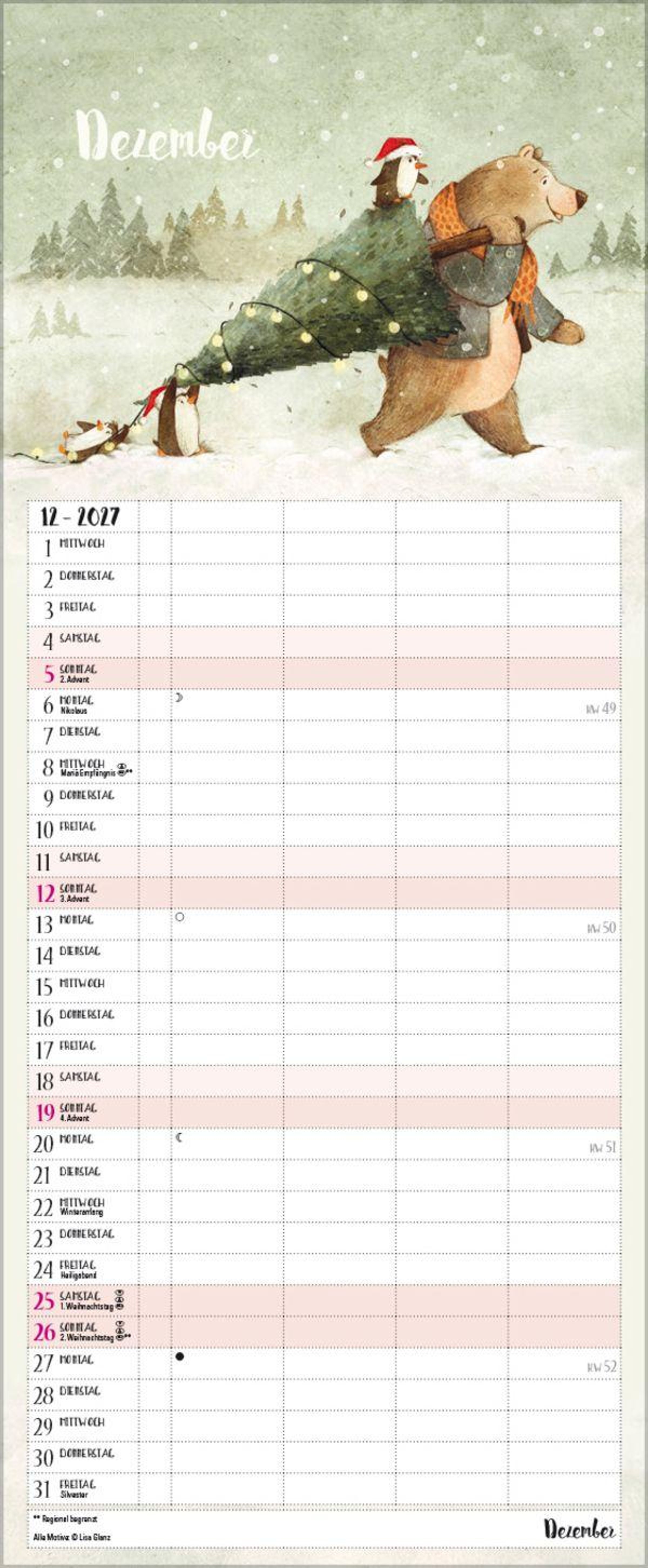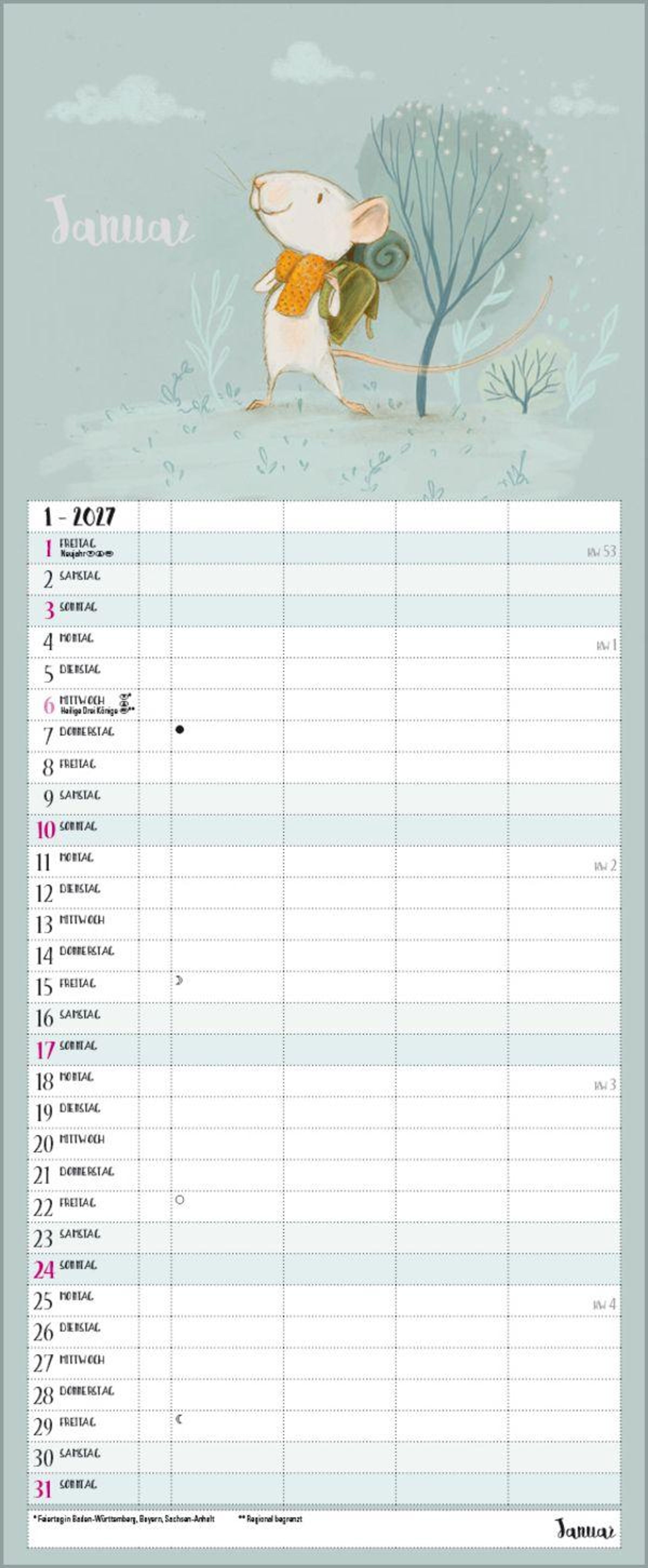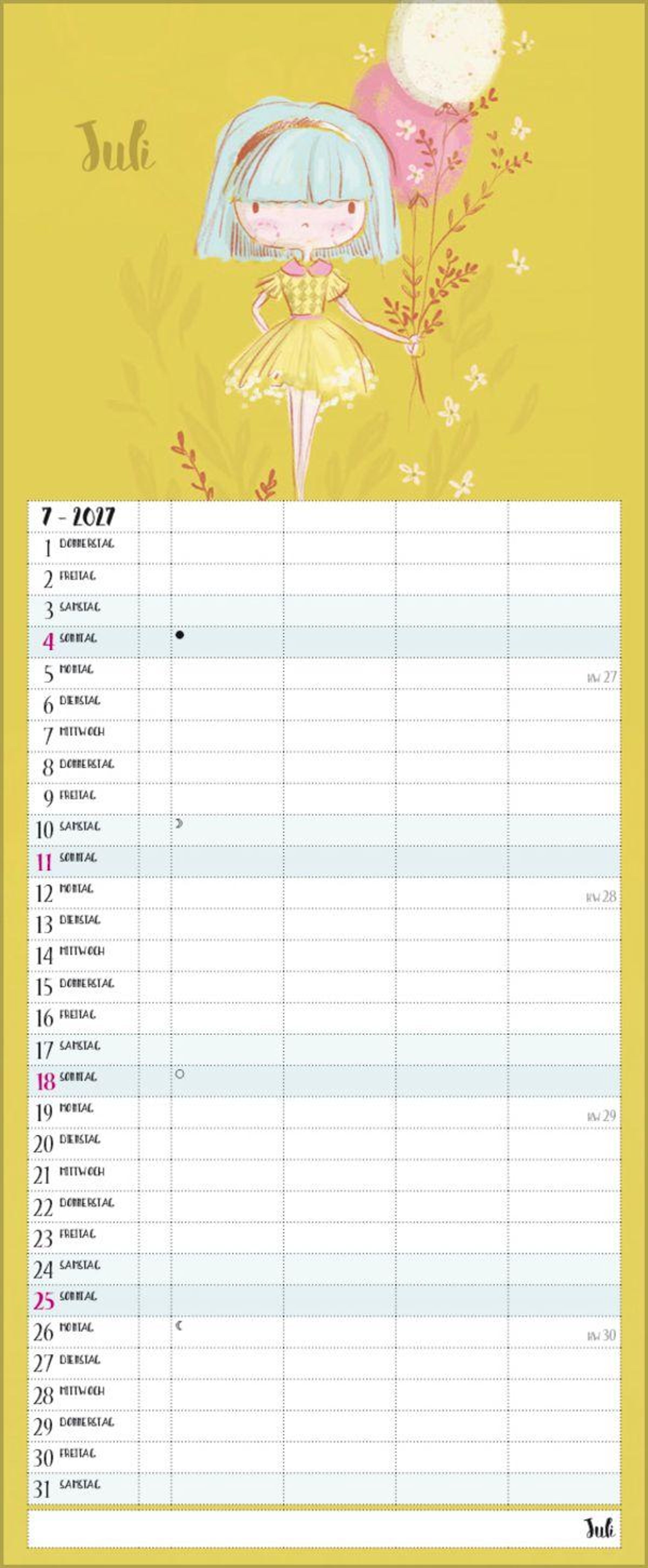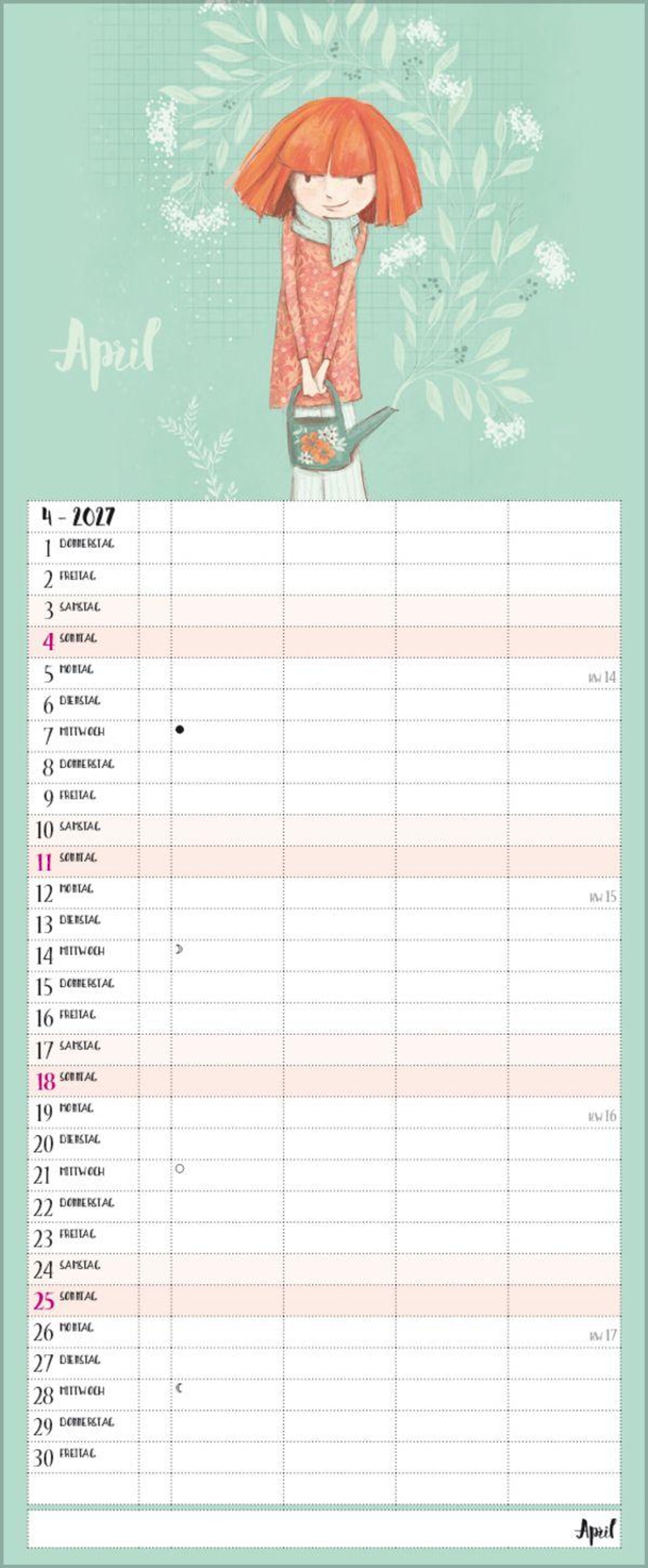 - Familienkalender mit 4 großen Spalten. Familientimer mit Ferienterminen, Müllspalte und Vorschau bis März 2027. Format: 19 x 46 cm.