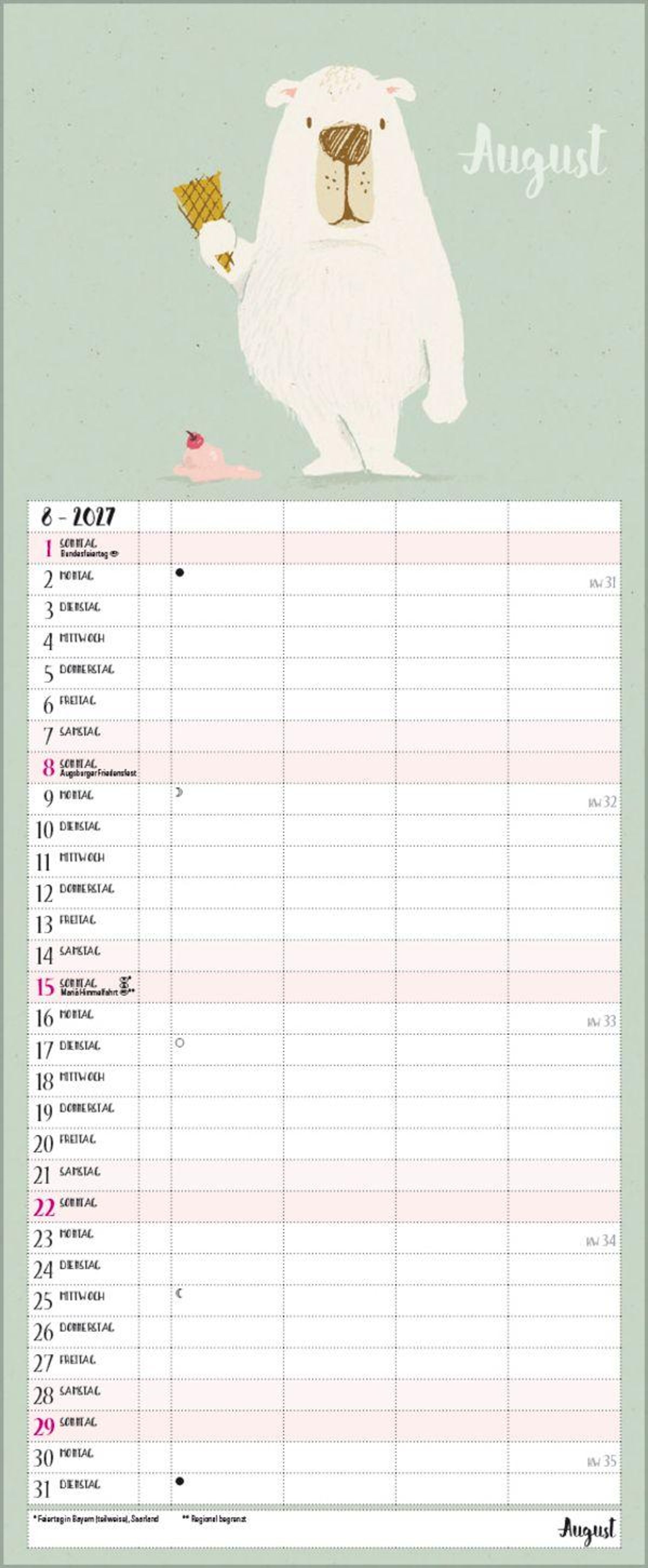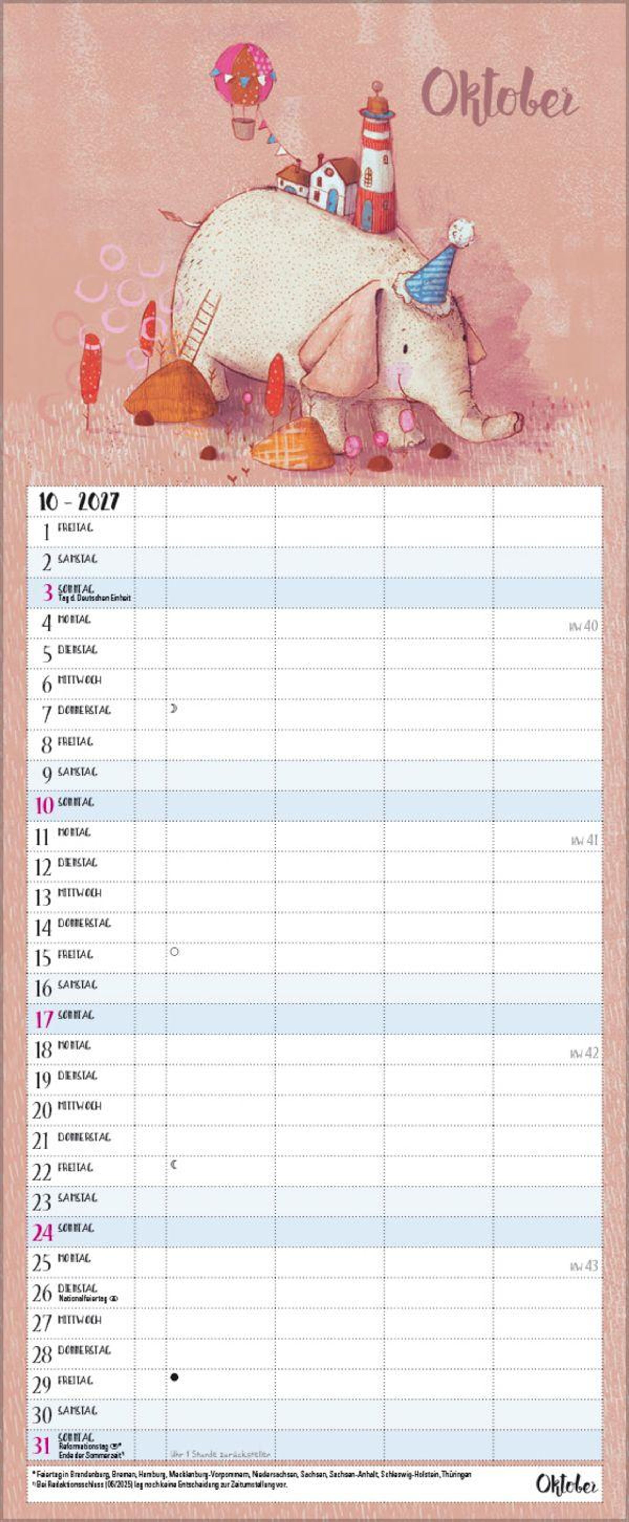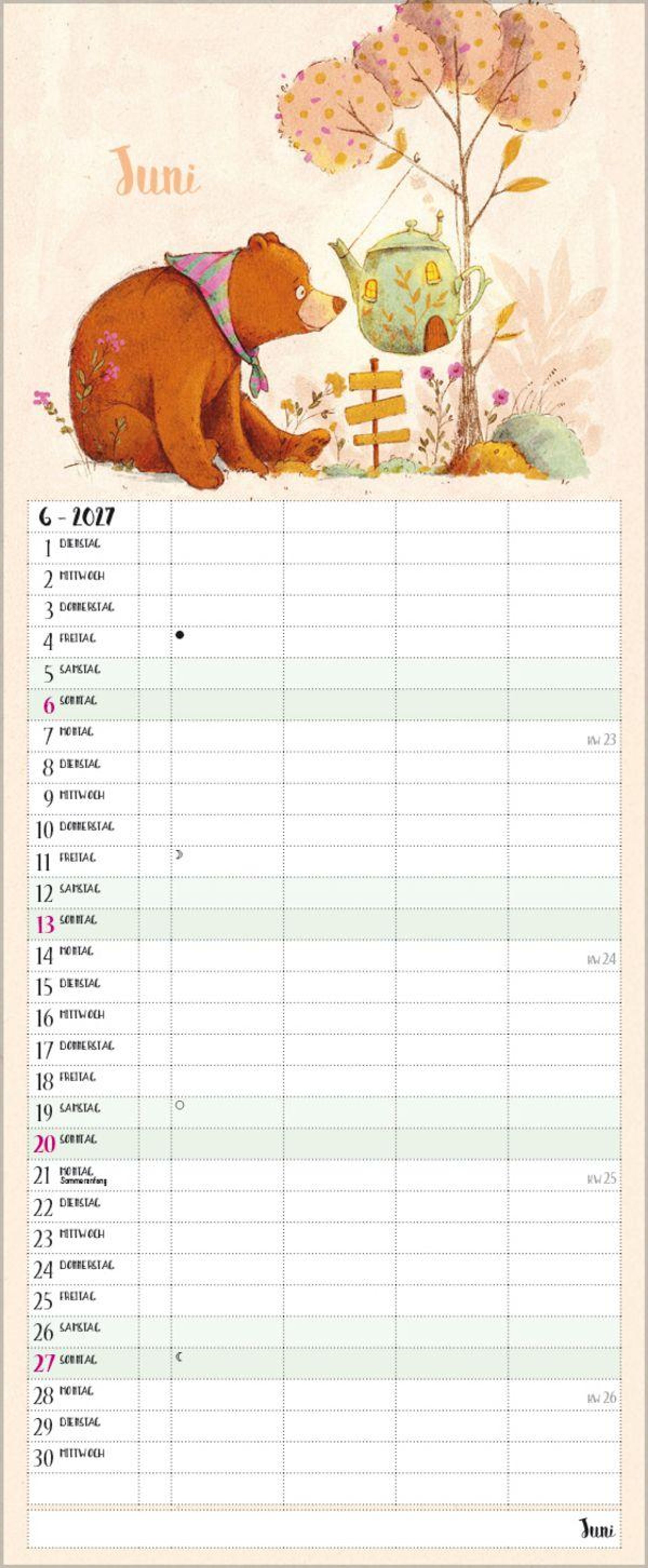 - Familienkalender mit 4 großen Spalten. Familientimer mit Ferienterminen, Müllspalte und Vorschau bis März 2027. Format: 19 x 46 cm.