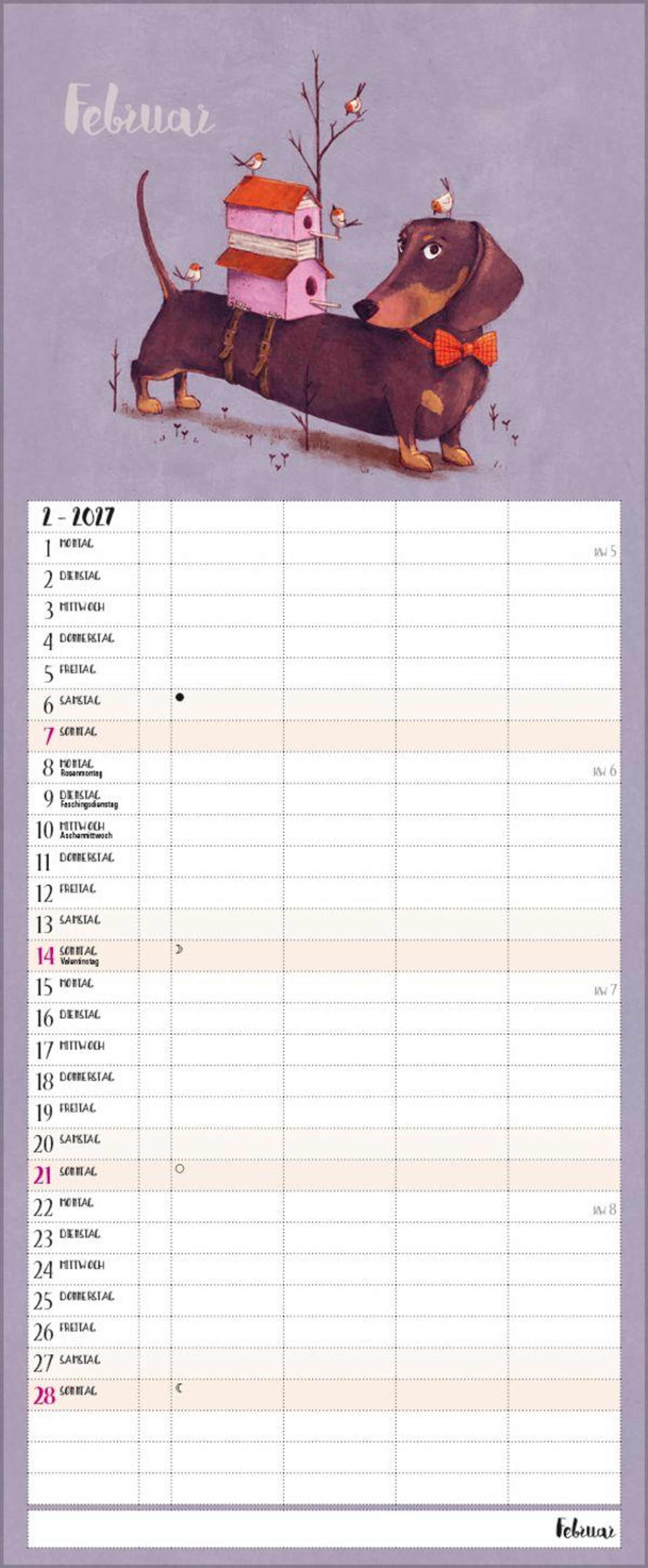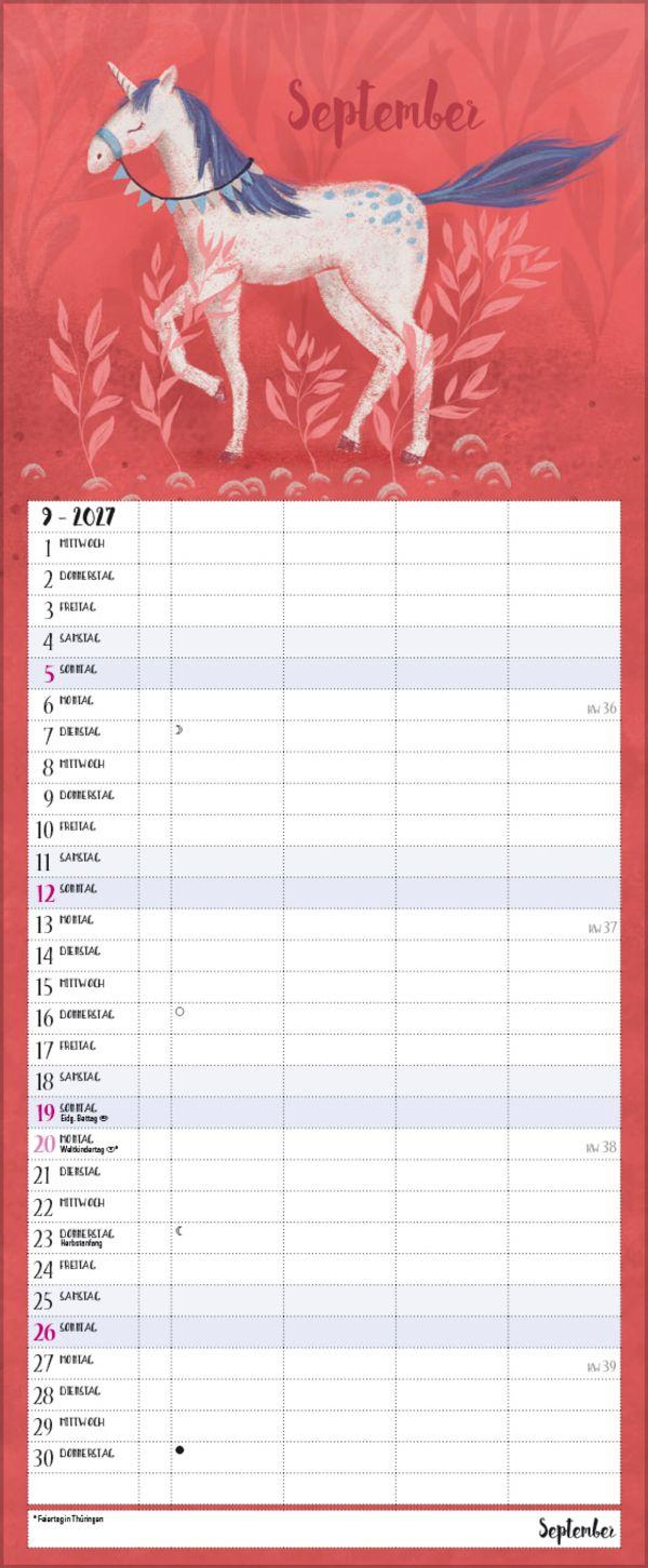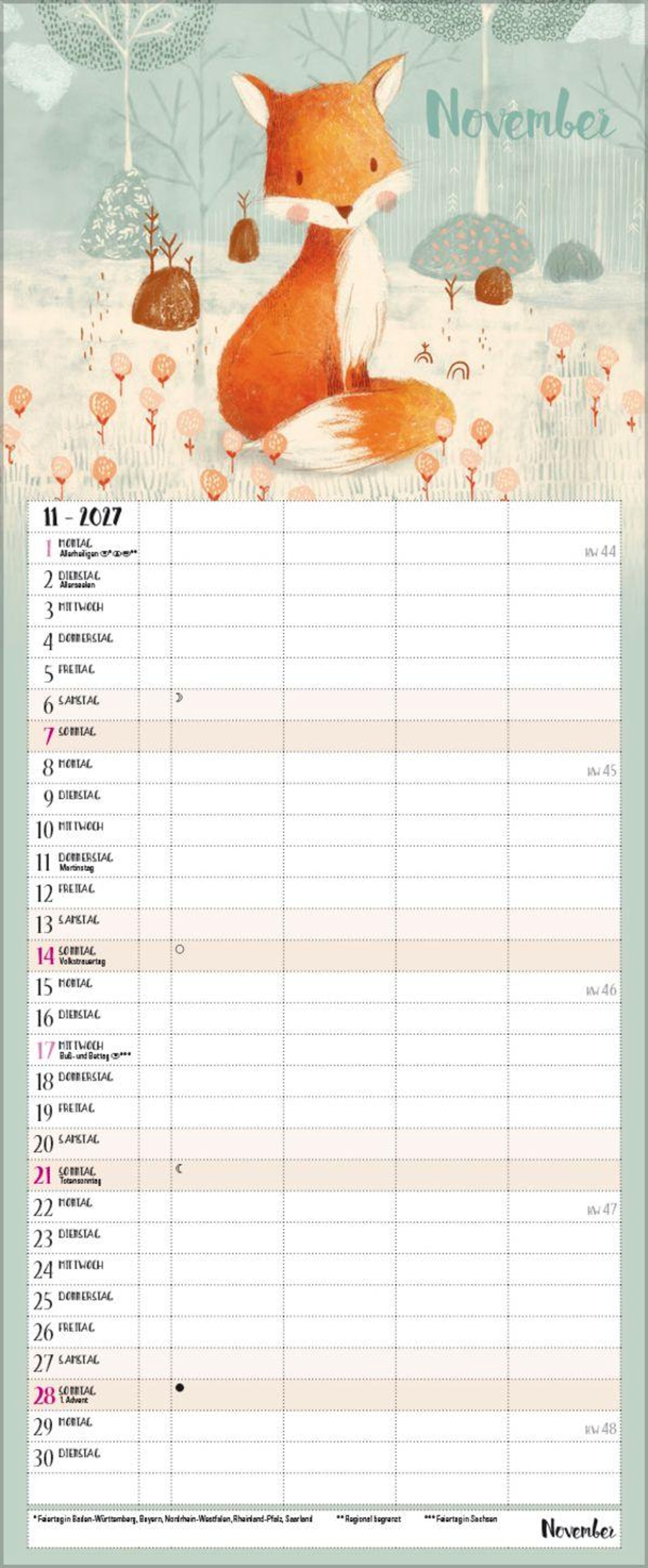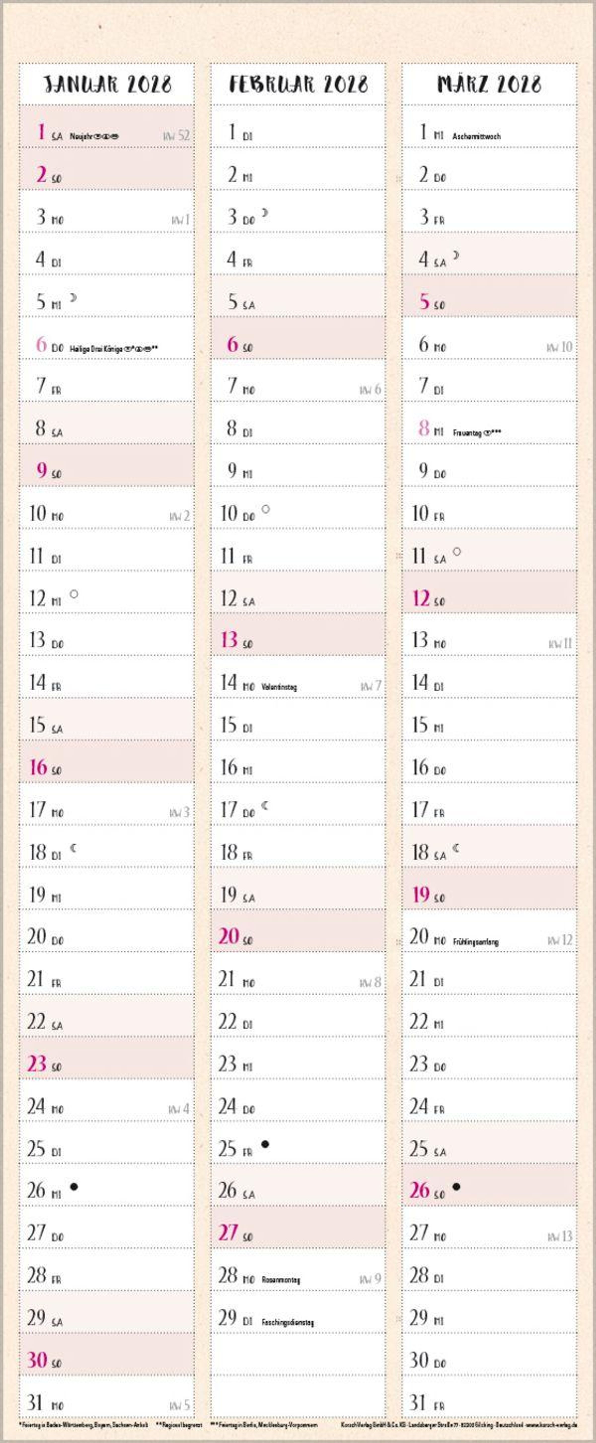 - Familienkalender mit 4 großen Spalten. Familientimer mit Ferienterminen, Müllspalte und Vorschau bis März 2027. Format: 19 x 46 cm.